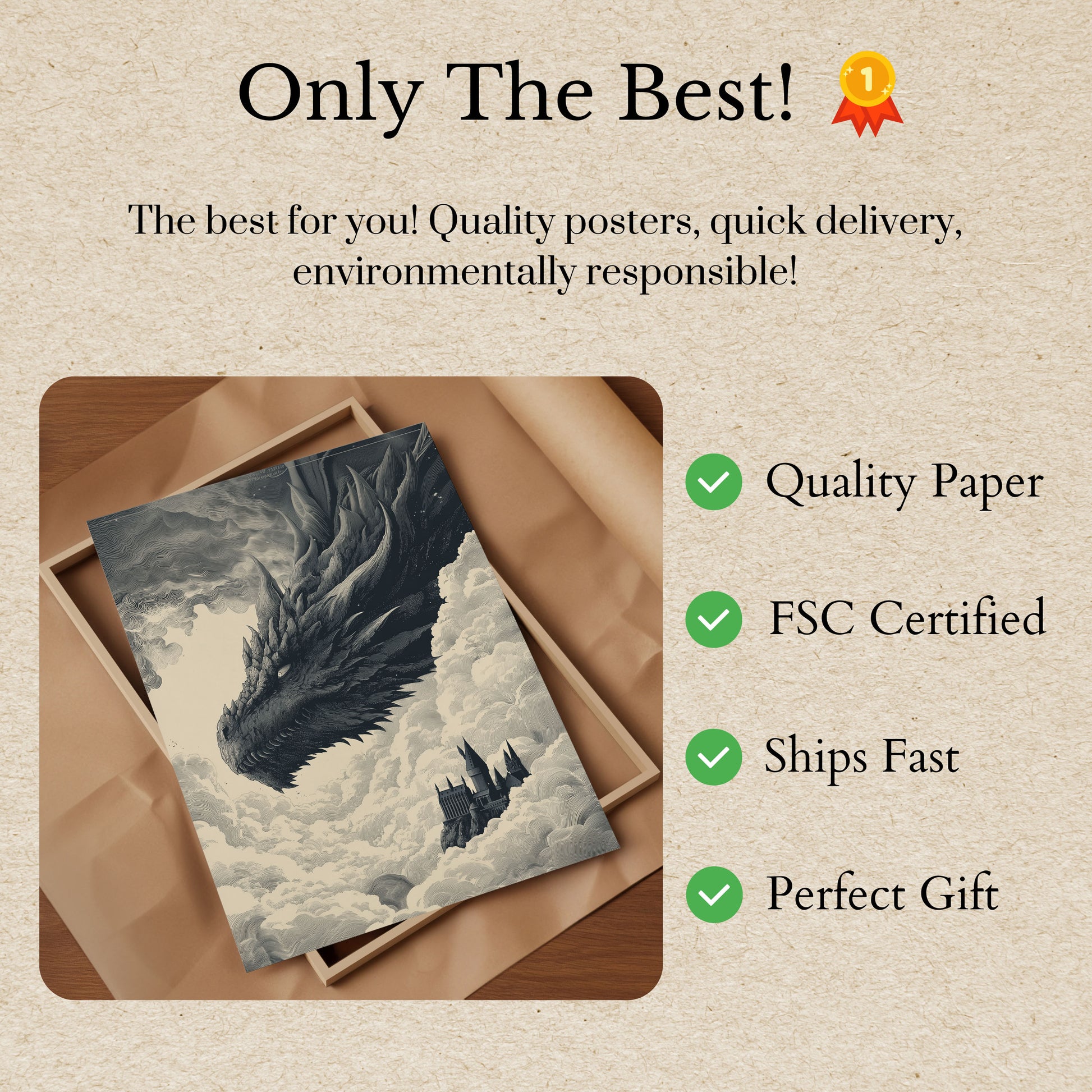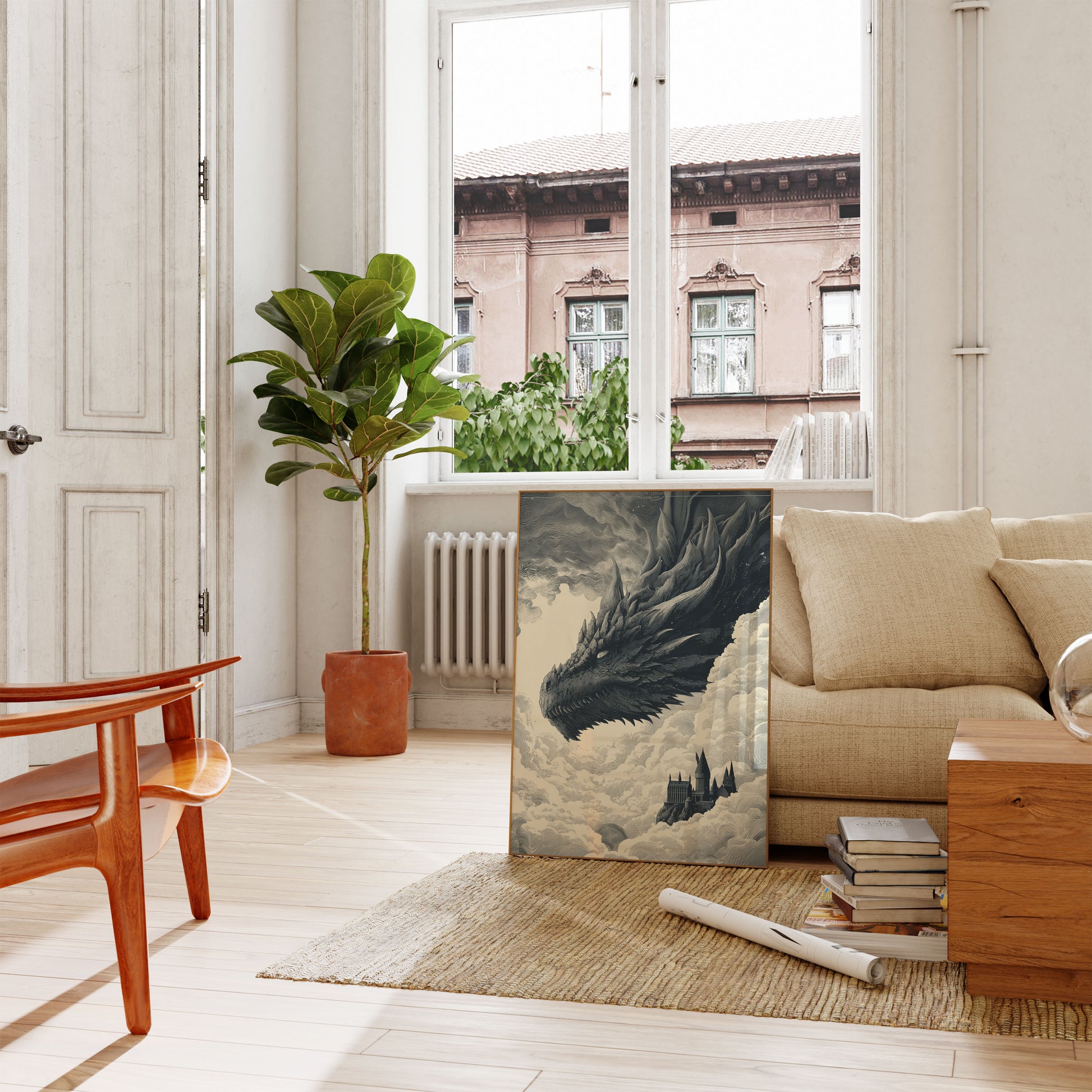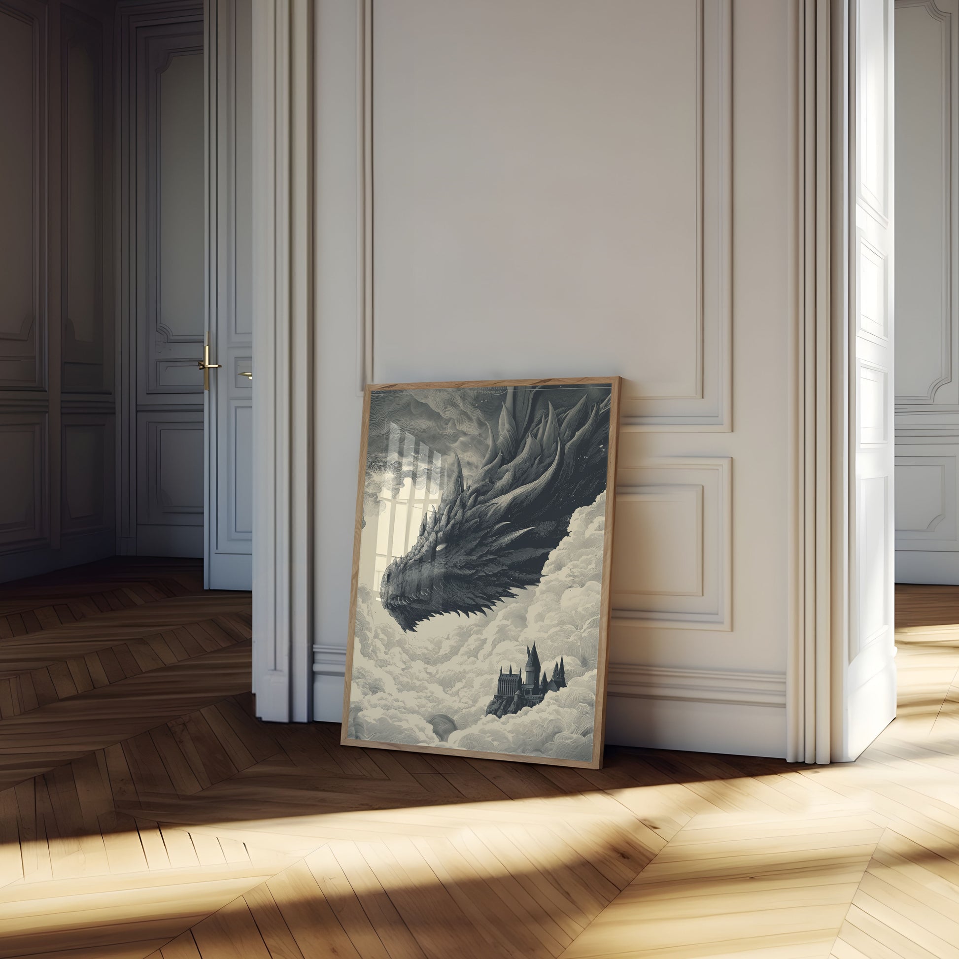 A mesmerizing monochromatic artwork captures a massive, intricate dragon soaring above the iconic Hogwarts castle, suspended in a dreamlike cloudscape. The detailed illustration blends fantasy and gothic elements, with the dragon's scaled form dominating the sky in shades of gray and black, creating an ethereal and dramatic scene that feels both powerful and mystical.