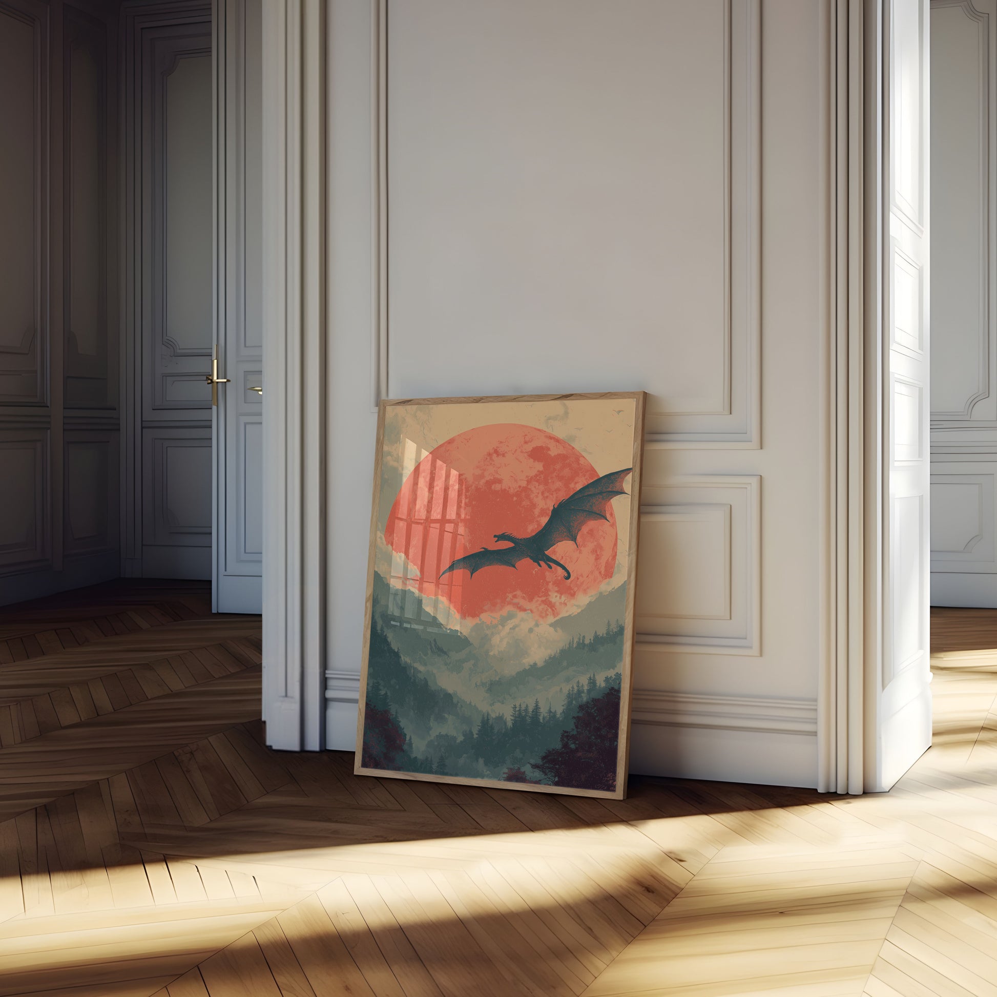 A breathtaking fantasy landscape where a majestic winged dragon soars against a massive, textured red sun. The creature glides dramatically over a misty, layered mountain range covered in dense pine forests, creating an atmosphere of mythical adventure and wild, untamed beauty. The rich coral and deep teal color palette evokes a sense of mysterious, ethereal wonder.