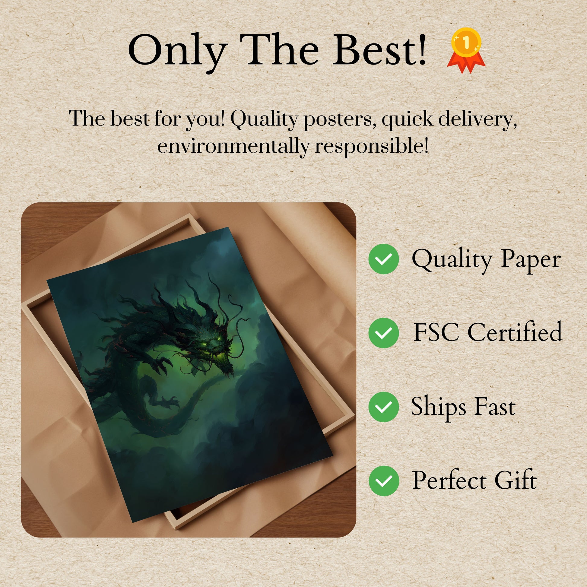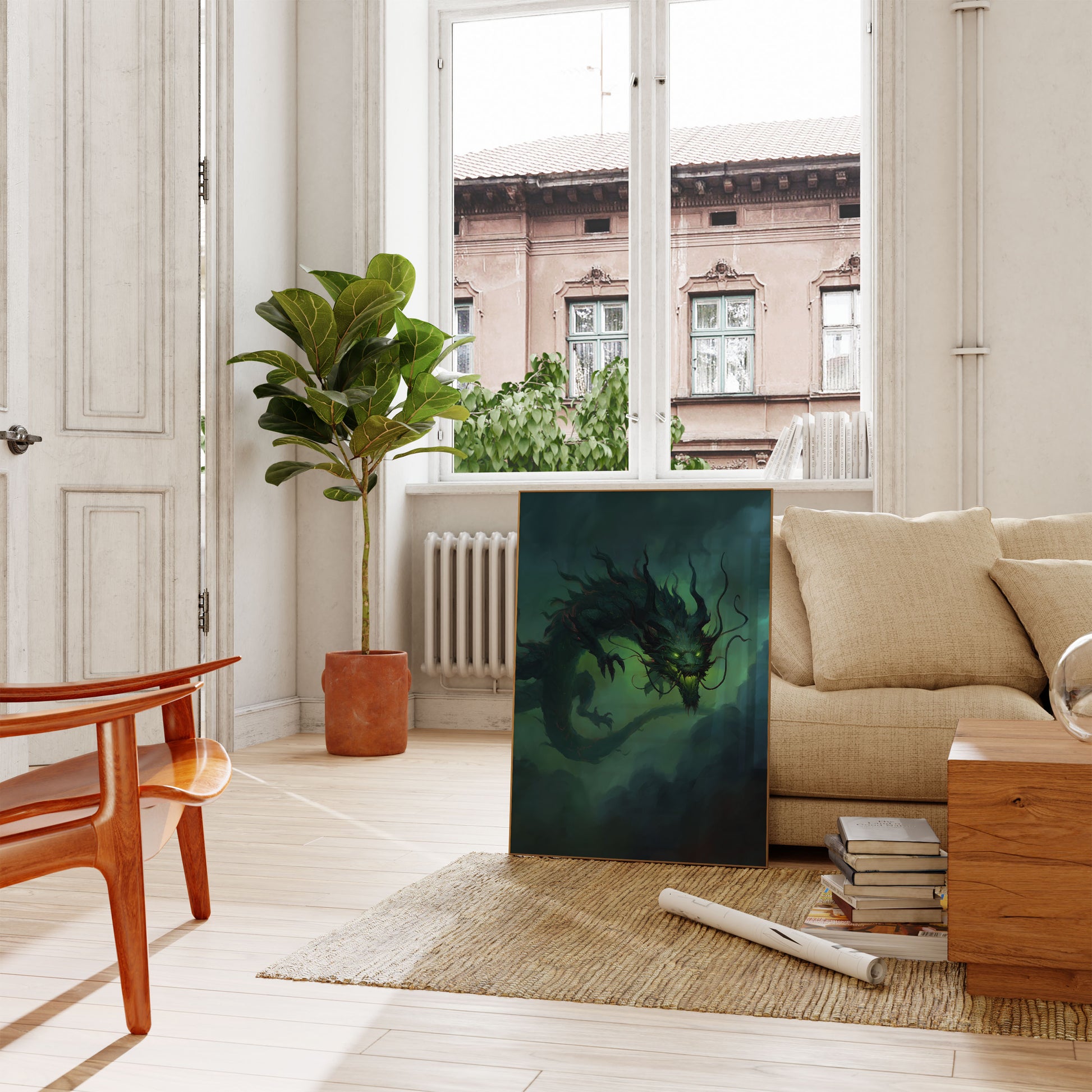 Dive into the haunting depths of this mesmerizing dragon artwork, where darkness and ethereal green energy collide in a breathtaking fantasyscape. The sinuous, shadowy creature emerges from swirling emerald mists, its piercing glowing eyes radiating an intense, supernatural presence that captures the imagination and sends chills down your spine.
