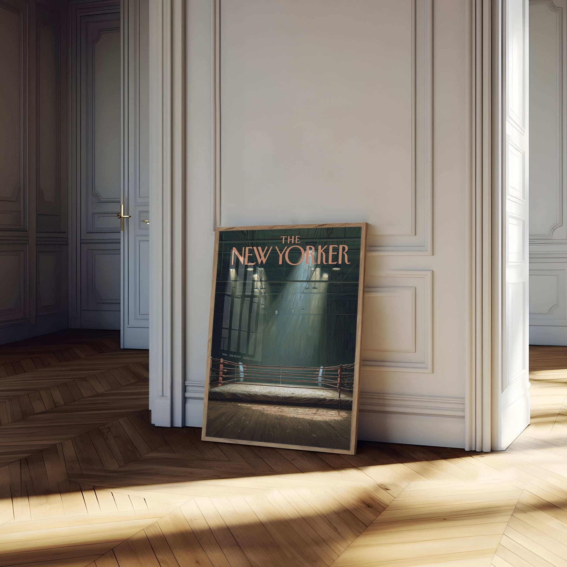 A haunting and atmospheric poster from The New Yorker captures an empty boxing ring bathed in dramatic overhead lighting. The wooden floor is scattered with subtle debris, while stark industrial lights create ethereal beams cutting through the dark, moody space. This evocative image represents anticipation, solitude, and the quiet moments before confrontation.