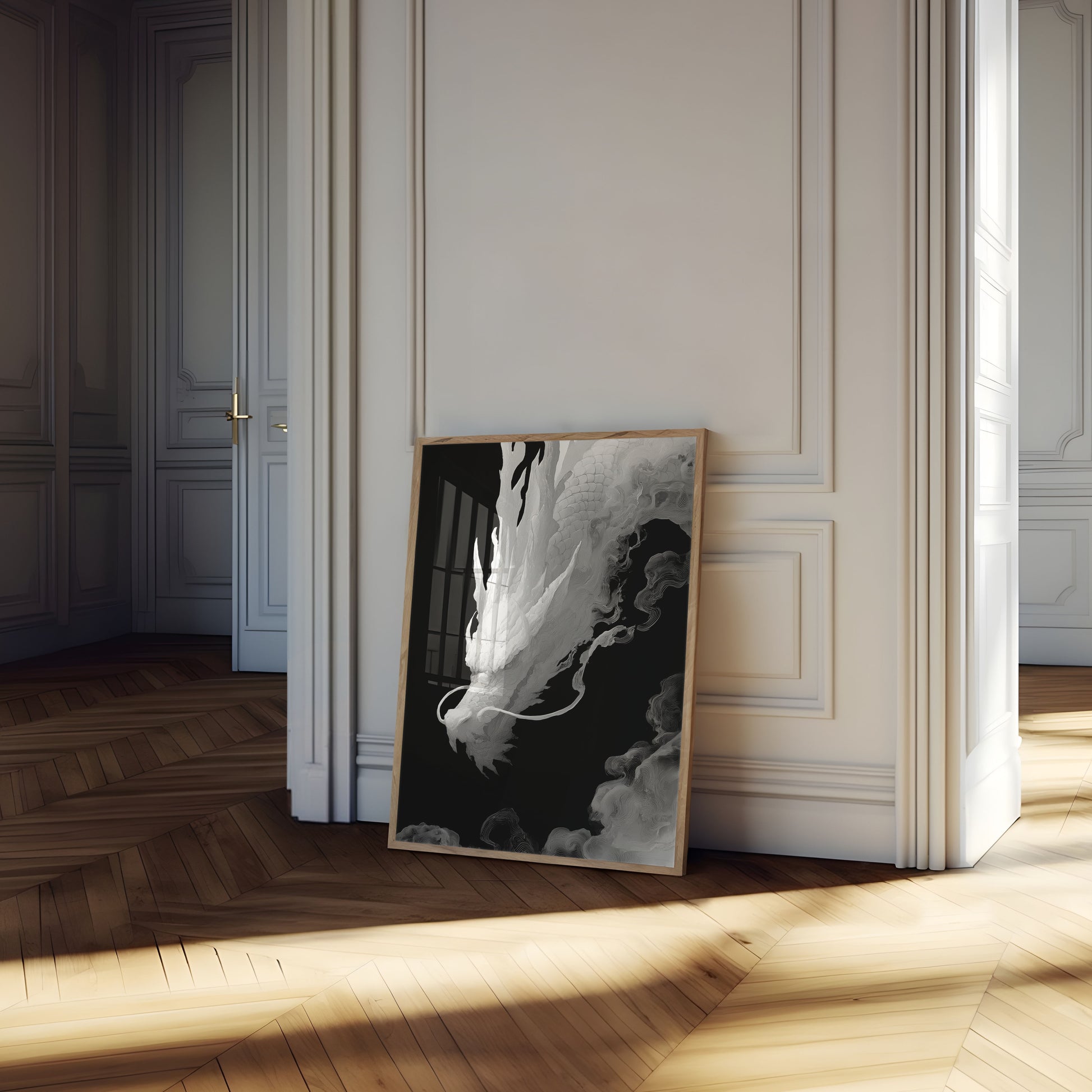 A mesmerizing monochromatic masterpiece captures an elegant dragon soaring through mystical clouds, rendered in exquisite grayscale detail. The intricate artwork blends flowing lines and scaled textures, creating a dreamlike atmosphere of movement and mysticism. Every swirl and contour reveals an otherworldly creature emerging from ethereal mists, inviting viewers into a realm of imagination and wonder.