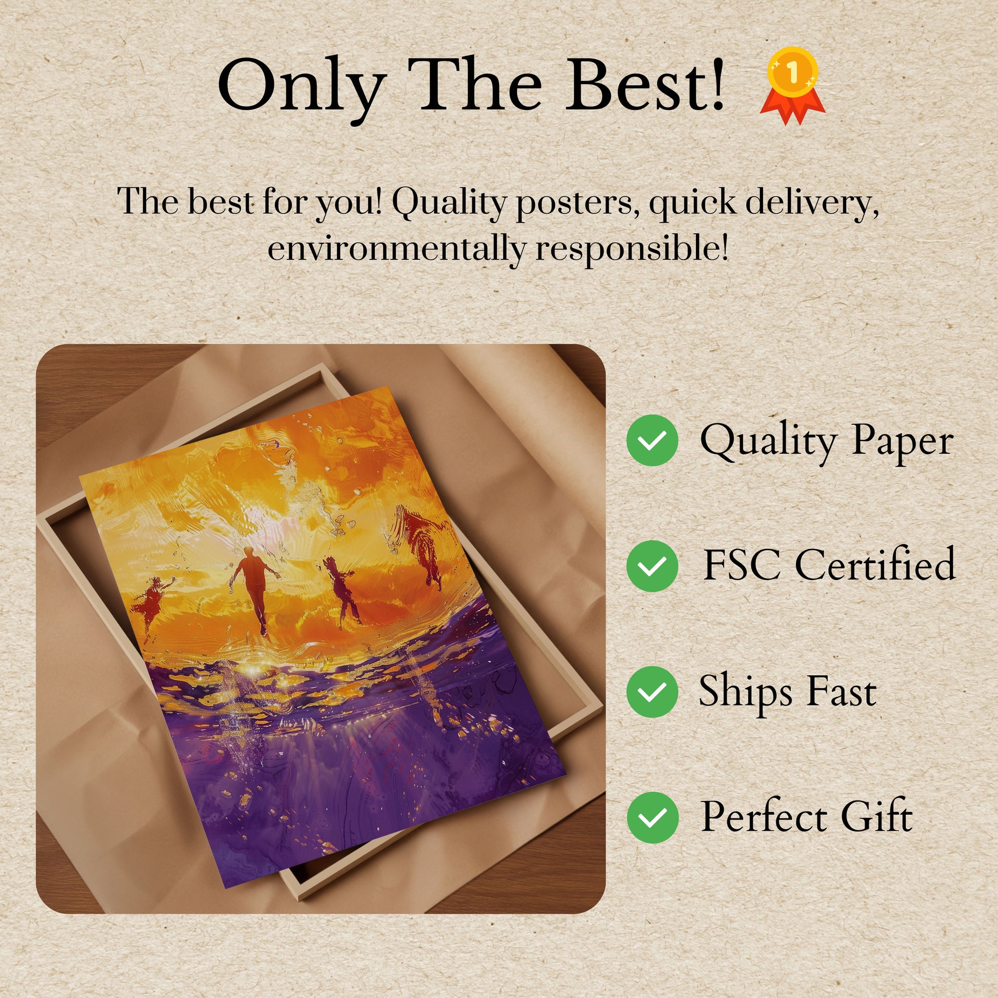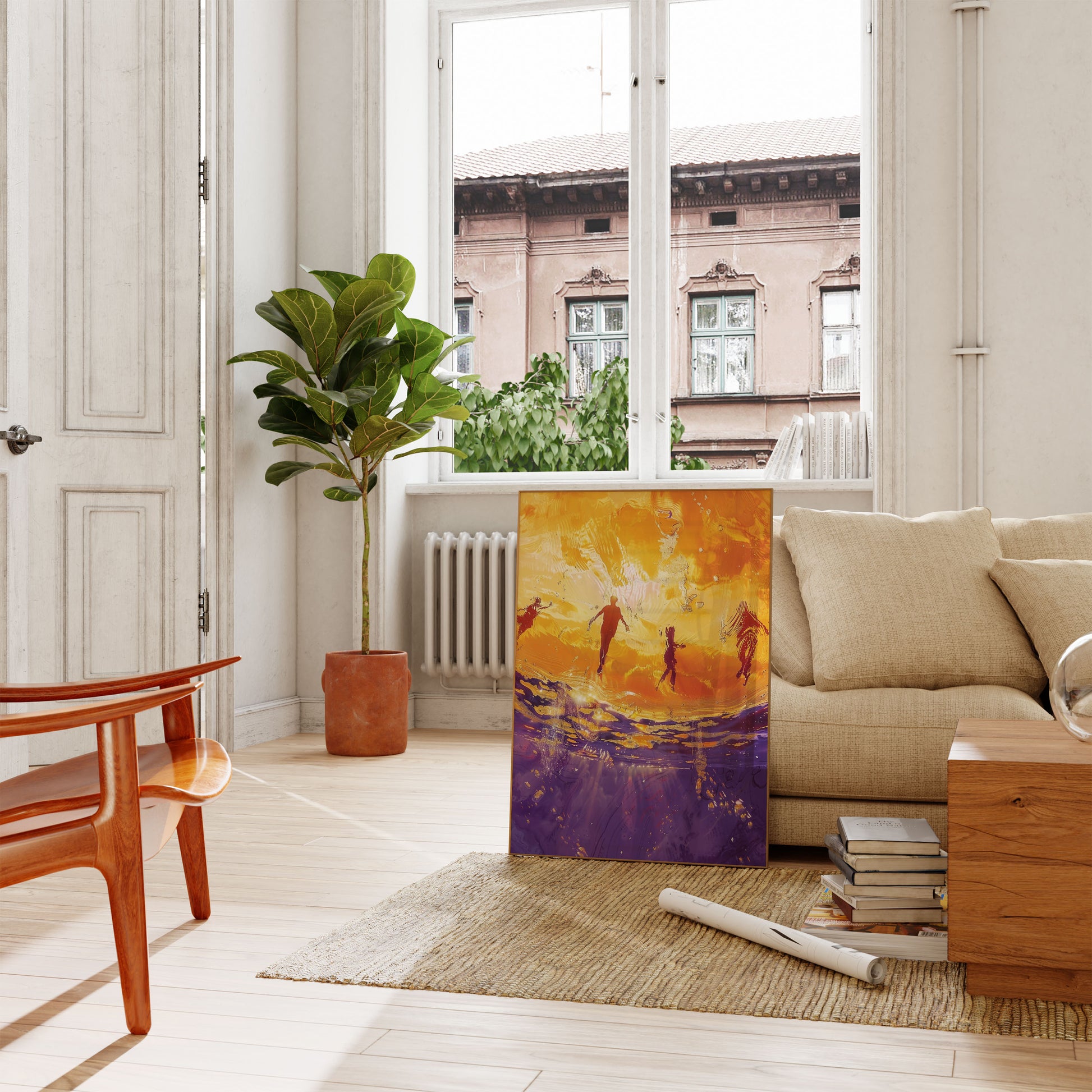 Dive into a mesmerizing underwater dreamscape where silhouetted figures burst through a golden-yellow and deep purple explosion of motion and light. This stunning art piece captures the raw energy of movement, with fluid figures suspended between sea and sky in a breathtaking moment of dynamic suspension. The vibrant color palette and abstract water splashes create an electrifying sense of freedom and transcendence.