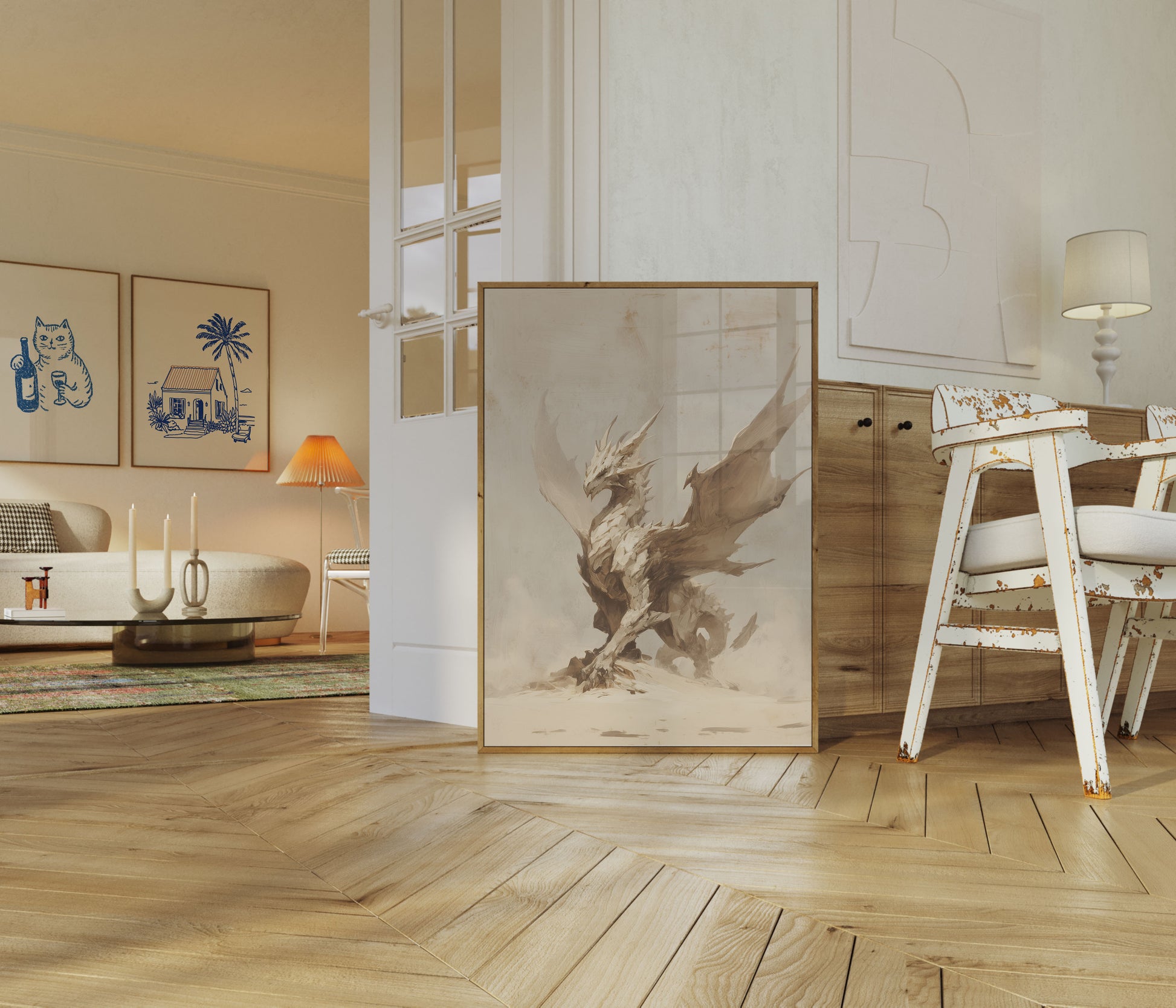 Emerge into a world of mythical wonder with this stunning dragon artwork, crafted in elegant sepia tones that breathe life into a powerful, crystalline creature. The dragon stands majestically atop a rugged terrain, its angular body composed of intricate, sharp-edged scales that seem carved from stone and shadow. Every detail captures a sense of ancient, elemental strength and supernatural grace, inviting viewers into a realm where fantasy and raw natural power converge.