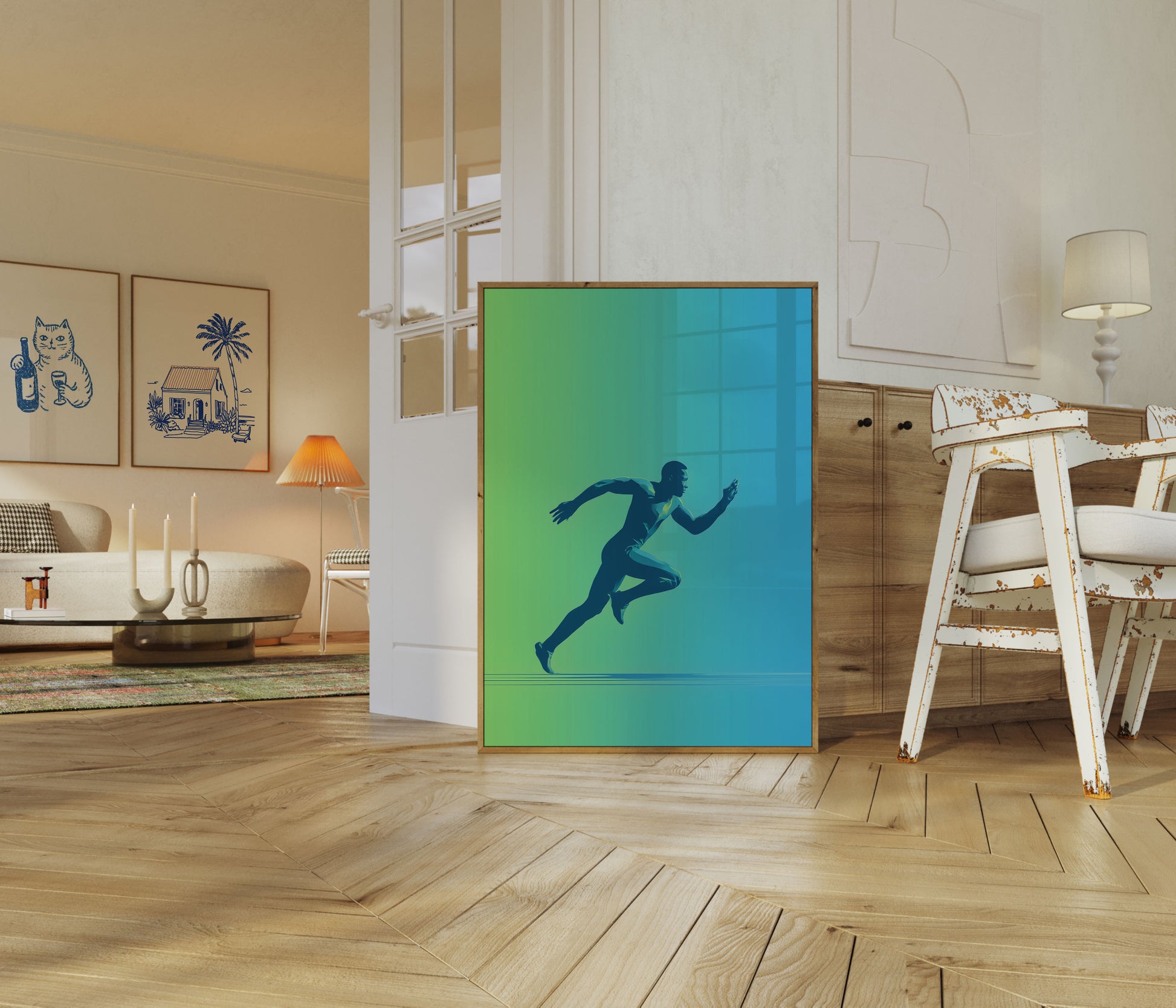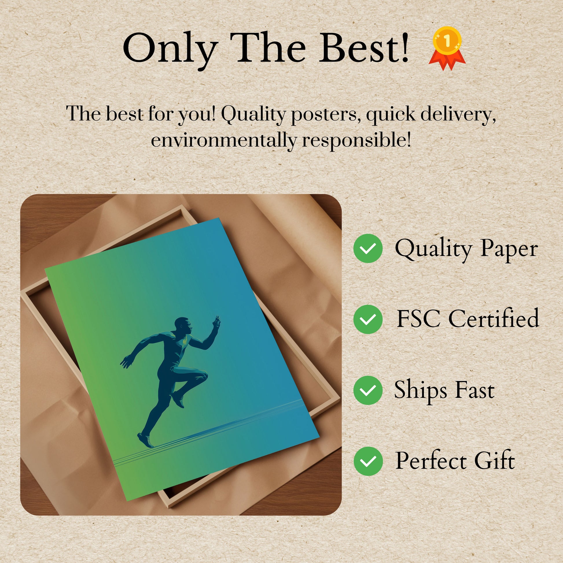 Capture the pure essence of athletic motion with this electrifying running poster that bursts with kinetic energy. Rendered in a stunning gradient of green and blue, the image depicts a sprinter mid-stride, showcasing the raw power and precision of human movement. The dynamic silhouette seems to leap off the background, embodying speed, strength, and limitless potential.