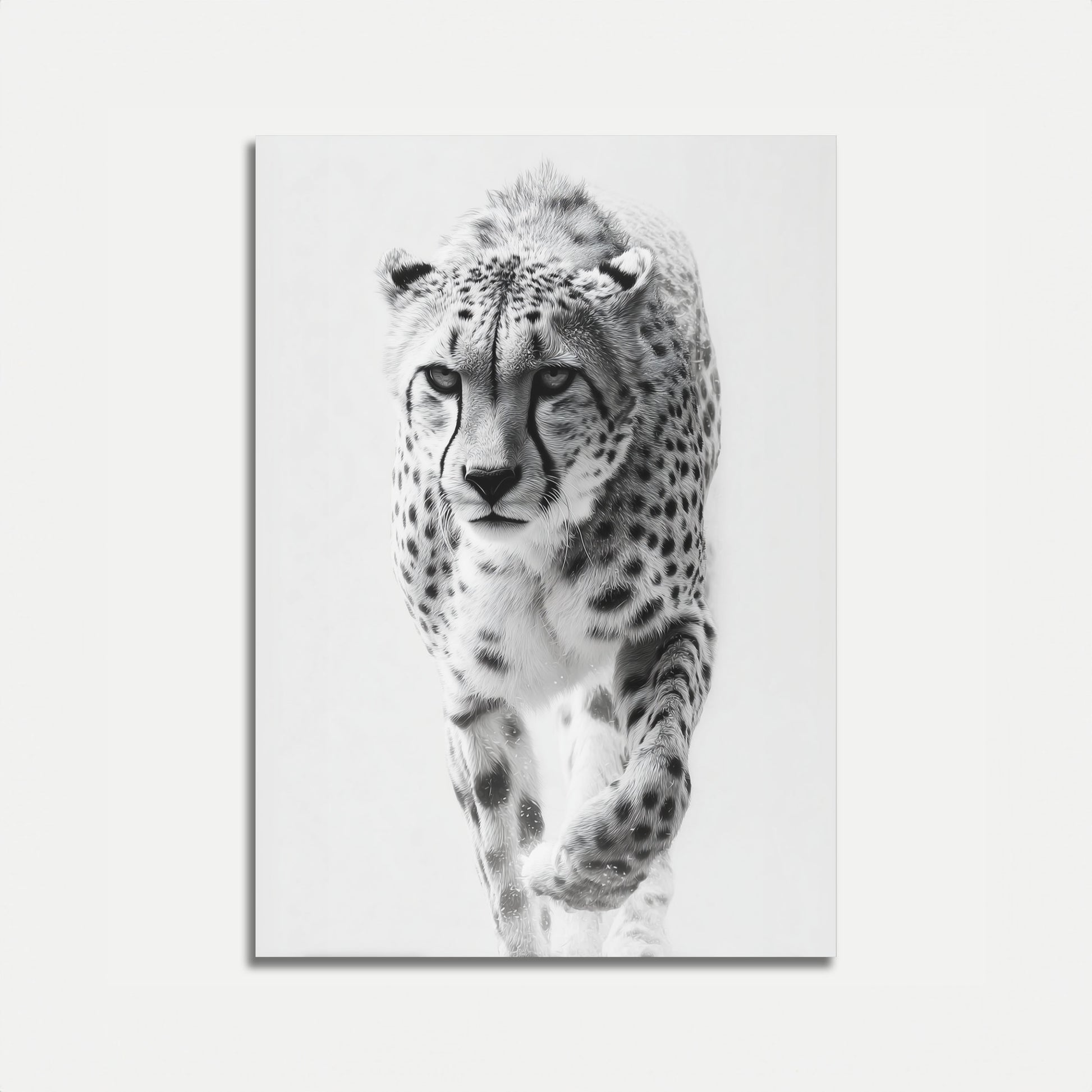 This striking black and white portrait captures the intense gaze and powerful presence of a magnificent cheetah. The detailed monochrome rendering brings out every subtle texture of the big cat's spotted coat, revealing the raw beauty and quiet strength of this incredible predator. Each delicate fur detail and piercing eye creates a mesmerizing visual that draws you into the cheetah's compelling world of silent grace and untamed wilderness.