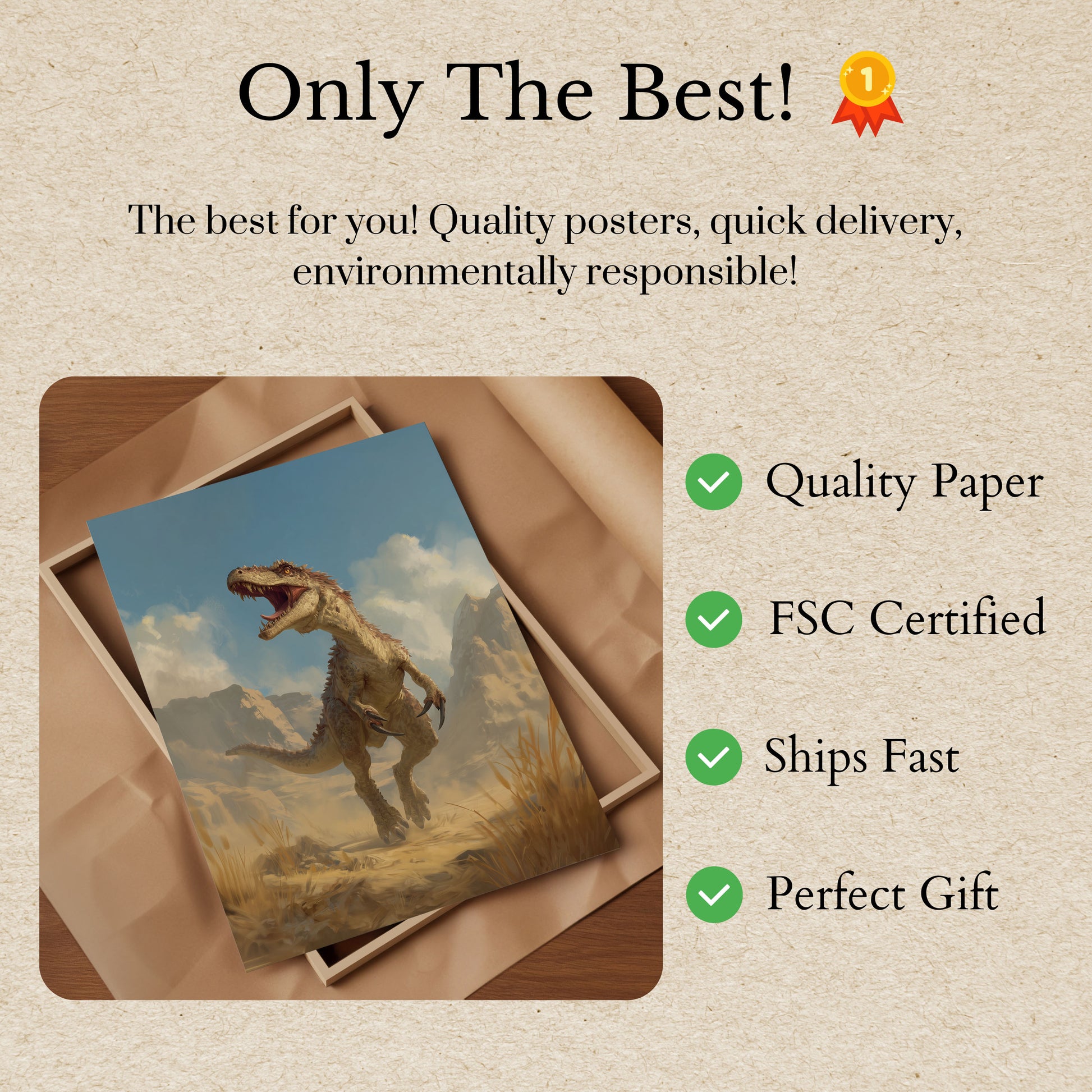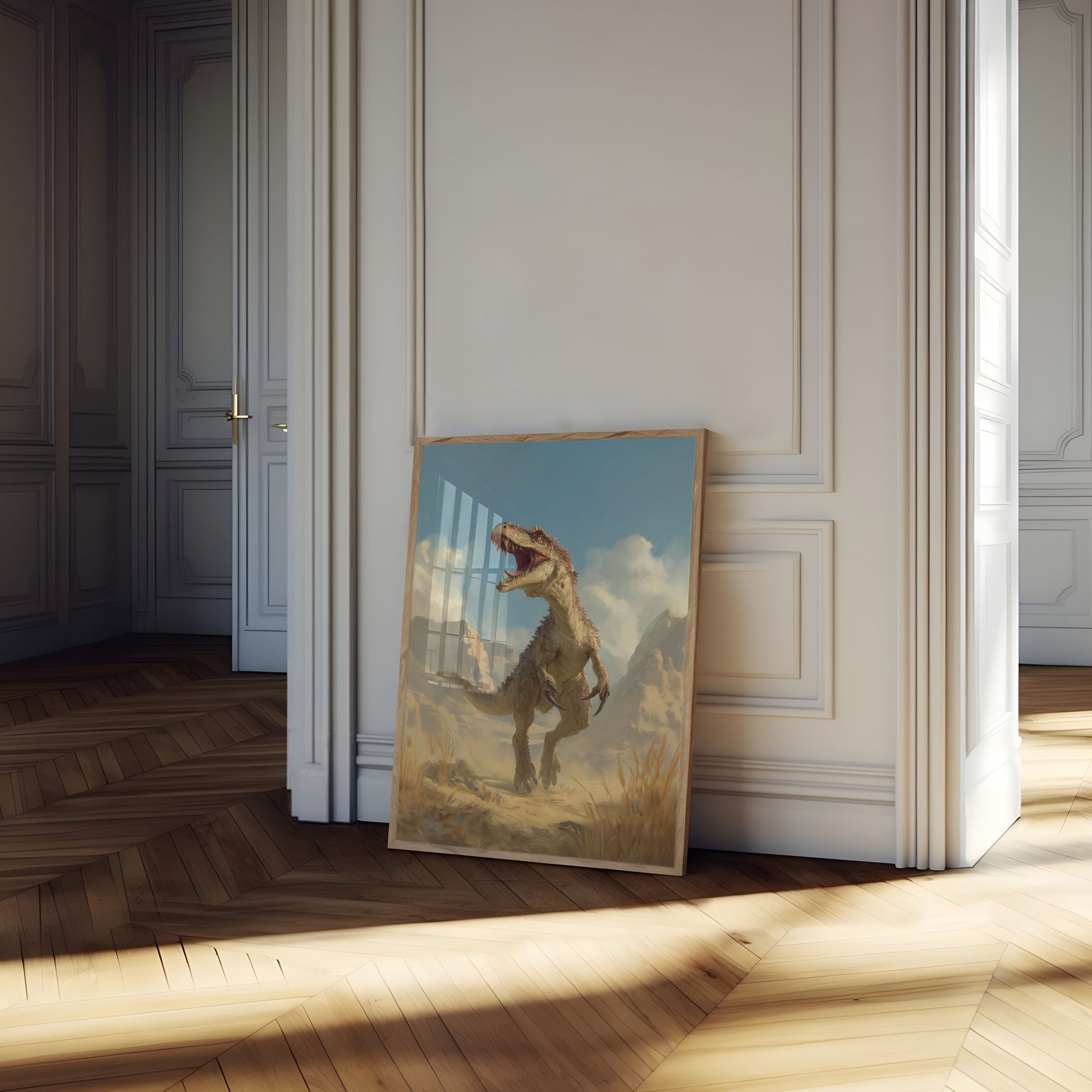Prepare to be transported into a prehistoric landscape where a fierce dinosaur commands the dusty terrain with primal intensity. This stunning artwork captures a predatory dinosaur mid-stride, its razor-sharp teeth bared and muscular body poised against a dramatic backdrop of rocky mountains and wispy clouds. The warm earth tones and dynamic pose create an electrifying sense of prehistoric power and untamed wilderness.