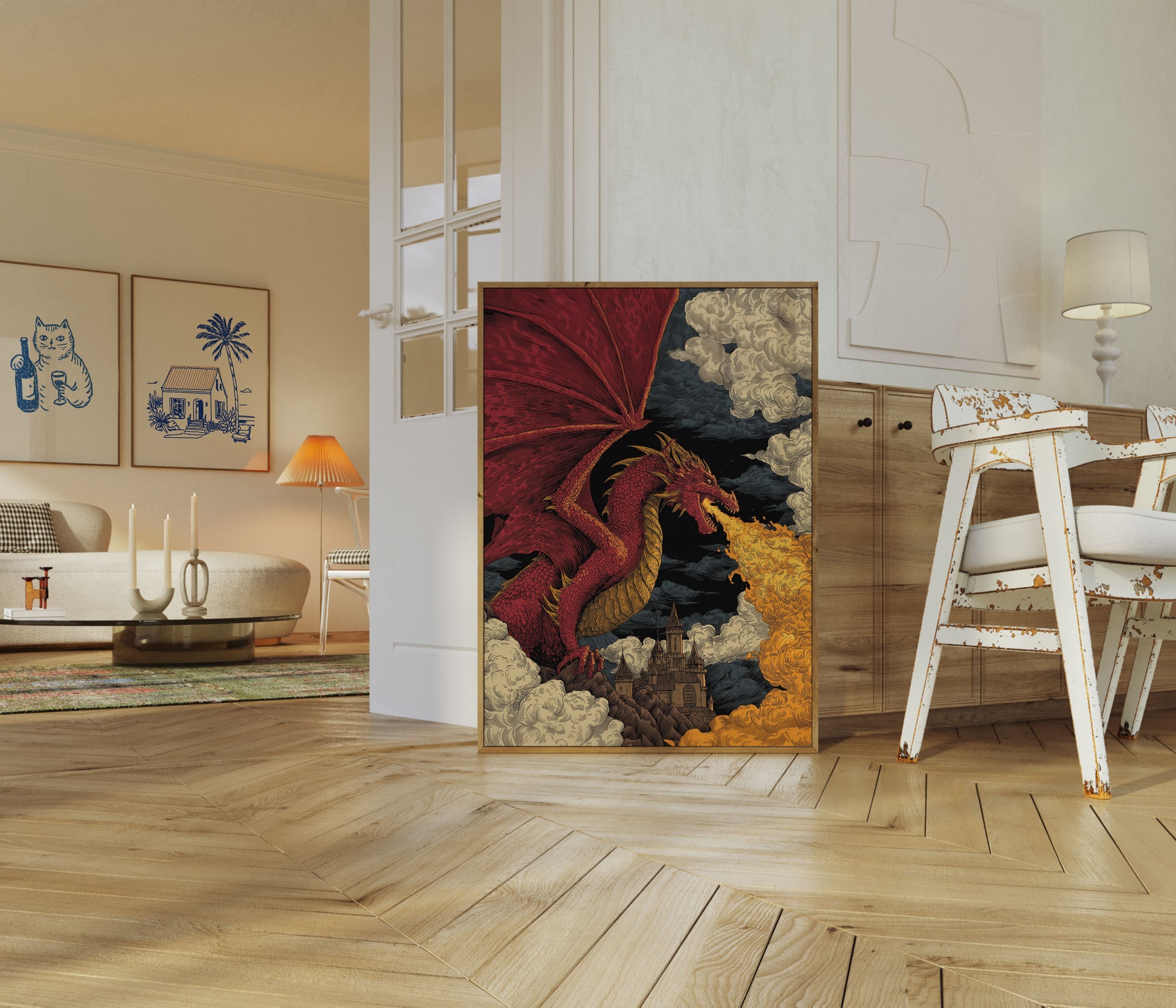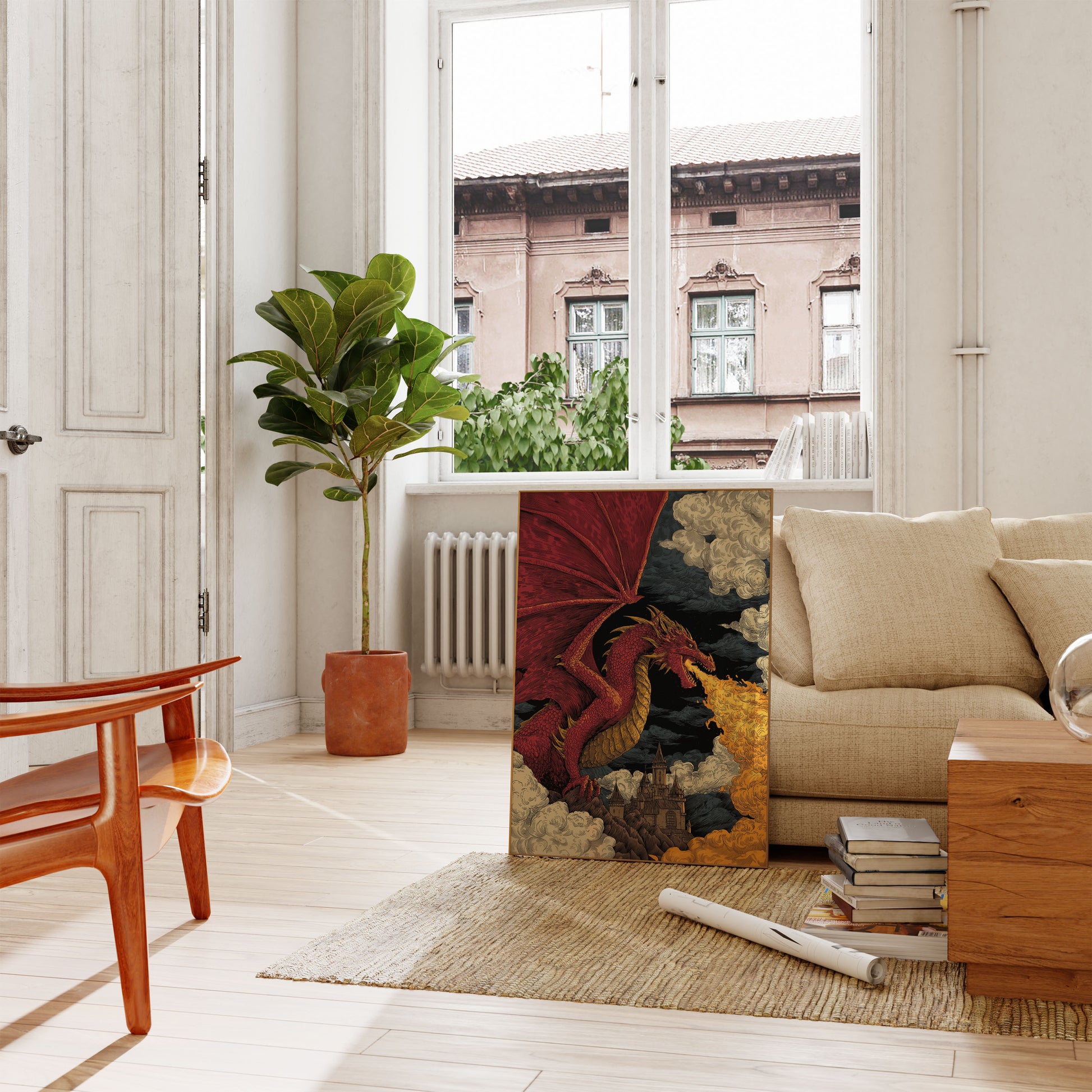 Immerse yourself in a dramatic fantasy landscape where a magnificent crimson dragon dominates the sky, breathing molten flames near a medieval stone castle. Rich, deep colors and intricate details create a mesmerizing scene of mythical power and ancient conflict, with swirling clouds and a brooding atmosphere that captures the essence of legendary epic storytelling. The illustration blends vintage engraving style with intense emotional impact, inviting viewers into a world of magical confrontation.