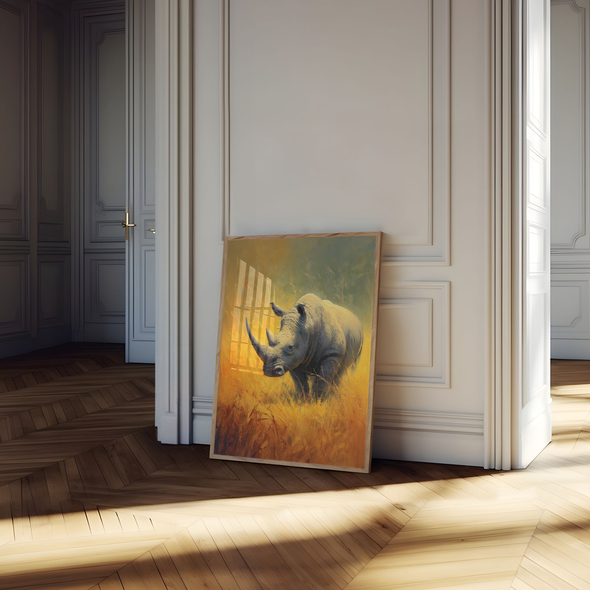 Immerse yourself in the raw power and serene beauty of this stunning rhinoceros artwork. Bathed in warm golden light, the majestic creature stands resolute amidst tall grasses, capturing the essence of African wilderness. Rich, textured brushstrokes bring the rhino to life with incredible depth and emotional intensity, creating a breathtaking visual narrative of strength and survival.