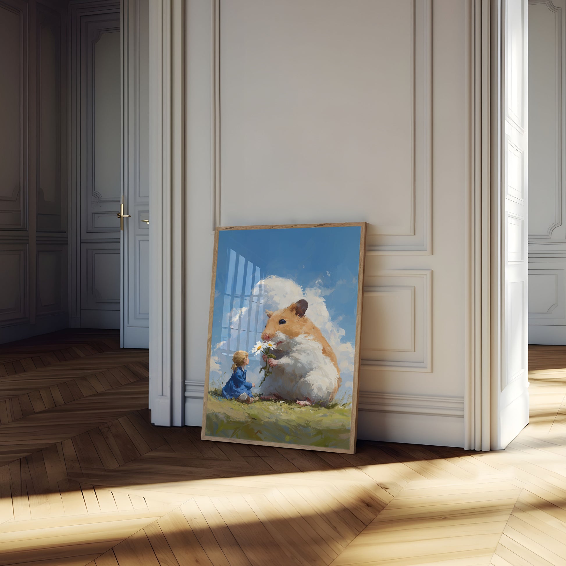 Step into a magical world where a giant, adorable hamster shares a tender moment with a small child, offering a delicate daisy against a dreamy blue sky. This charming art piece captures an enchanting scene of unexpected friendship and innocent wonder, blending soft watercolor-like textures with a heartwarming interaction between a fluffy hamster and a child in a lush, sunlit meadow. The painting radiates warmth, joy, and the pure magic of imagination.