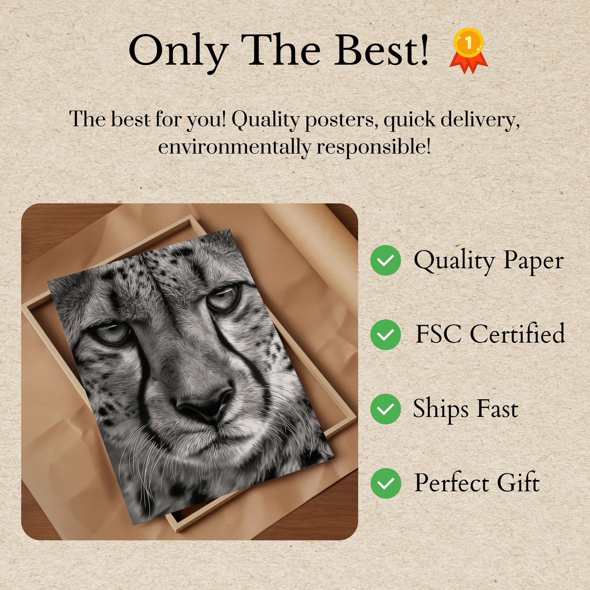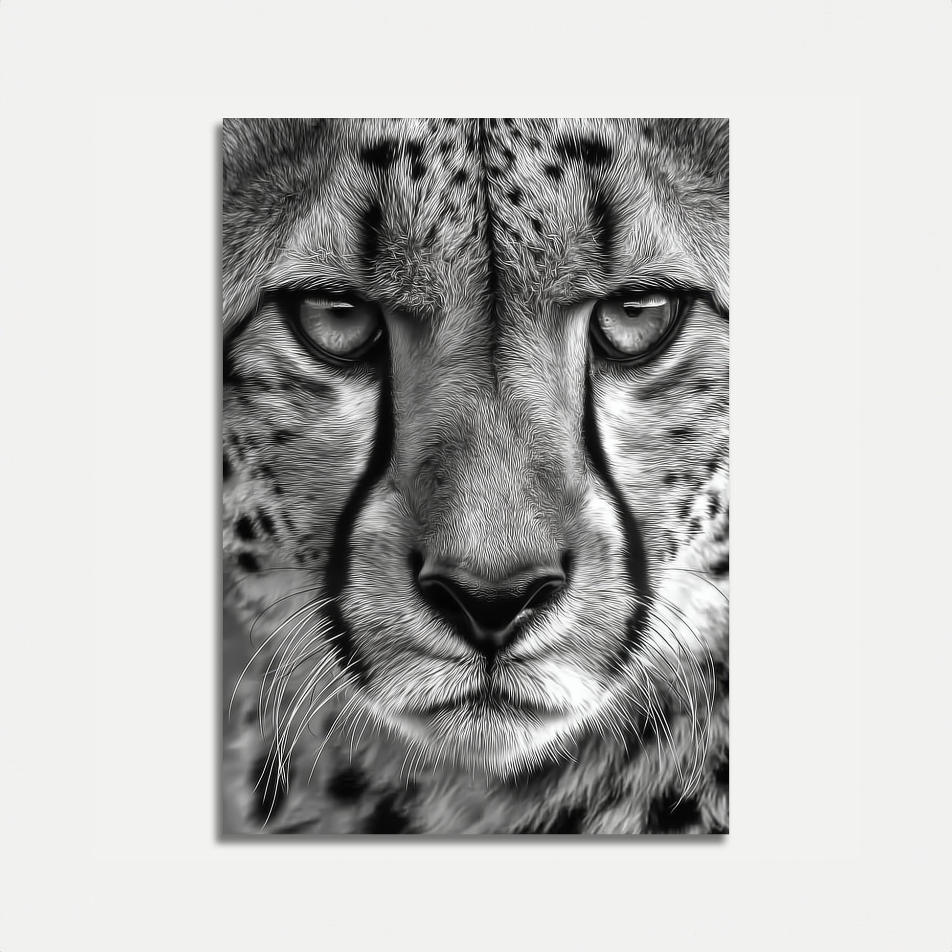 Dive into the mesmerizing world of this stunning black and white cheetah portrait, where every intricate fur detail and piercing eye tells a powerful story of wild beauty and untamed spirit. This high-contrast close-up captures the raw intensity and majestic essence of one of nature's most elegant predators, inviting viewers to connect with the cheetah's profound, unblinking gaze.