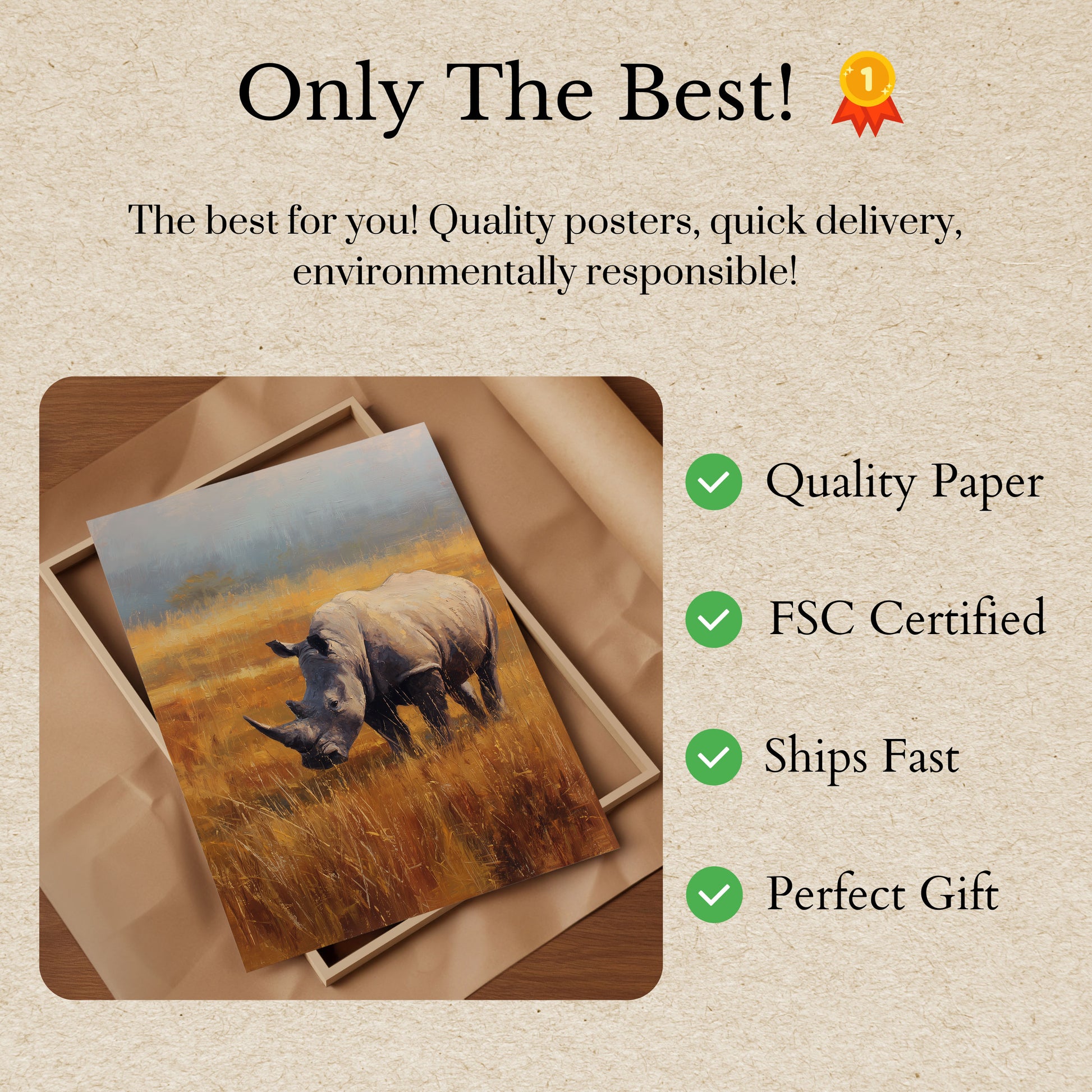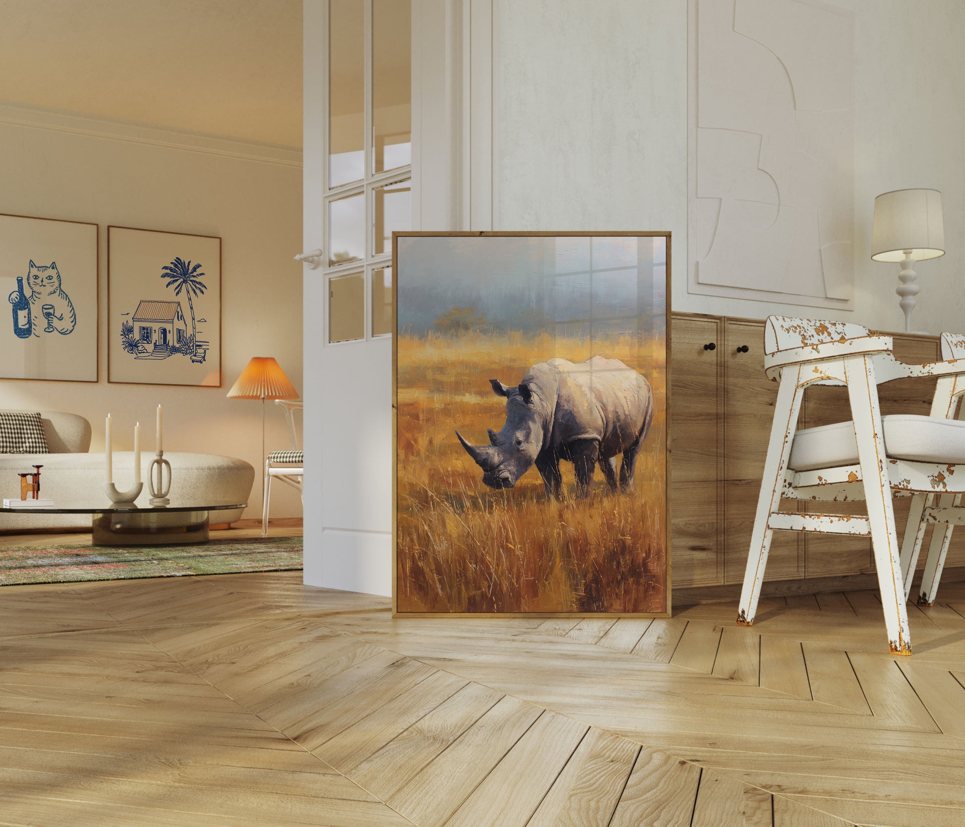 Immerse yourself in the raw beauty of African wildlife with this stunning oil painting of a rhinoceros standing proudly in a sun-drenched savanna. The artwork captures the rhino's powerful presence against a backdrop of golden grass and misty blue-green horizons, creating a breathtaking scene that speaks to the magnificence of nature. Rich, warm tones and delicate brushstrokes bring this magnificent creature to life with incredible depth and emotion.