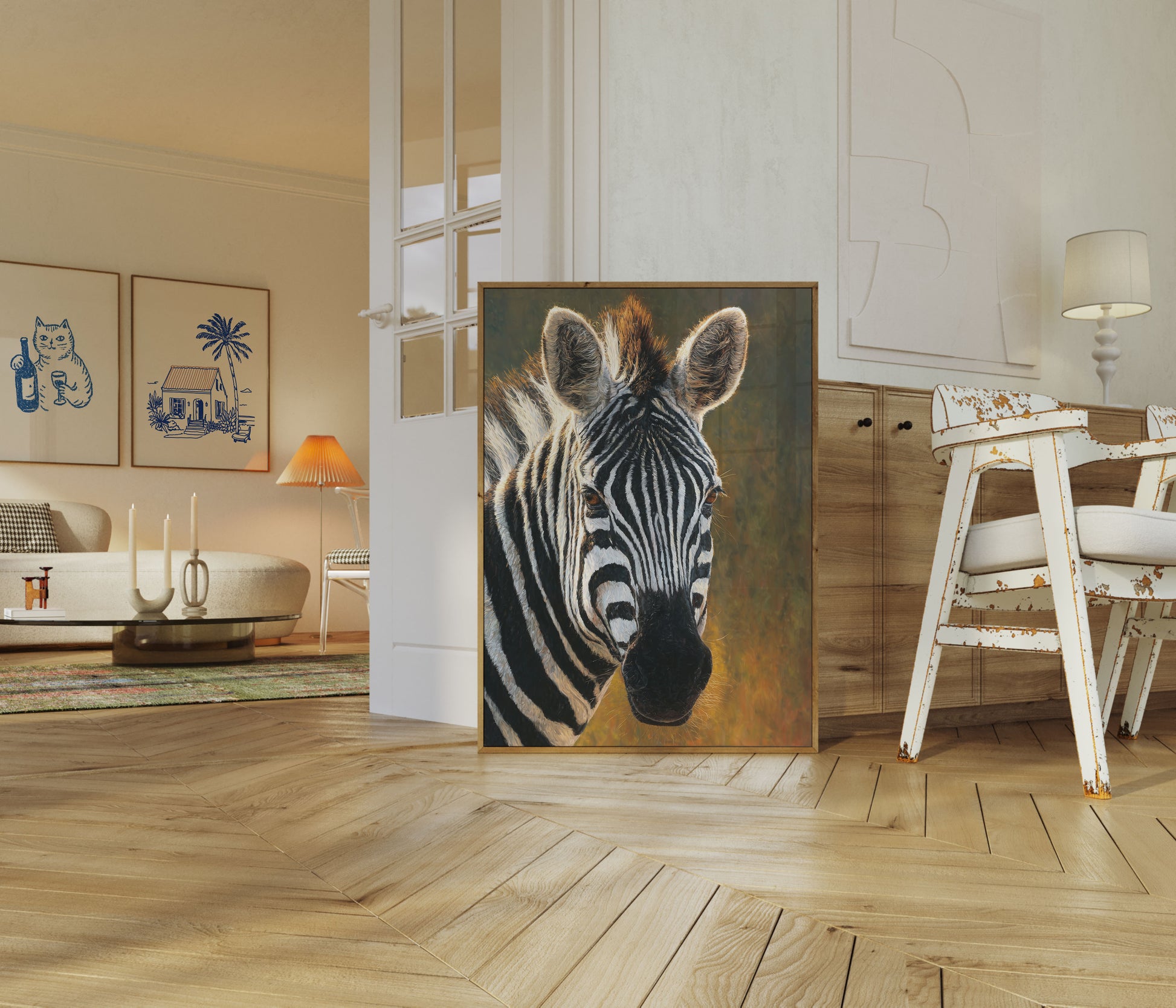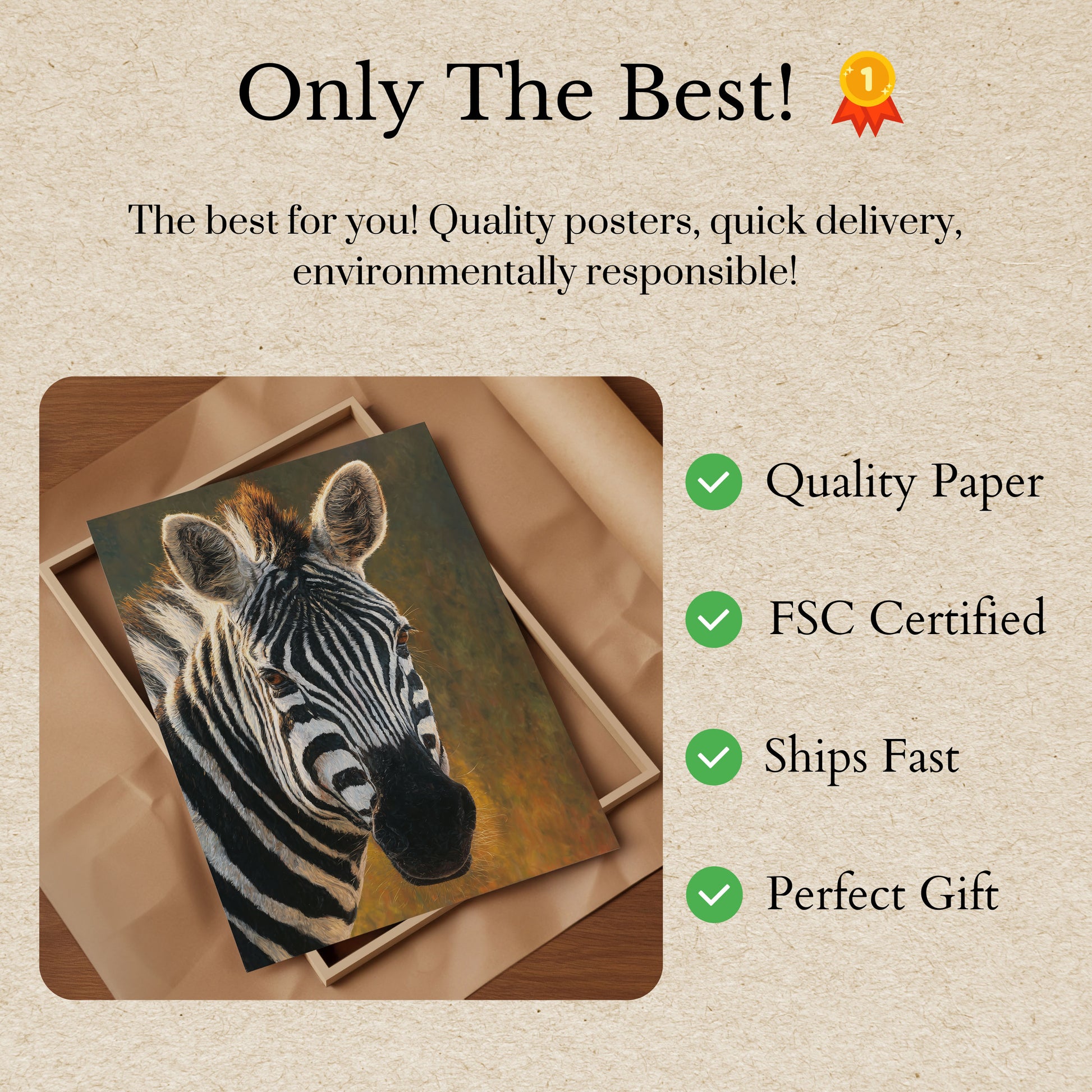 Immerse yourself in the breathtaking detail of this stunning zebra portrait, where every stripe tells a story of wild beauty. The artwork captures the intense gaze and intricate fur texture of this magnificent creature, set against a warm, golden-brown background that highlights the zebra's distinctive black and white pattern. The lifelike rendering brings an incredible sense of depth and emotion, making this poster a captivating focal point for any room.
