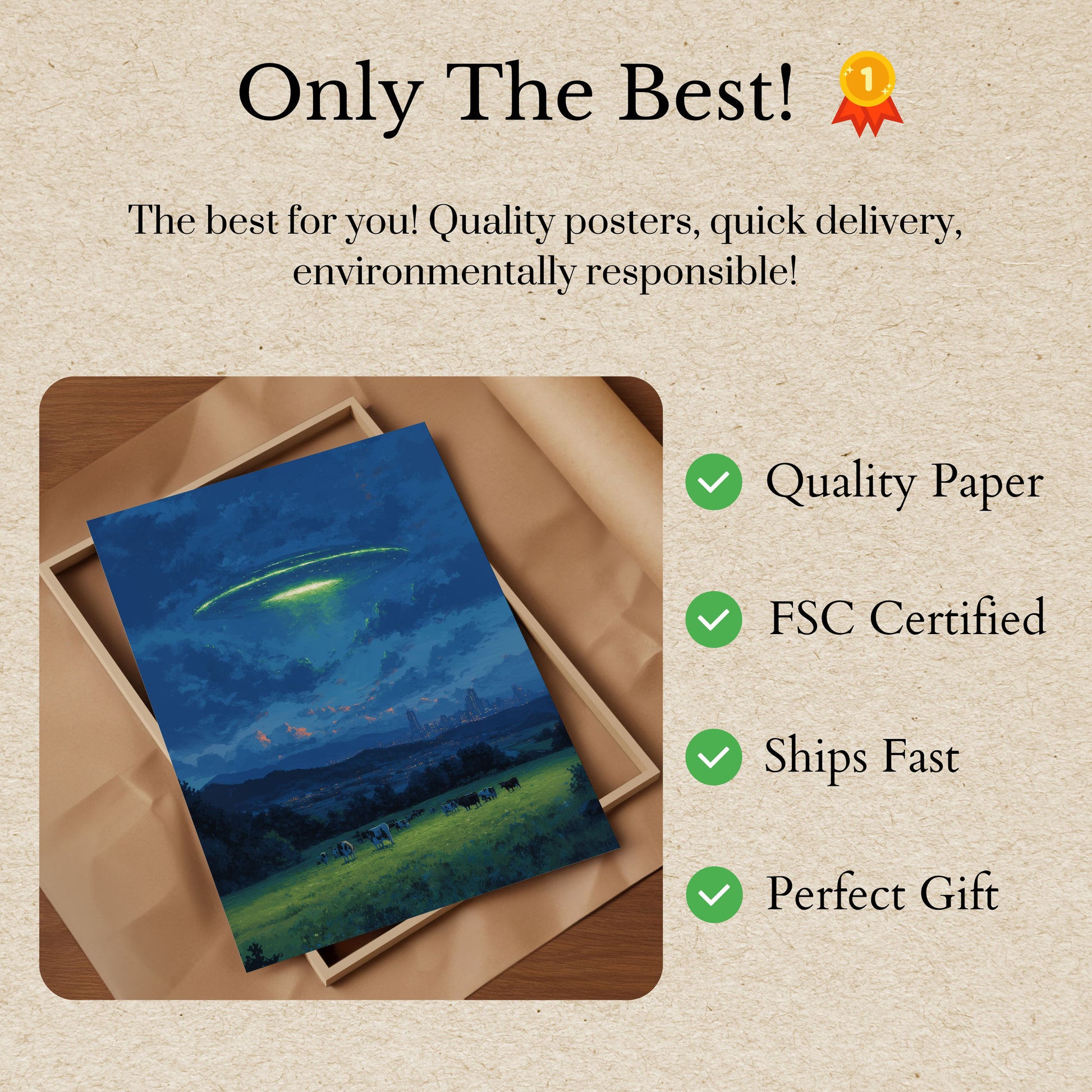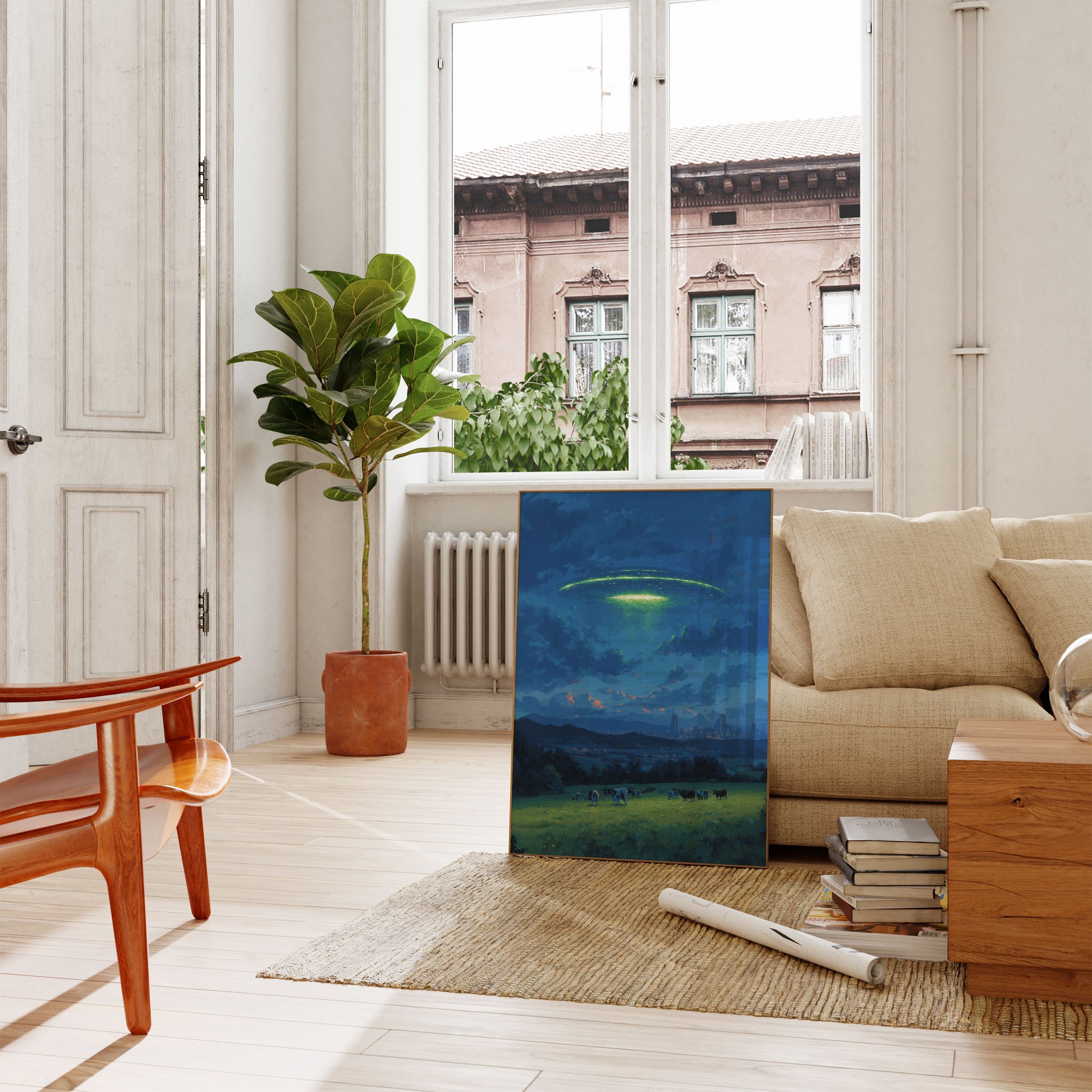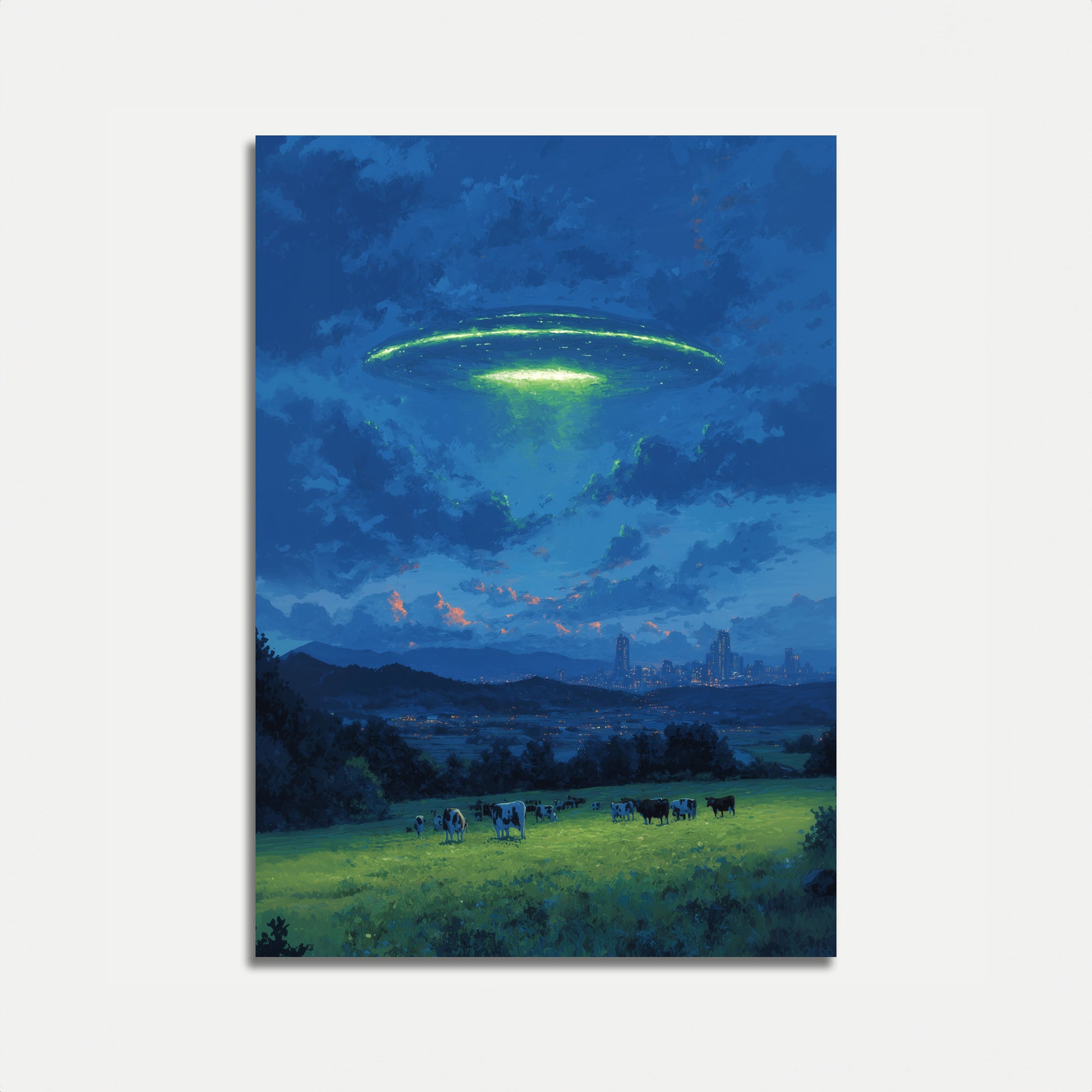 Experience the mesmerizing encounter between rural tranquility and extraterrestrial mystery in this stunning art print. A classic flying saucer hovers majestically above a peaceful cow pasture, casting an ethereal green glow against a deep blue twilight sky, with distant city lights and mountain silhouettes creating a breathtaking backdrop. This sci-fi landscape captures the imagination, blending the ordinary with the extraordinary in a single, captivating moment.