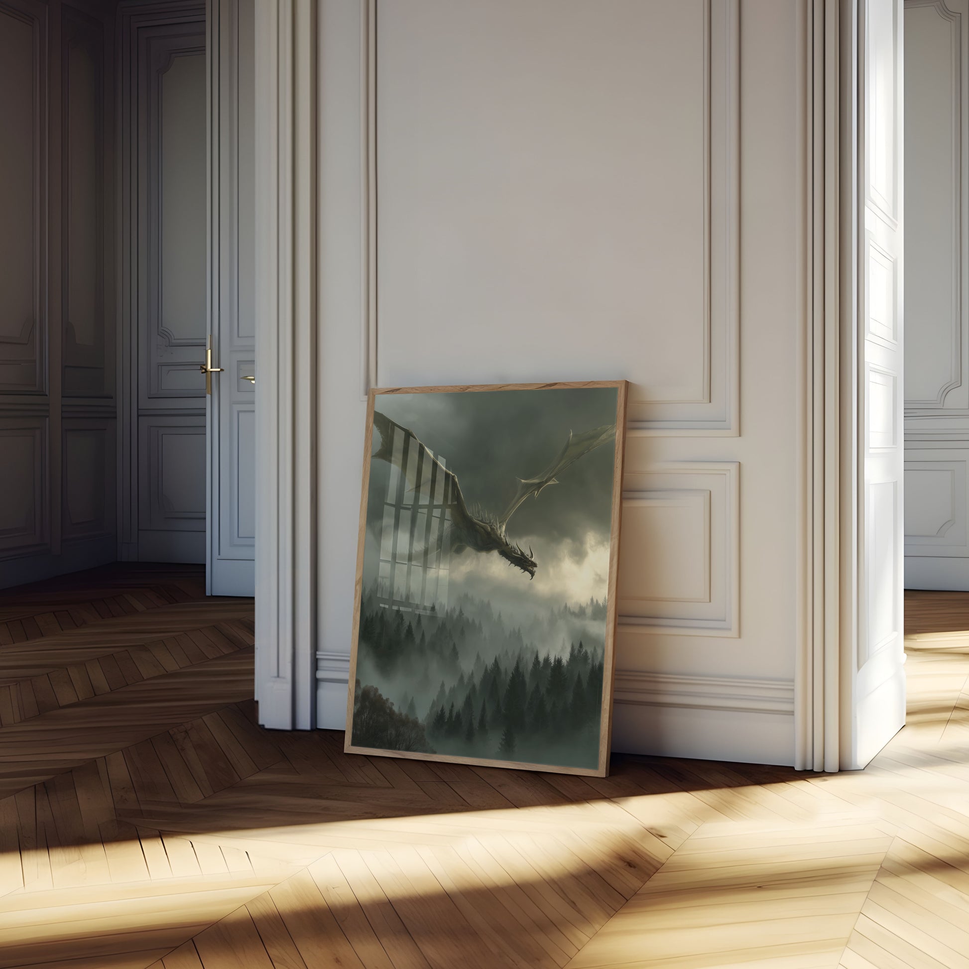 Soar through a haunting landscape of endless evergreen forests with this breathtaking dragon artwork. A majestic winged creature glides menacingly above a sea of misty pine trees, capturing the raw, primordial essence of mythical fantasy. The moody, atmospheric scene blends dark greens and soft grays, creating an epic and immersive visual experience that transports viewers to a world of ancient legends and untamed wilderness.