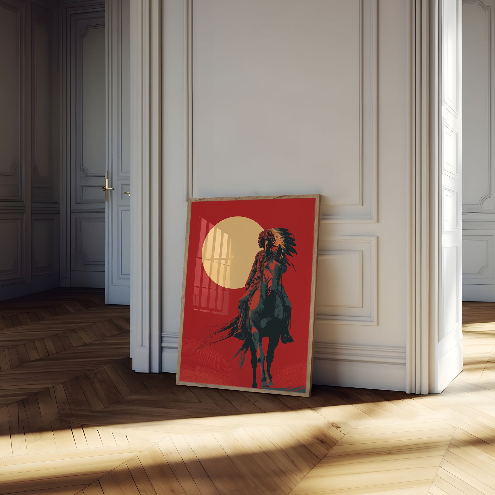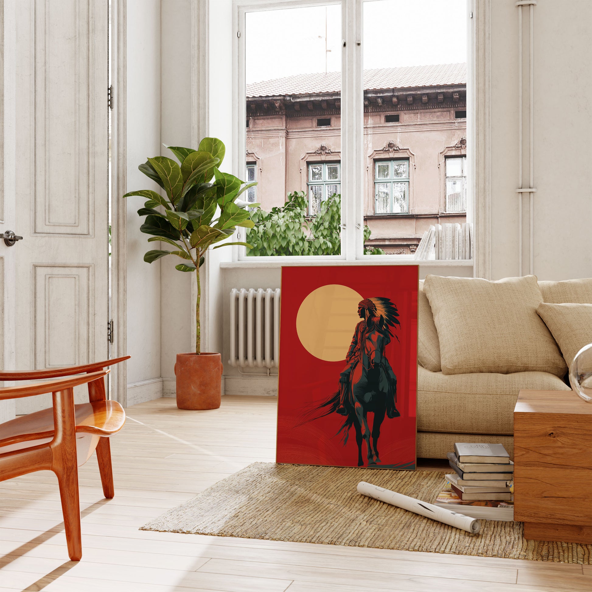A striking graphic artwork capturing a Native American rider on horseback against a bold red background with a large golden sun. The silhouette is rendered in deep, rich tones, showcasing intricate details of the traditional headdress and flowing clothing. This powerful poster evokes a sense of strength, heritage, and timeless spirit, making a bold statement in any space.