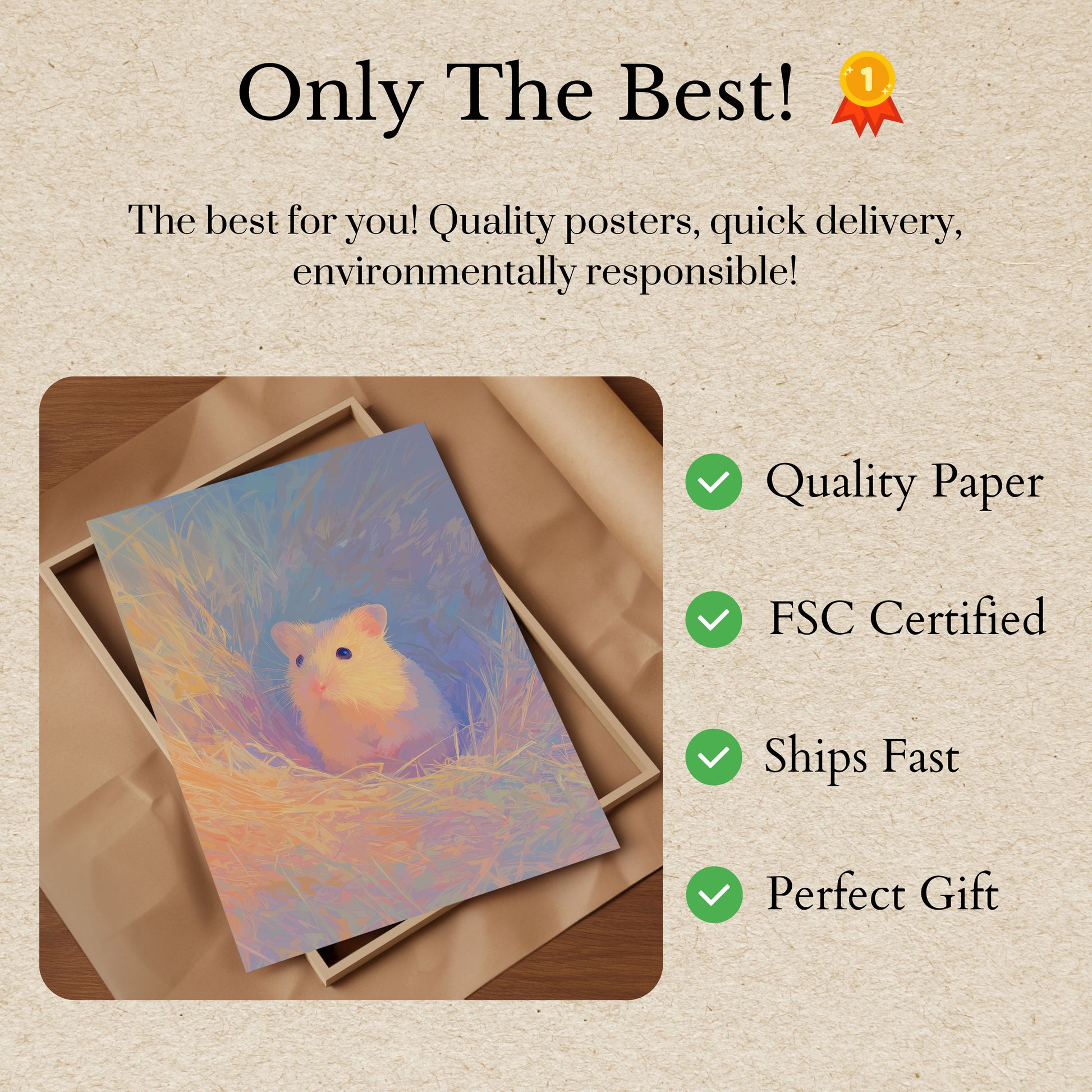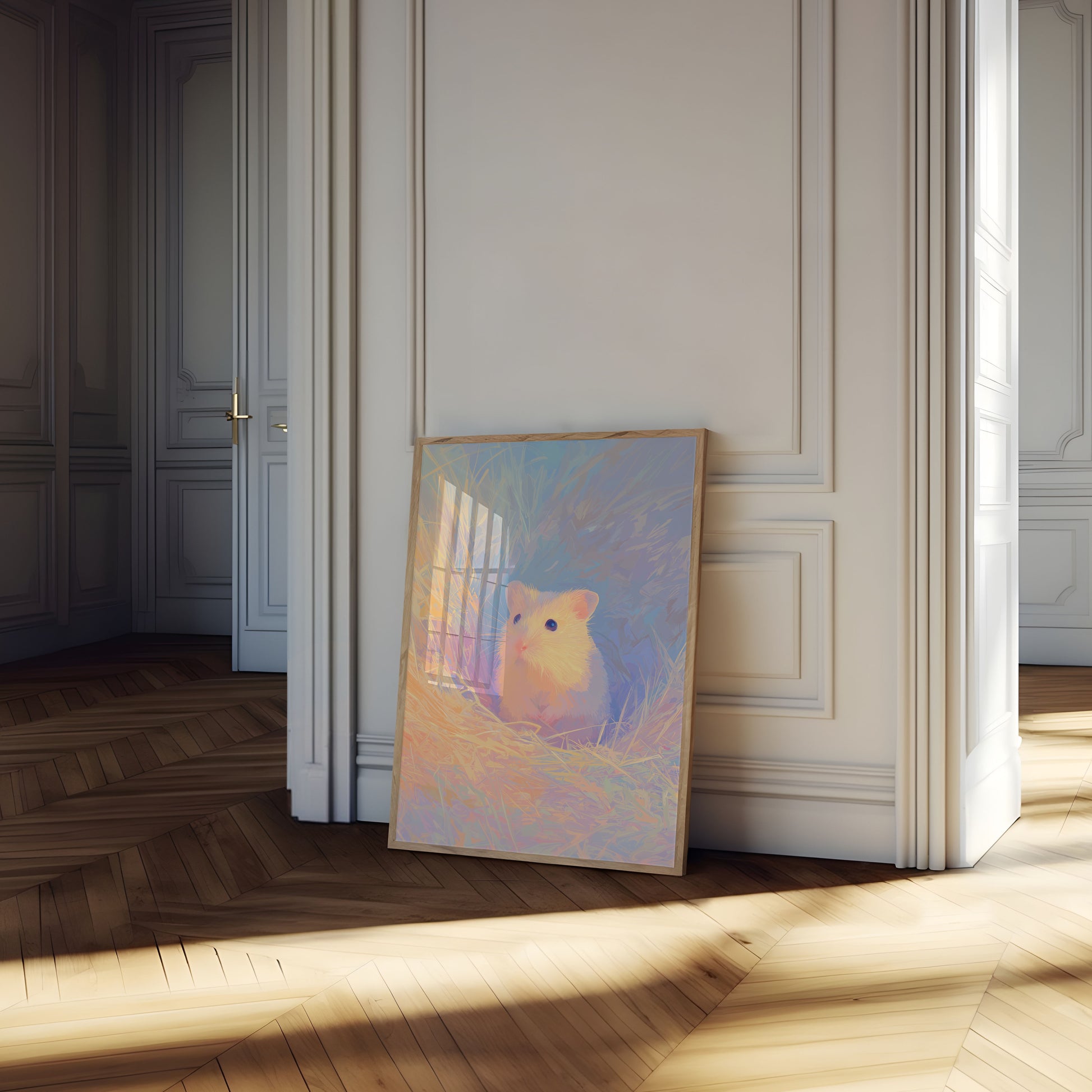 Dive into a dreamy world of soft hues and delicate beauty with this enchanting hamster portrait. Nestled in a sea of ethereal grass, the adorable furry creature glows with warm golden and peachy tones against a soothing blue-lavender background. Every delicate whisker and round eye captures the pure, gentle essence of this tiny woodland friend, creating a mesmerizing visual experience that will brighten any room.