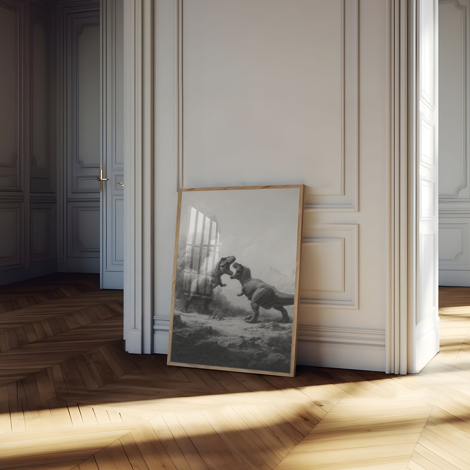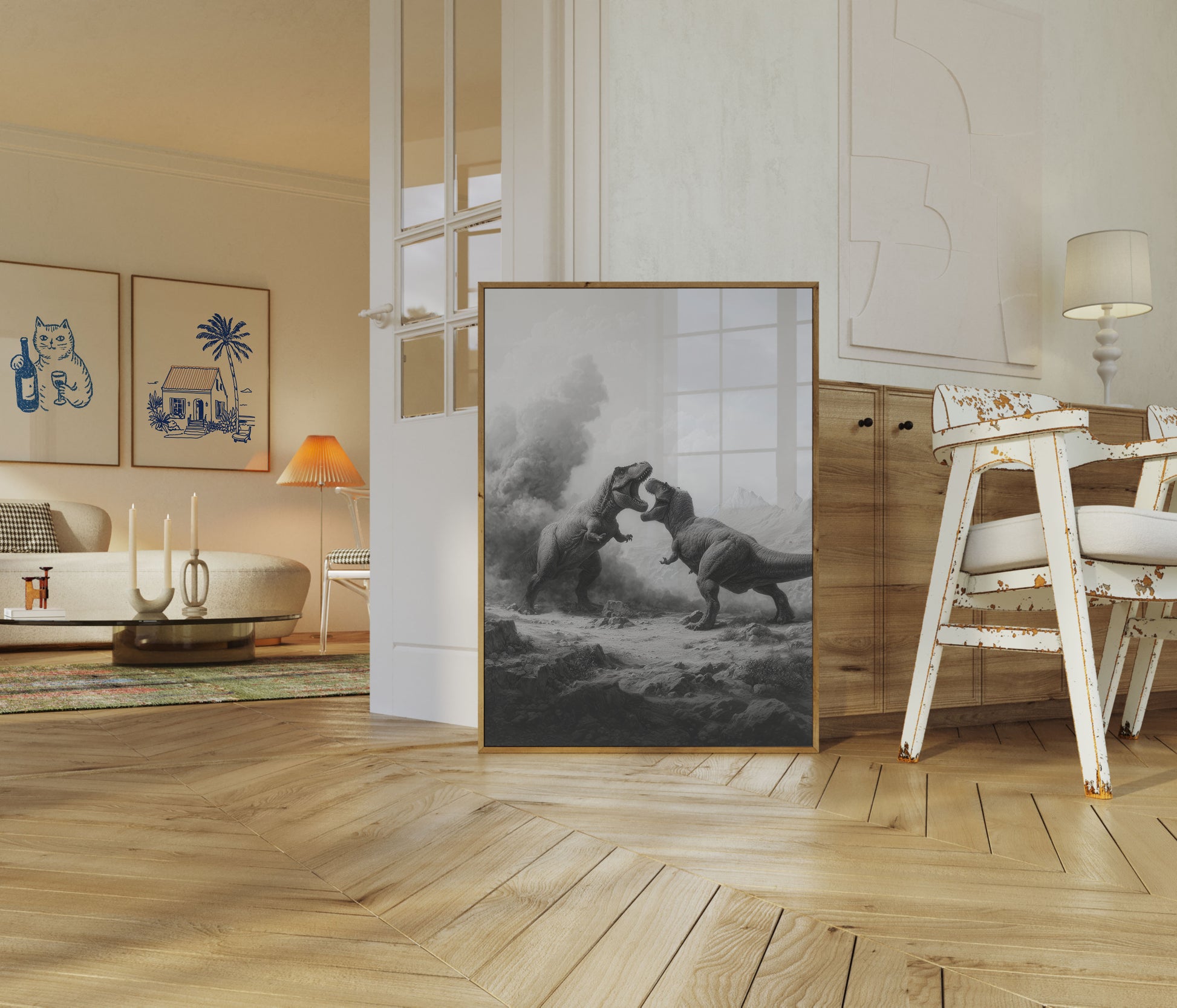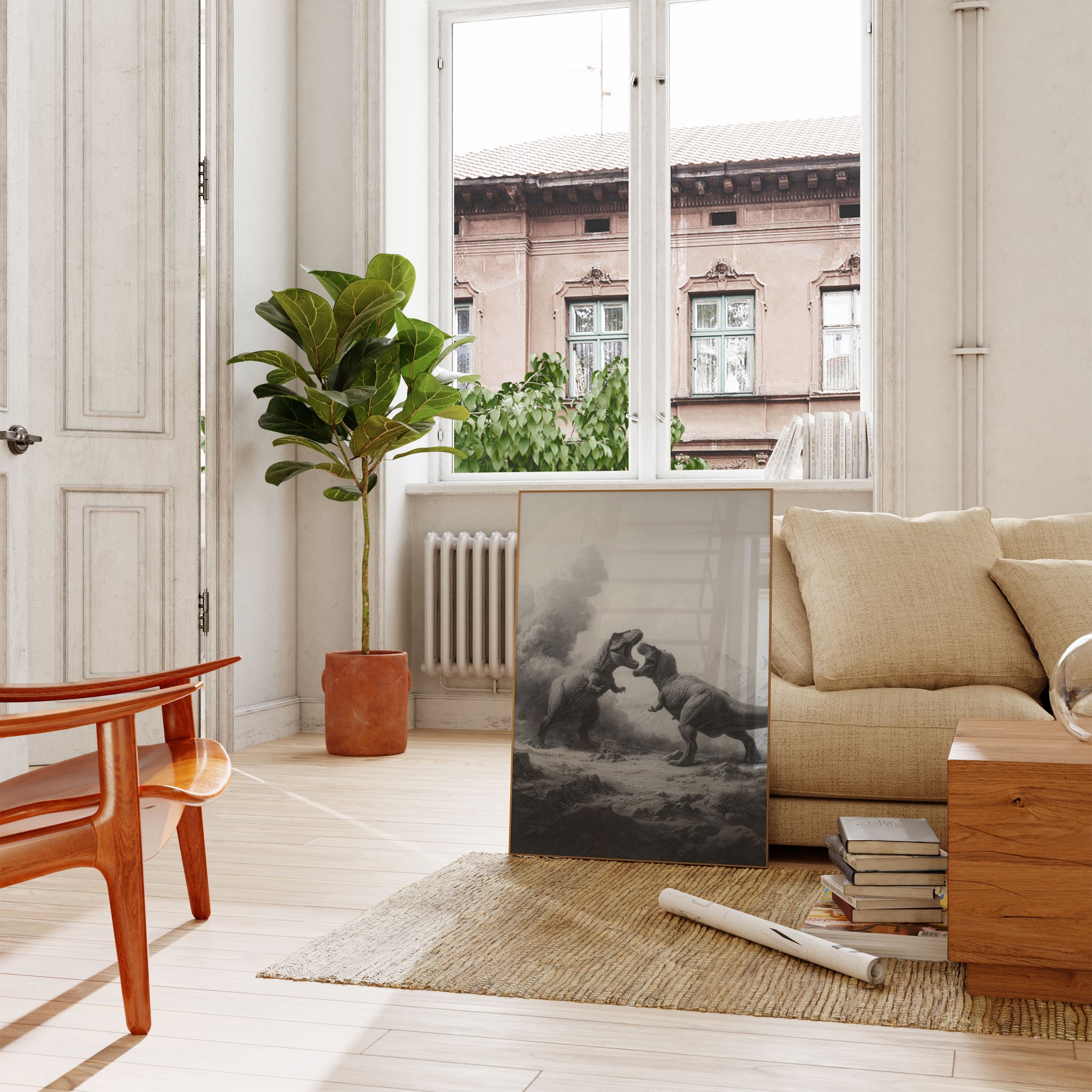Witness the epic confrontation of two massive Tyrannosaurus Rex dinosaurs locked in an intense showdown amidst a dramatic, smoke-filled prehistoric landscape. This stunning black and white illustration captures the raw power and primal energy of these ancient predators, their muscular forms poised mid-battle with mouths agape against a backdrop of rocky terrain and misty mountains. The intense grayscale rendering creates a sense of timeless, primordial drama that will captivate dinosaur enthusiasts and art lovers alike.