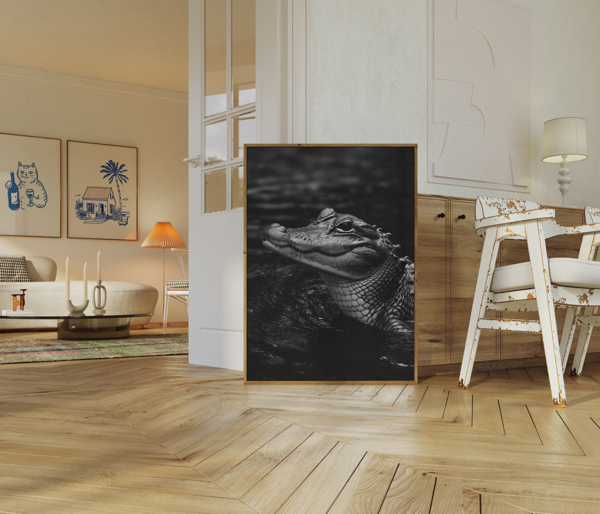 Dive into the intense world of a prehistoric apex predator with this stunning black and white crocodile portrait. The image captures the raw power and prehistoric essence of this ancient reptile, with intricate scales and a penetrating gaze that tells a story of survival and primordial strength. Every detail of the crocodile's textured skin is meticulously rendered, creating a dramatic and mesmerizing visual experience that transports viewers to the realm of nature's most enduring hunters.