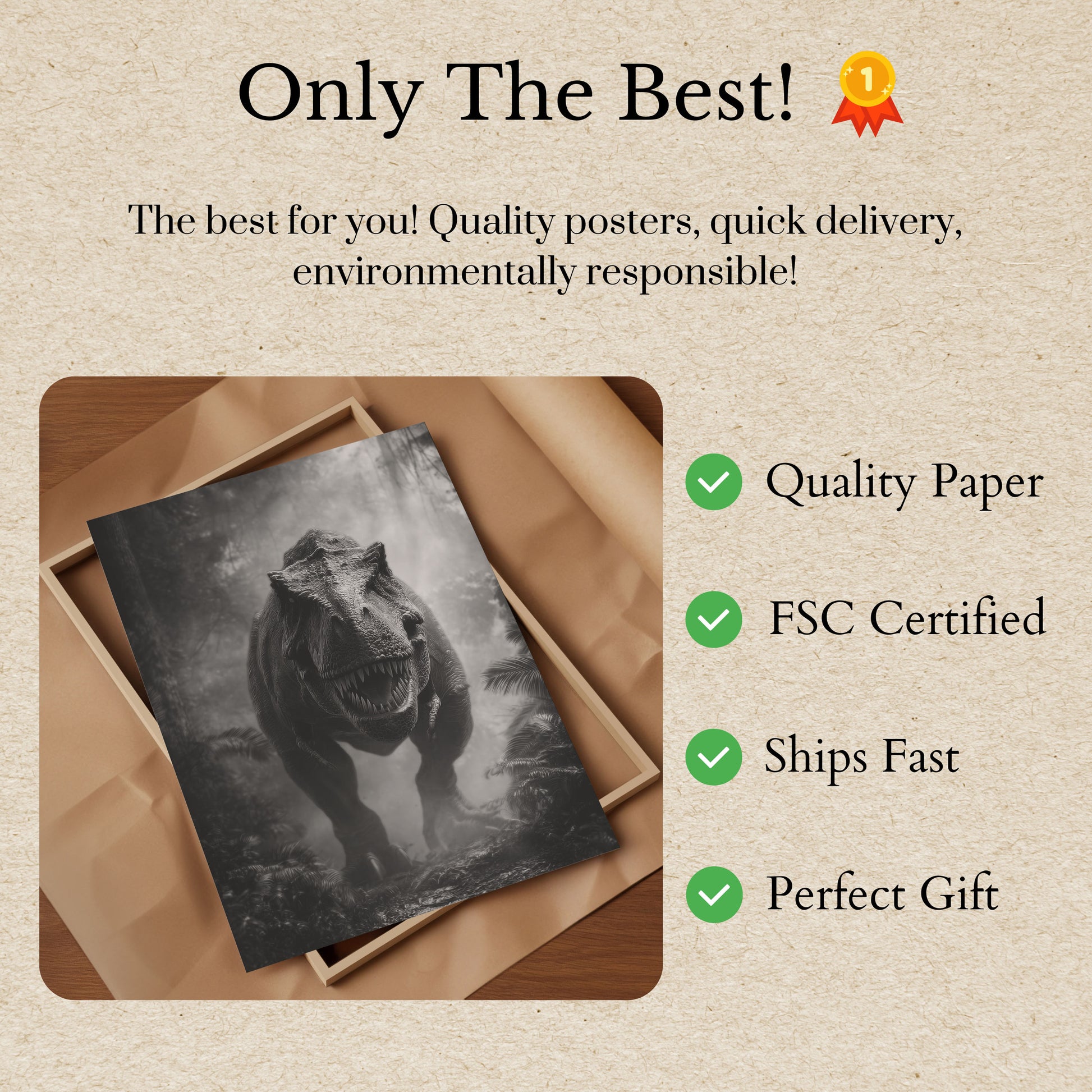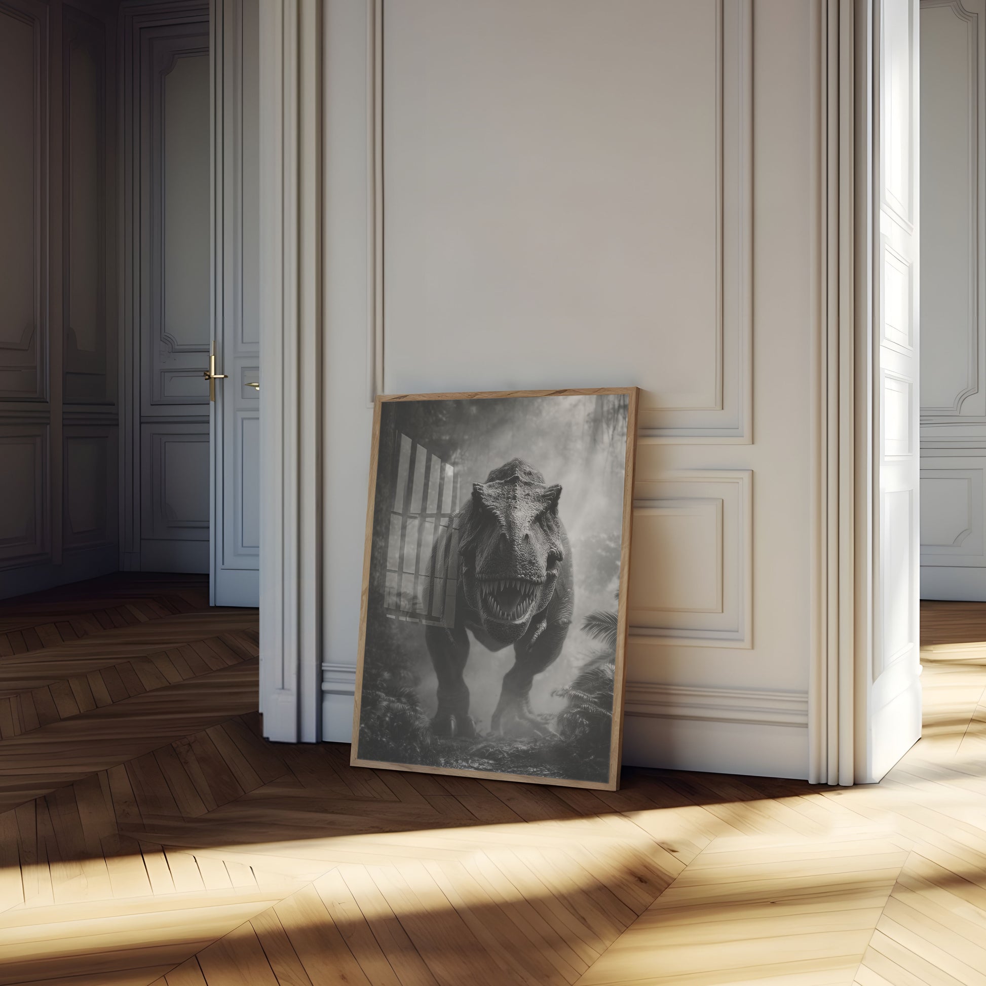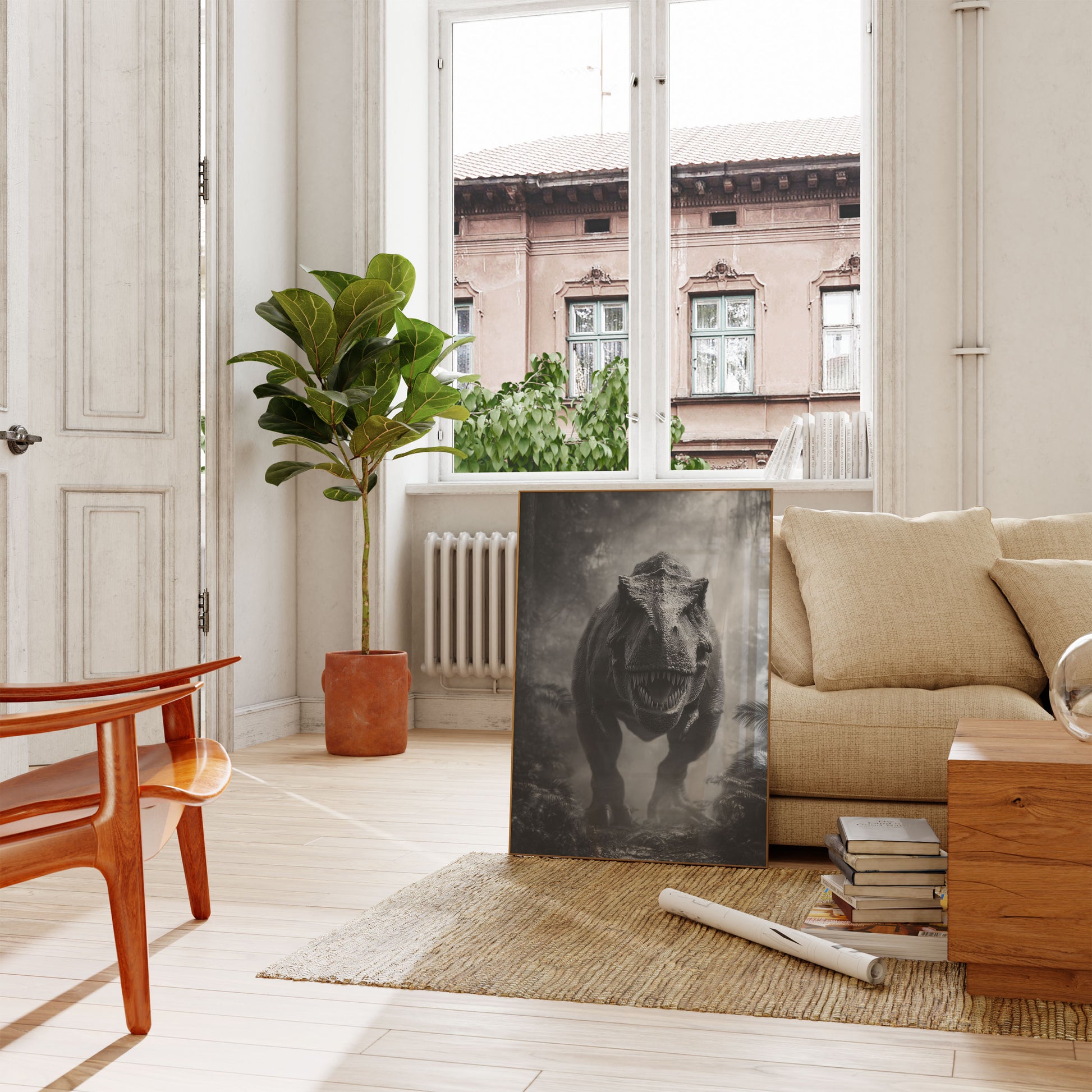 Witness the raw power and primal intensity of this monochromatic T-Rex in a misty prehistoric landscape. The black and white image captures the legendary dinosaur's muscular form and fearsome open jaws, emerging from a dense, primordial forest with an overwhelming sense of prehistoric drama. Every textured scale and razor-sharp tooth is rendered in stunning detail, creating an atmospheric scene that transports viewers to the ancient world of giant reptilian hunters.