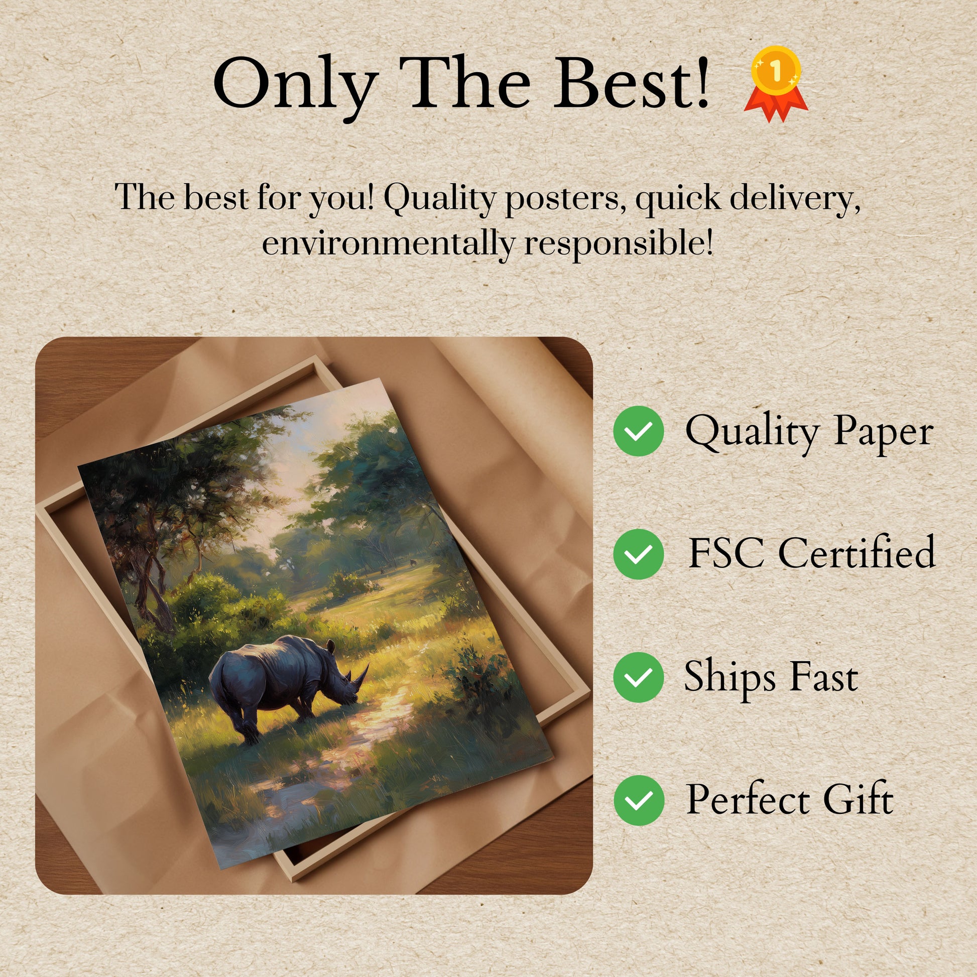 Immerse yourself in the tranquil beauty of this stunning wildlife artwork, where a majestic rhinoceros grazes peacefully in a golden-green meadow bathed in soft, ethereal light. The painting captures a moment of quiet solitude, with lush trees framing a sunlit landscape that seems to breathe with natural harmony. Rich, impressionistic brushstrokes create a dreamlike atmosphere that invites the viewer into a world of gentle wilderness and serene beauty.