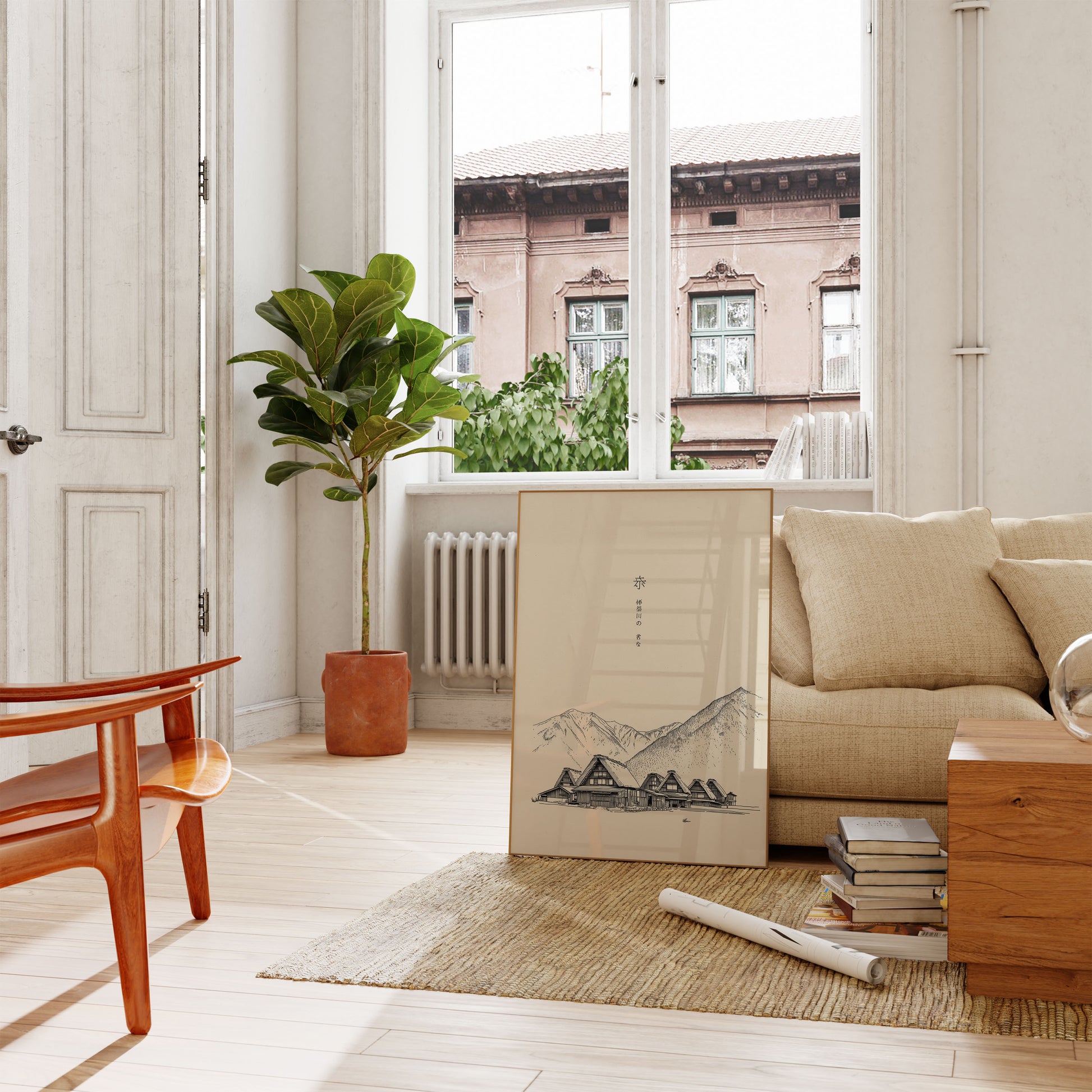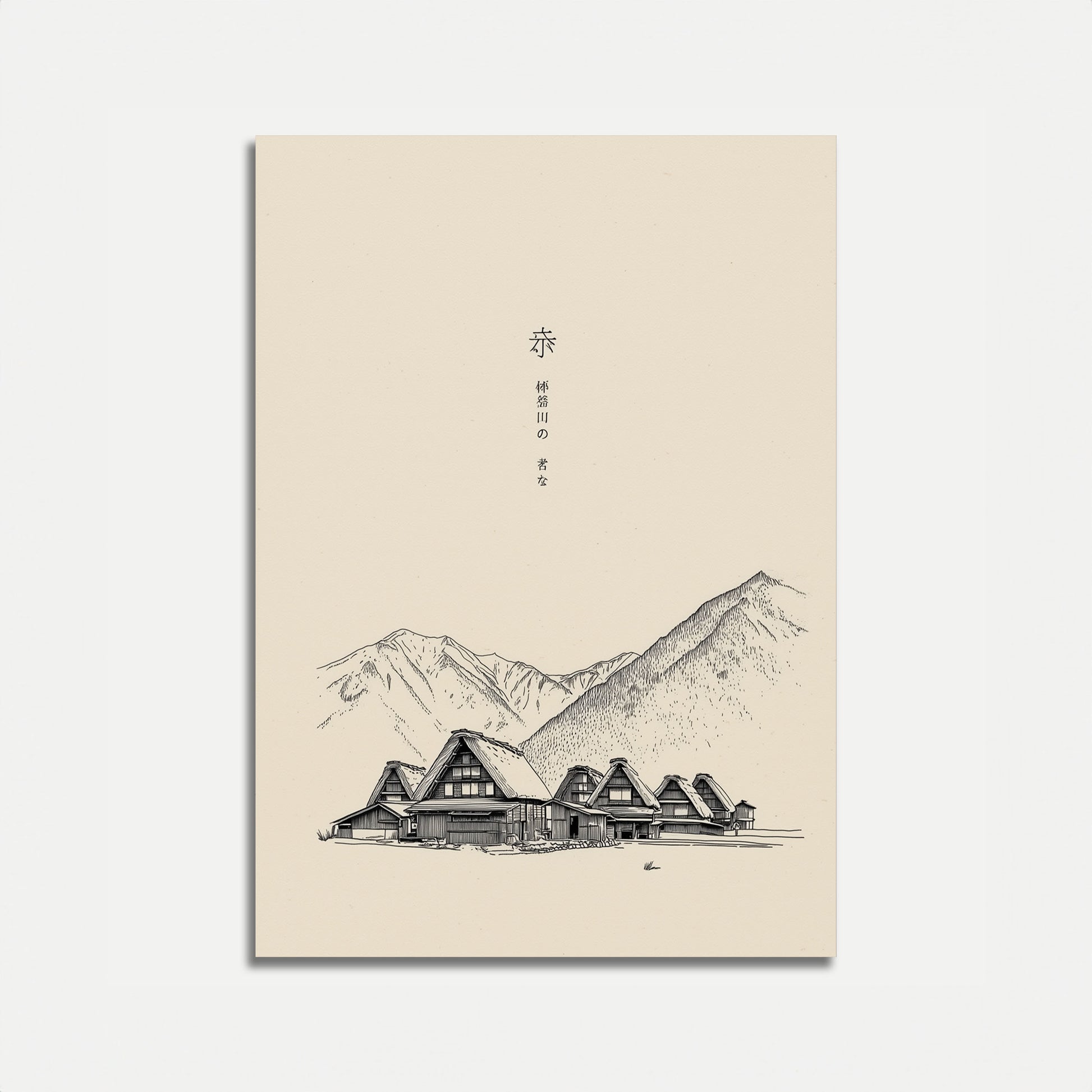 Experience the serene beauty of traditional Japanese mountain architecture with this stunning illustration of Shirakawa-go. The detailed sketch captures the iconic gassho-zukuri farmhouses nestled against dramatic snow-capped mountains, creating a tranquil scene that transports you to the heart of rural Japan. Delicate lines and a minimalist color palette evoke the timeless charm of this historic UNESCO World Heritage site.
