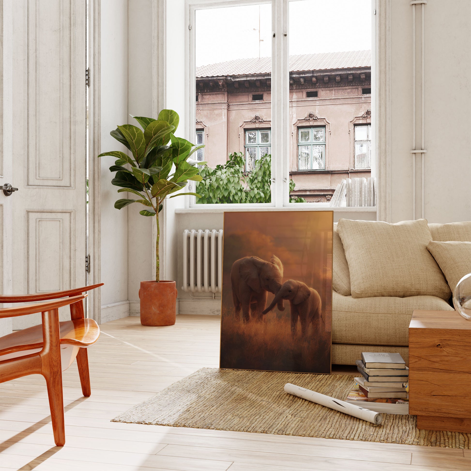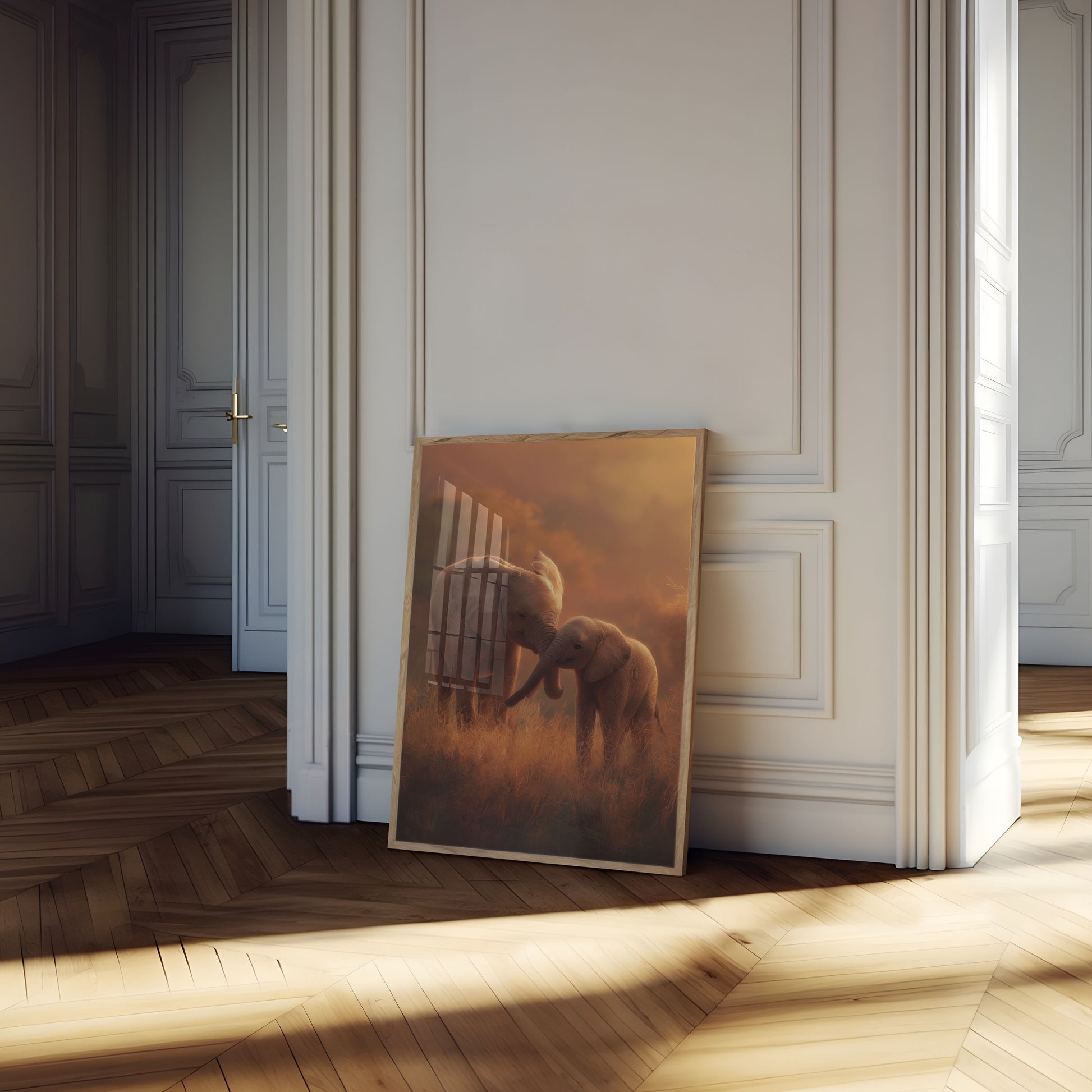 Immerse yourself in the golden warmth of this breathtaking elephant portrait, where two young elephants share an intimate connection amidst a dreamy, sun-drenched landscape. The soft, ethereal light bathes their textured skin in rich amber tones, capturing a precious moment of companionship and gentleness in the wild. Every delicate detail and subtle emotion radiates from this stunning artwork, inviting viewers into a world of pure, serene beauty.