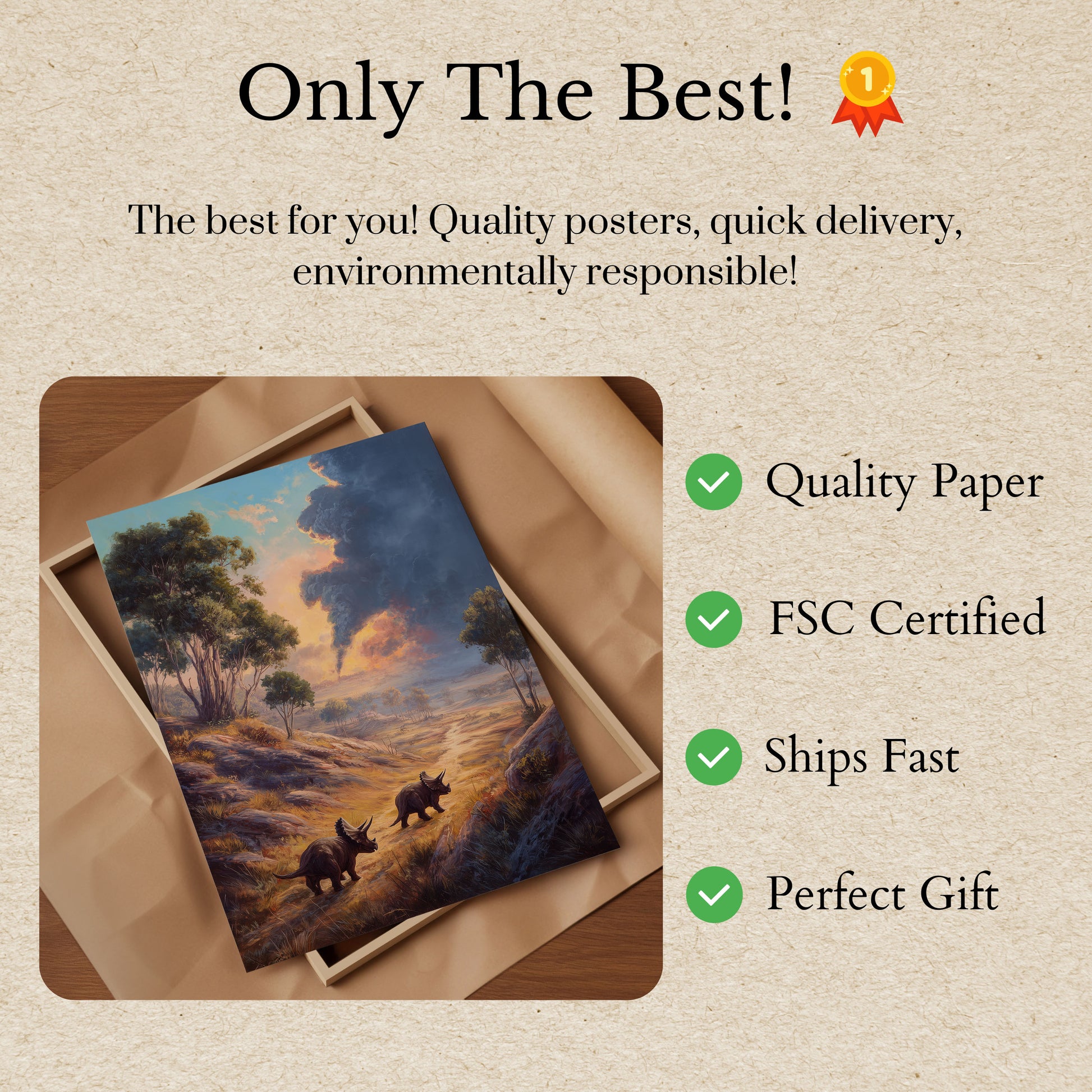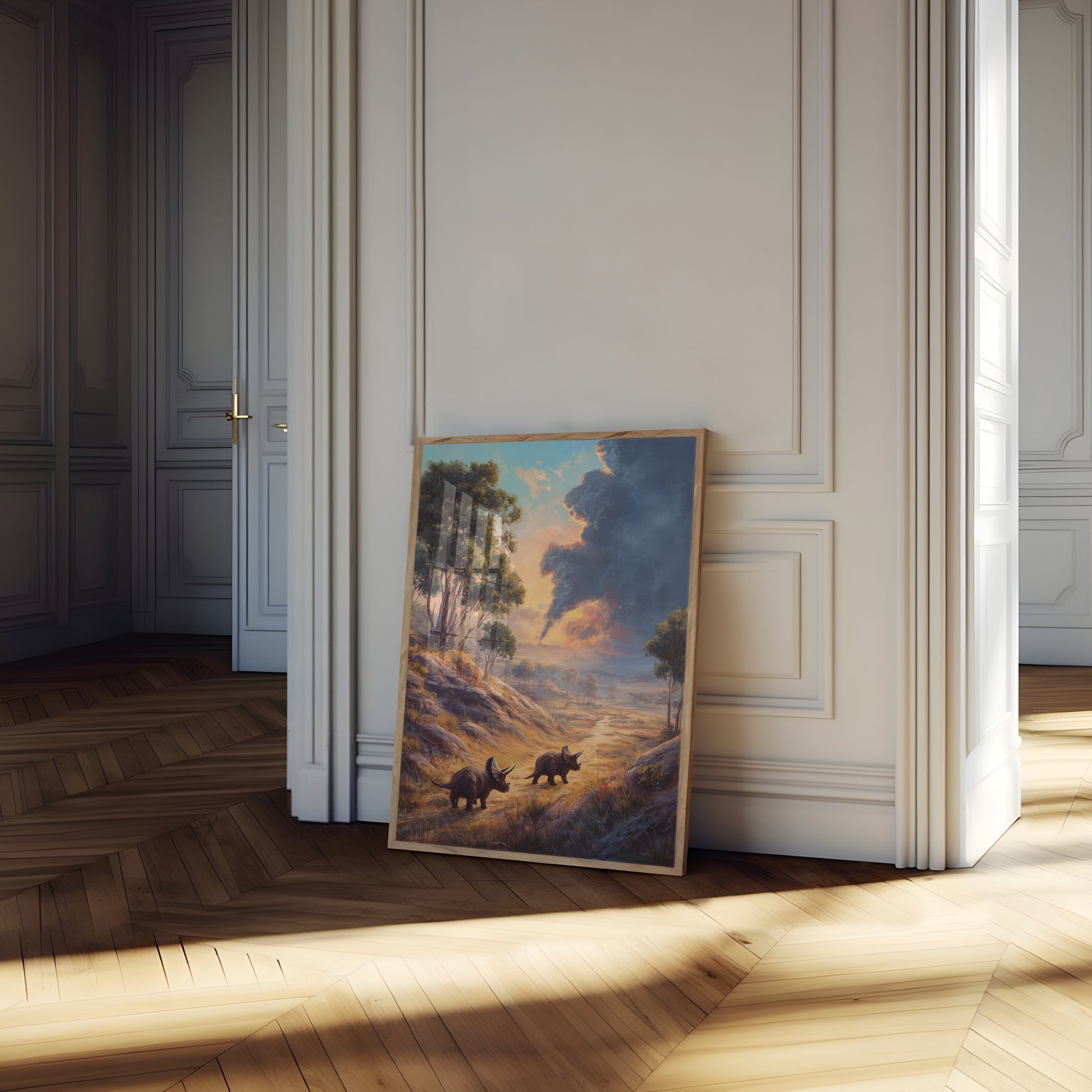 Immerse yourself in this breathtaking prehistoric scene where two majestic triceratops traverse a golden grassland under a dramatic sky of billowing smoke and fiery clouds. The painting captures a moment of serene drama, with ancient trees framing rocky terrain and distant flames creating an apocalyptic backdrop that speaks to the raw power of nature and prehistoric survival. Rich earth tones and luminous sky create a sense of epic storytelling that draws the viewer into this prehistoric world.