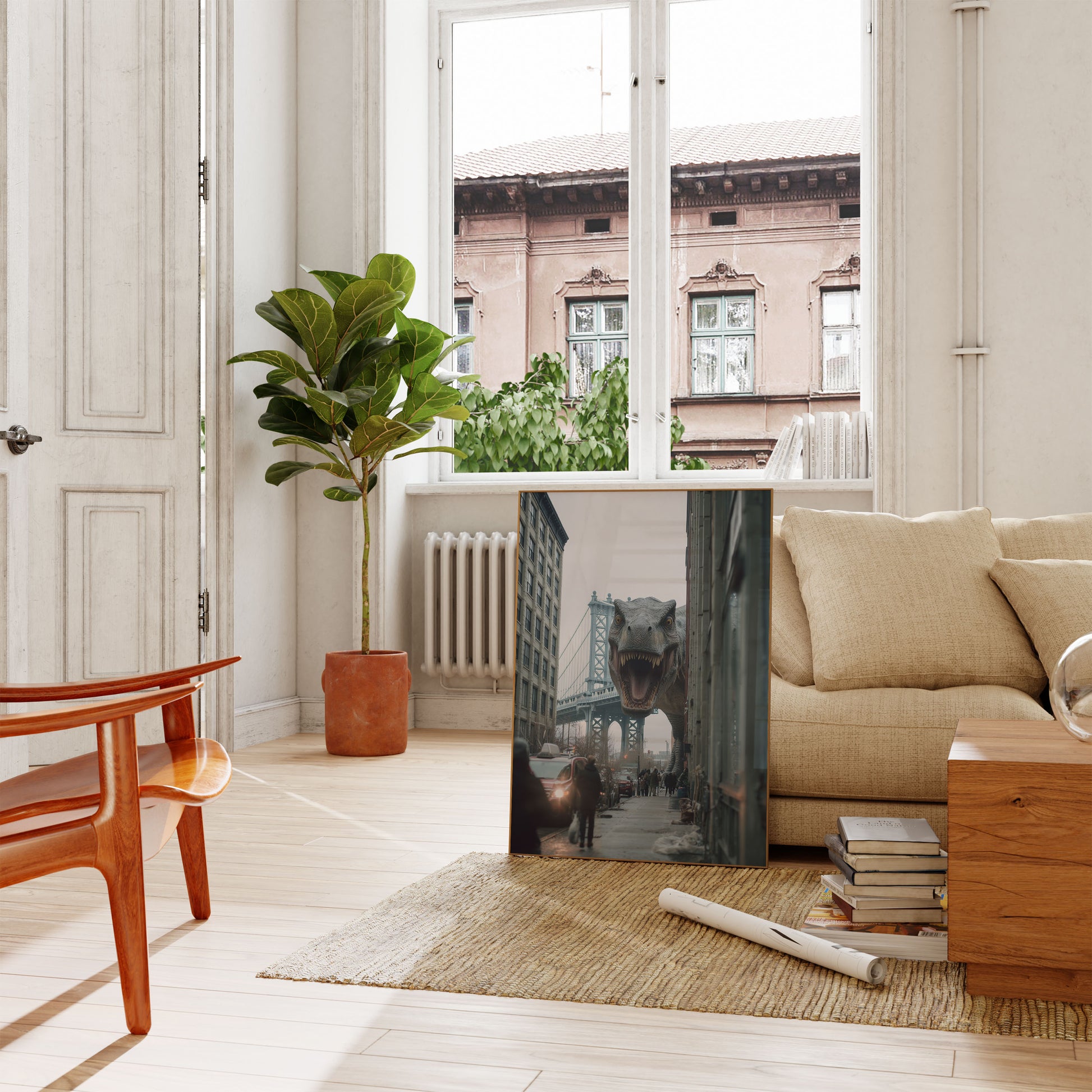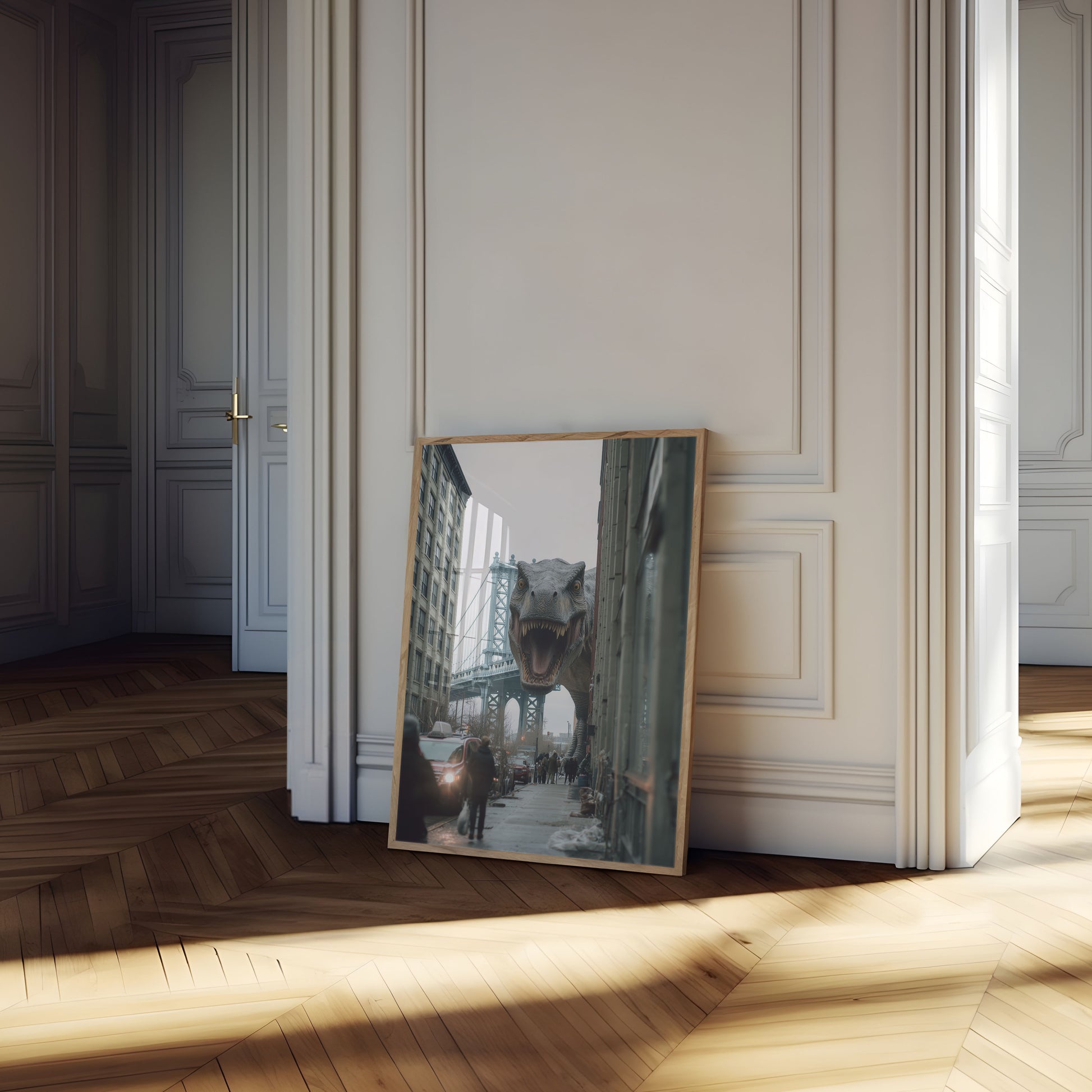 Experience the ultimate urban prehistoric collision in this stunning digital artwork featuring a massive T-Rex emerging between New York City buildings with the iconic Manhattan Bridge in the background. The dramatic scene captures an impossible moment of prehistoric chaos in a modern cityscape, with realistic details that make the impossible seem momentarily believable. Moody gray tones and precise architectural framing create a sense of cinematic tension and surreal adventure.