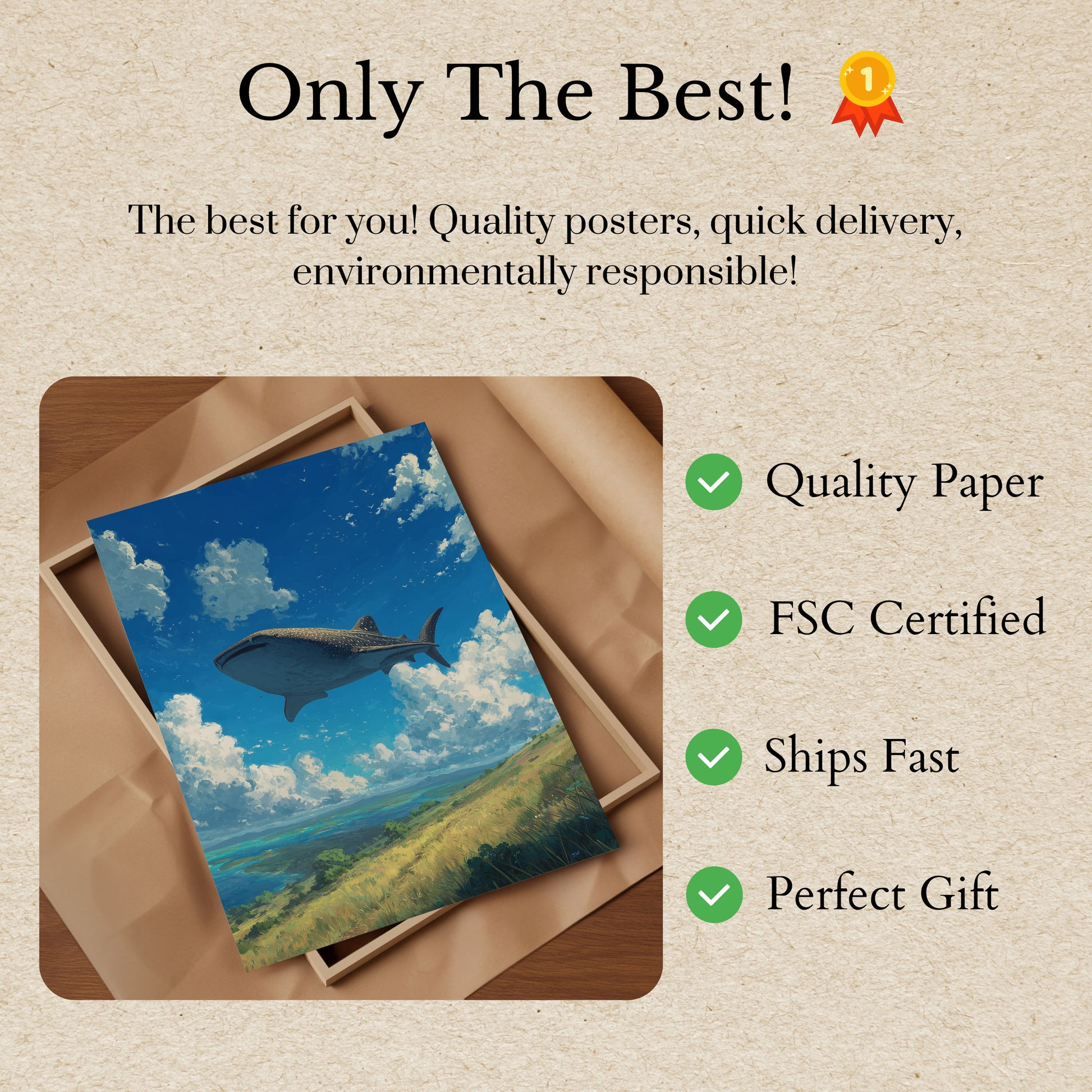 Soar into a dreamlike landscape where a majestic whale shark glides through billowing clouds against a vibrant azure sky. This surreal artwork blends the serene underwater world with an expansive terrestrial vista, creating a breathtaking scene of unexpected harmony and wonder. The gentle giant floats above rolling green hills and a shimmering blue landscape, inviting viewers into a magical realm where nature defies imagination.
