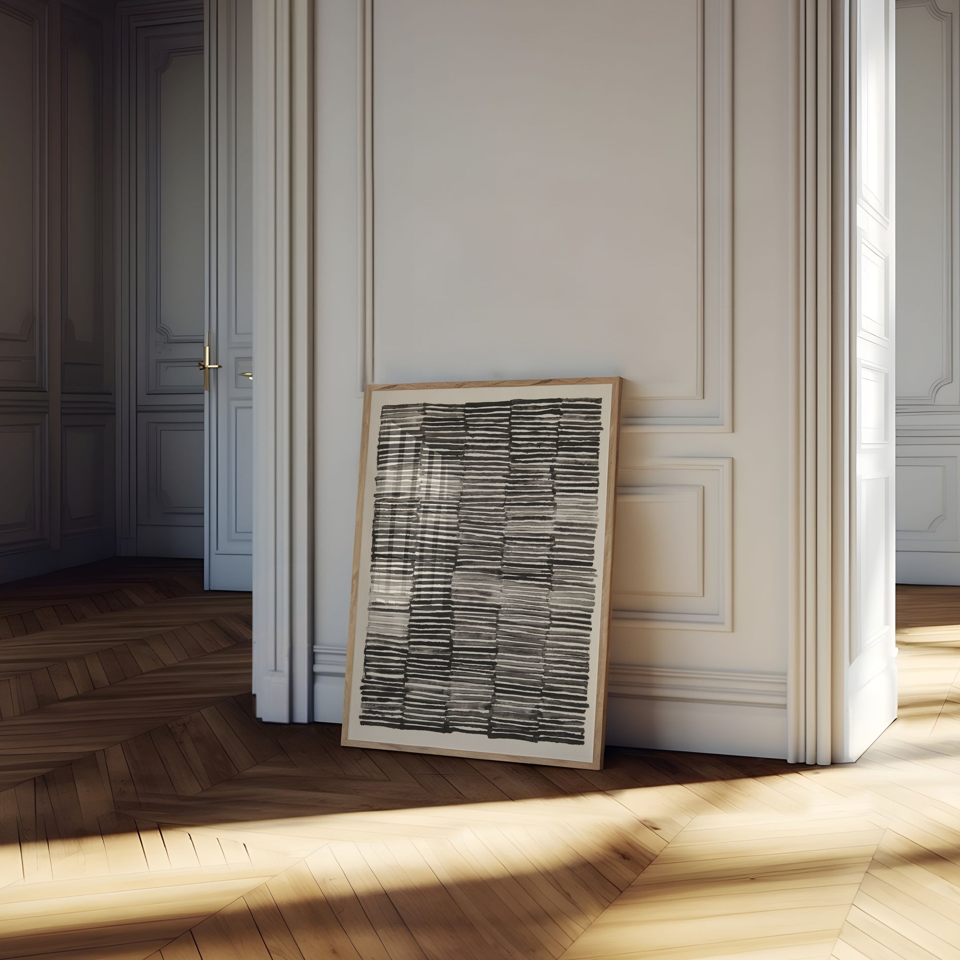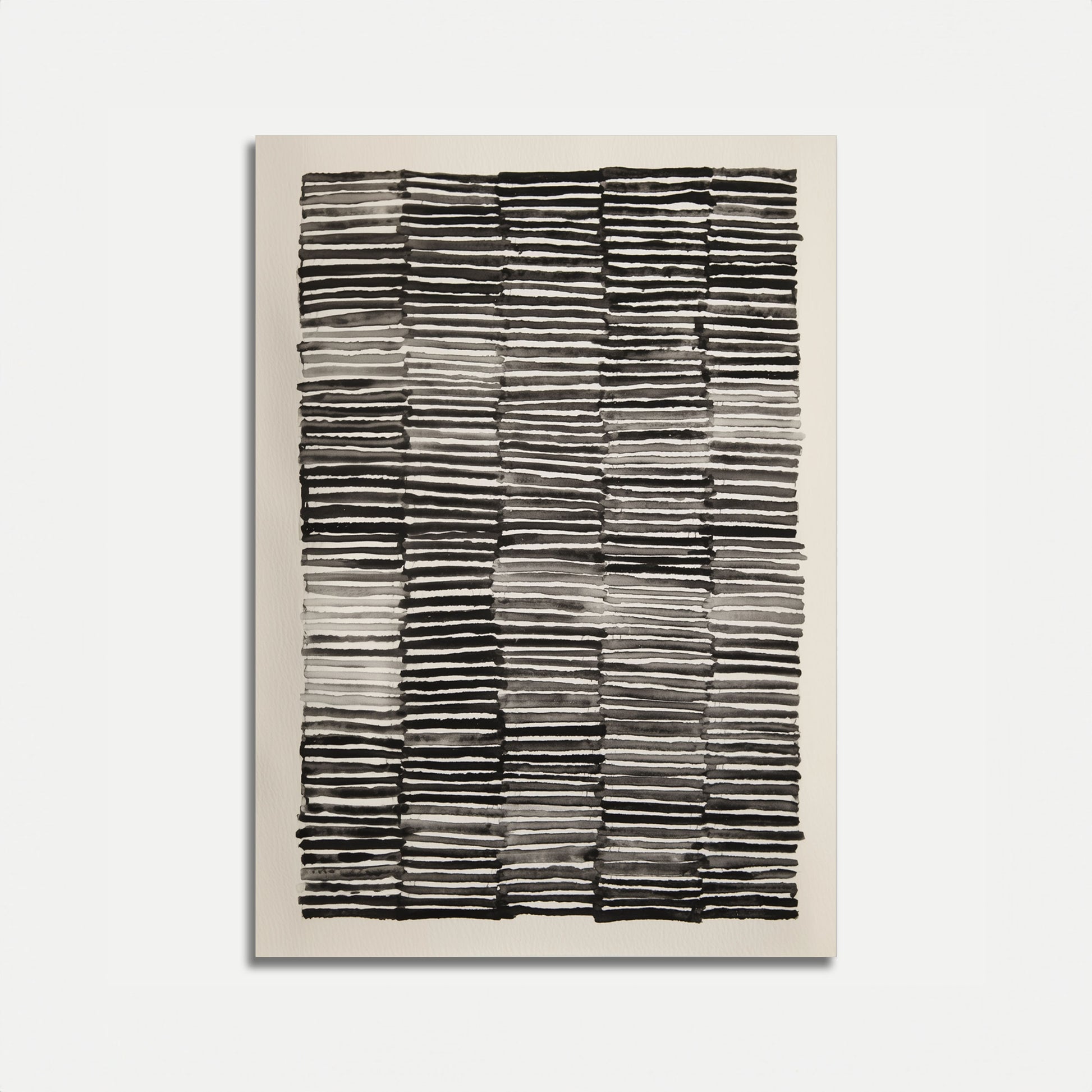 A mesmerizing monochromatic artwork featuring rhythmic horizontal lines in varying shades of black and gray. The precise, hand-drawn watercolor lines create a dynamic visual texture that shifts and undulates across the poster, inviting the viewer into a hypnotic geometric landscape. Each brushstroke reveals subtle variations in tone and intensity, generating a sense of movement and depth.