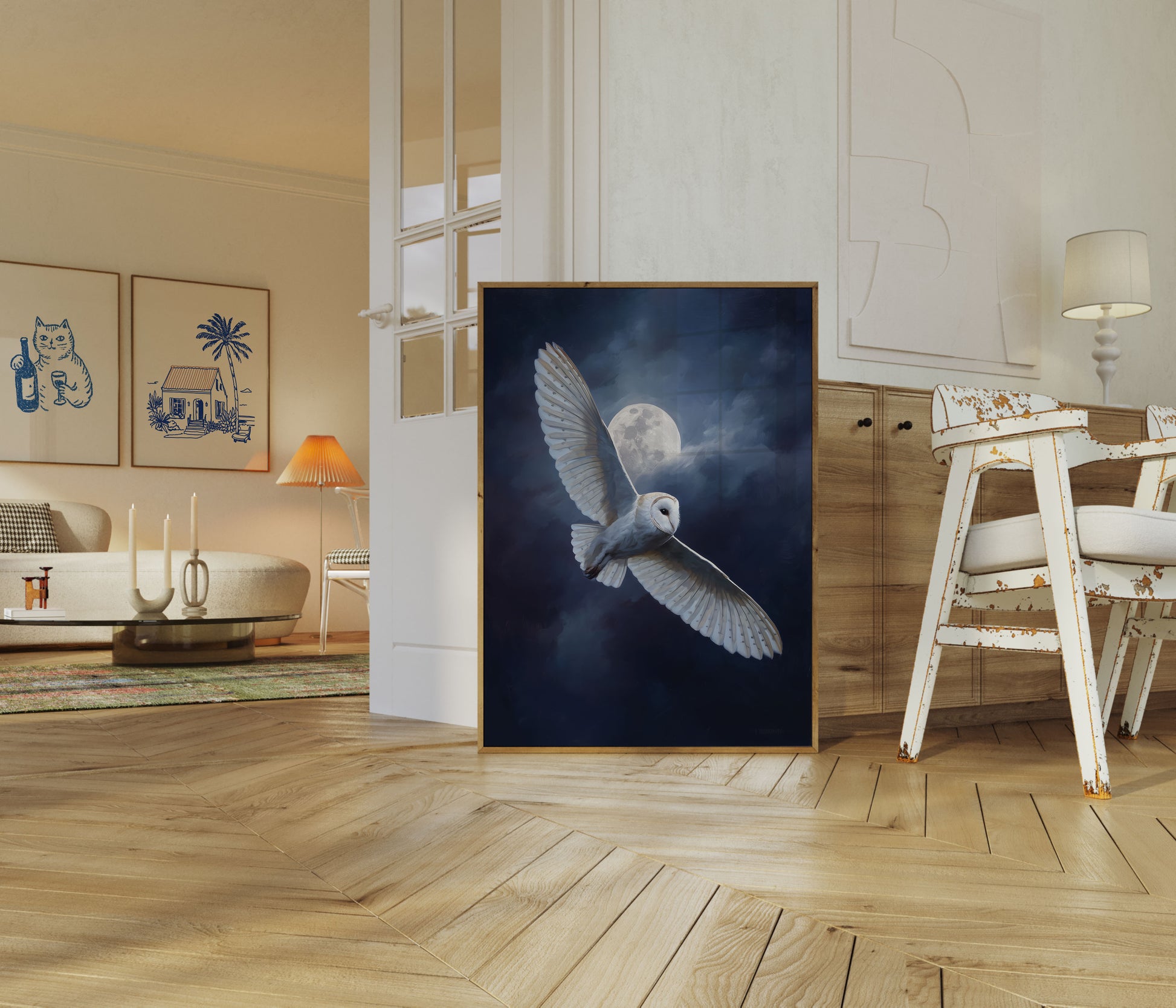 Witness the magical grace of a barn owl soaring through a moonlit night sky in this stunning artwork. With its pristine white wings spread wide and a luminous full moon glowing softly behind it, this piece captures the serene beauty and mystery of nocturnal wildlife. The dramatic contrast between the dark stormy clouds and the owl's ethereal white plumage creates a captivating atmosphere that brings peaceful elegance to any room.