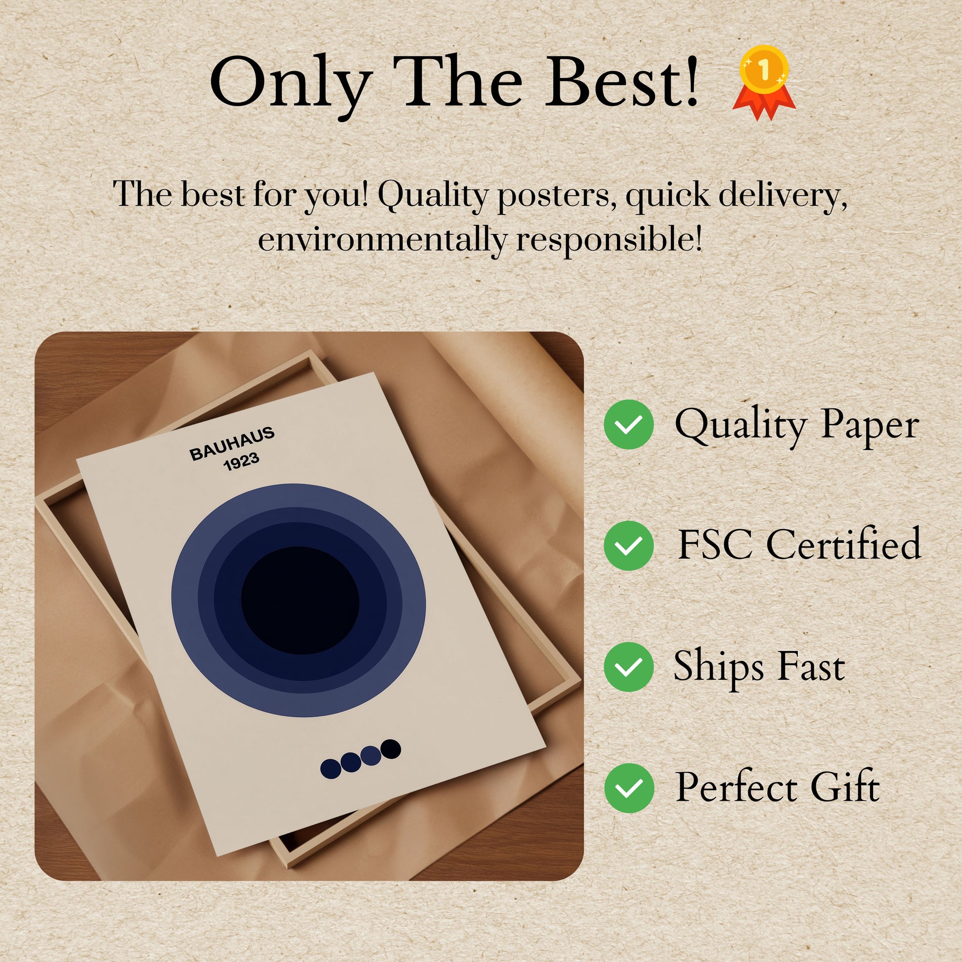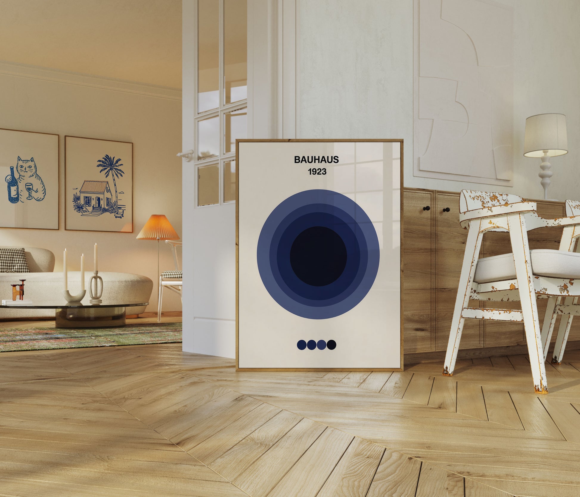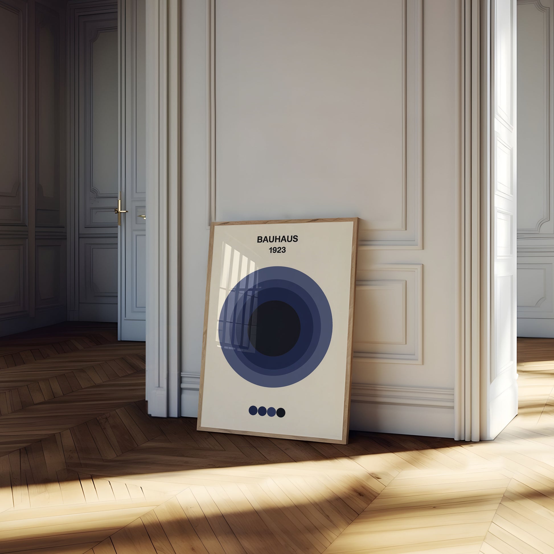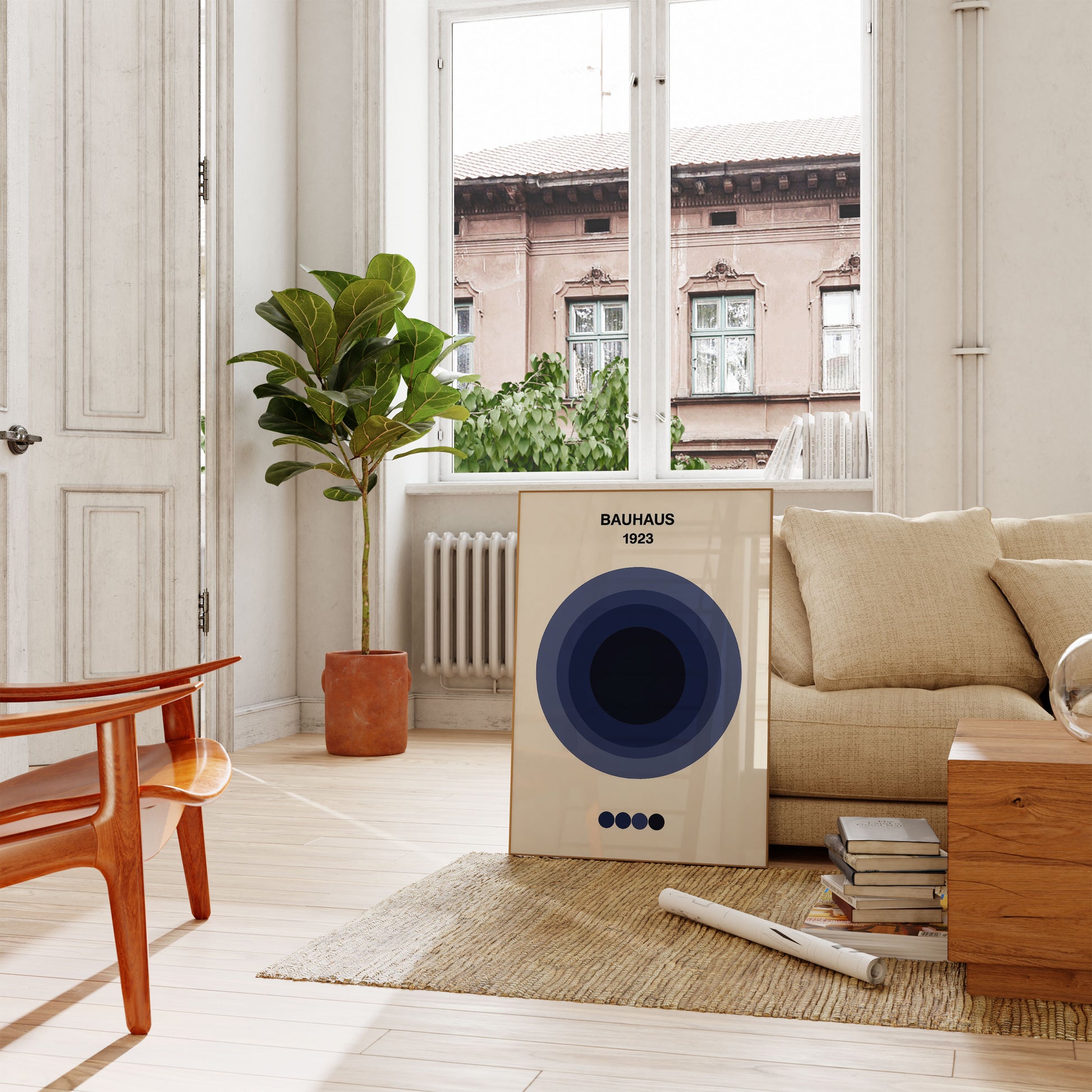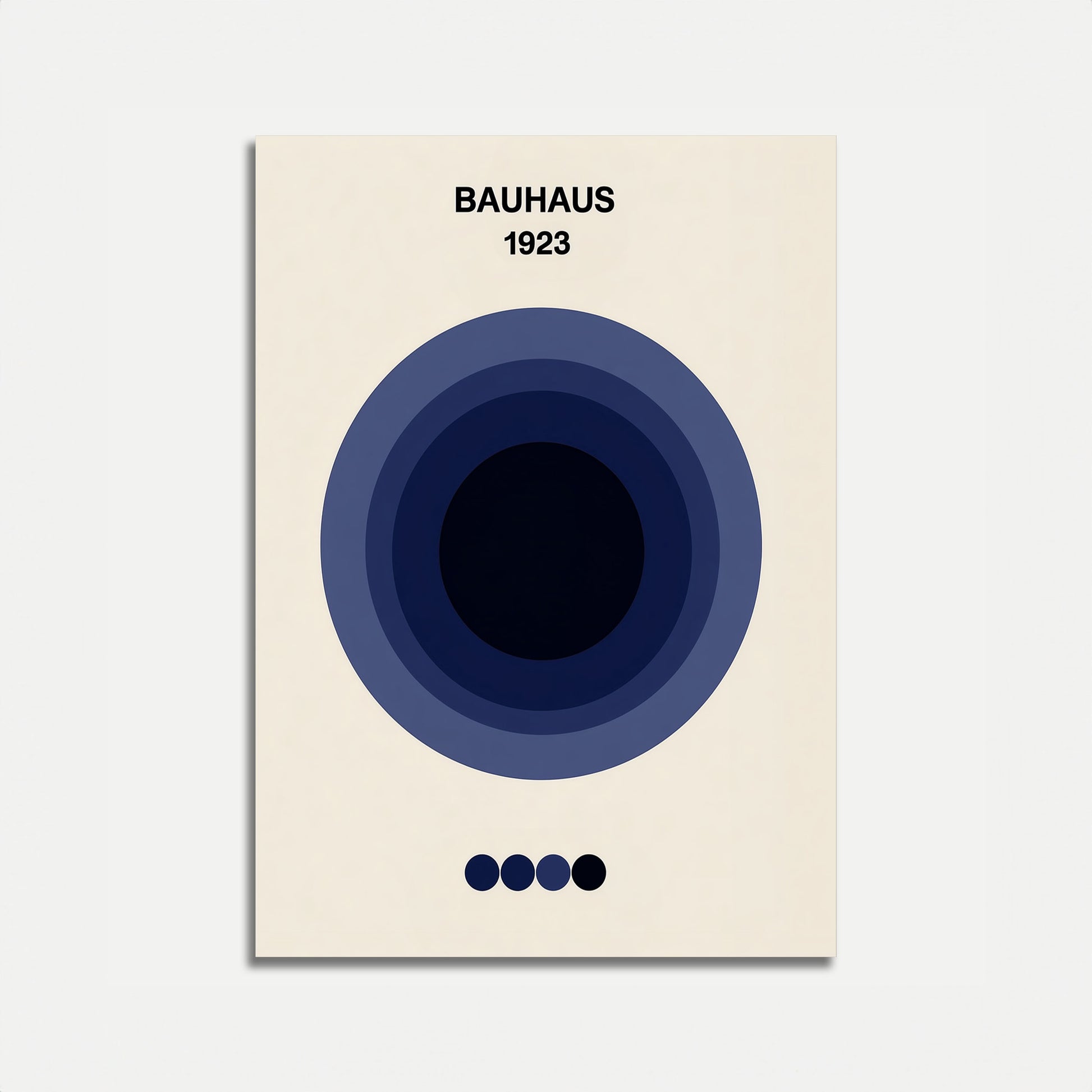 Dive into the mesmerizing world of Bauhaus design with this iconic 1923 geometric masterpiece. Featuring deep, layered shades of blue radiating from a central black core, this poster captures the essence of minimalist architectural and design principles. The concentric circles create a hypnotic visual rhythm that draws the viewer into a contemplative, meditative state.