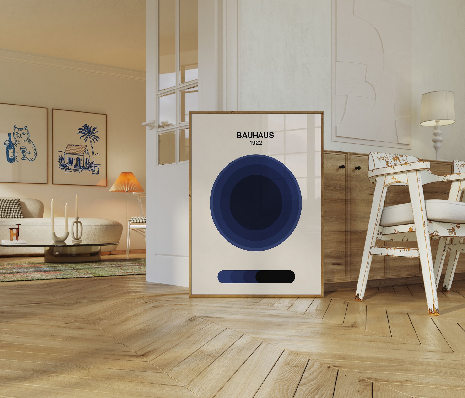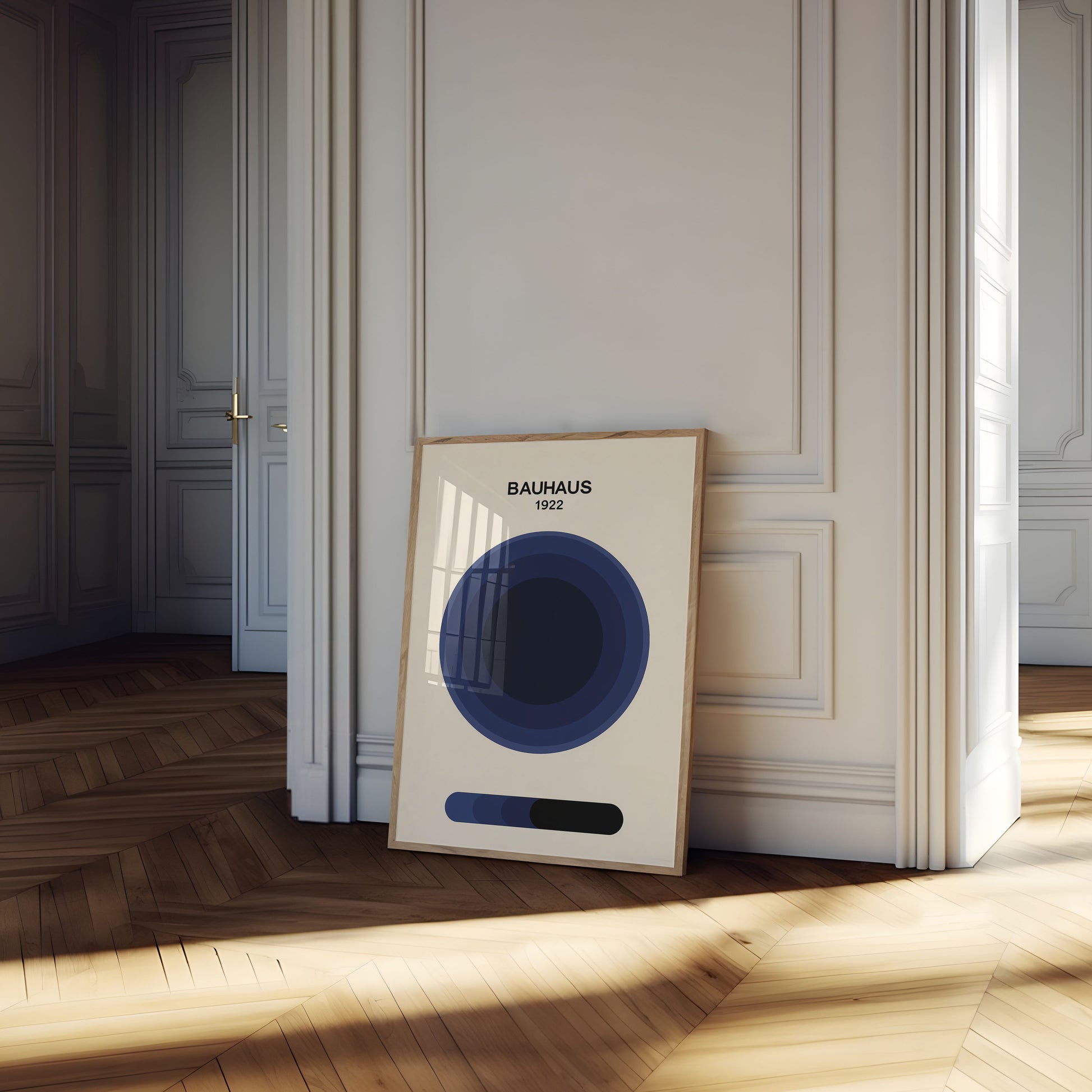 A mesmerizing exploration of geometric minimalism from the iconic Bauhaus movement of 1922. This poster captures the essence of pure design with concentric circles in deep, layered shades of blue, creating a hypnotic visual rhythm that draws the viewer into its elegant simplicity. The stark composition showcases the Bauhaus philosophy of form following function, with a clean, meditative aesthetic that transforms any space.