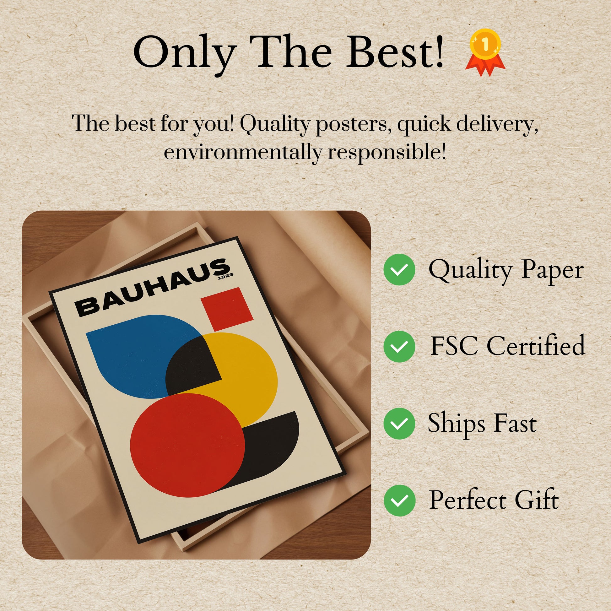 A stunning vintage Bauhaus poster from 1923 that captures the essence of modernist design. Bold geometric shapes in primary colors - blue, red, yellow, and black - dance across a cream background, creating a dynamic and harmonious composition. This iconic artwork represents the revolutionary design philosophy of the Bauhaus movement, celebrating simplicity, abstraction, and pure visual form.