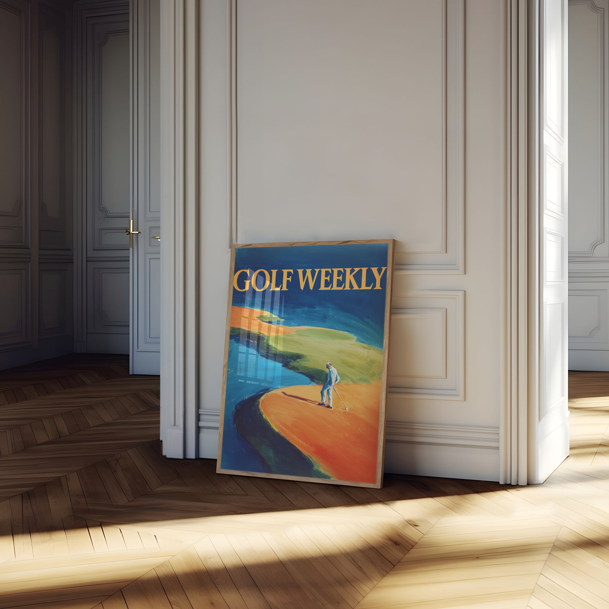 A vibrant, abstract interpretation of a golfer playing on a sweeping coastal course. Rich blues, oranges, and greens create a dynamic landscape that captures the essence of golf's scenic beauty. The lone golfer stands in sharp contrast, symbolizing the solitary focus of the sport against a breathtaking natural backdrop.
