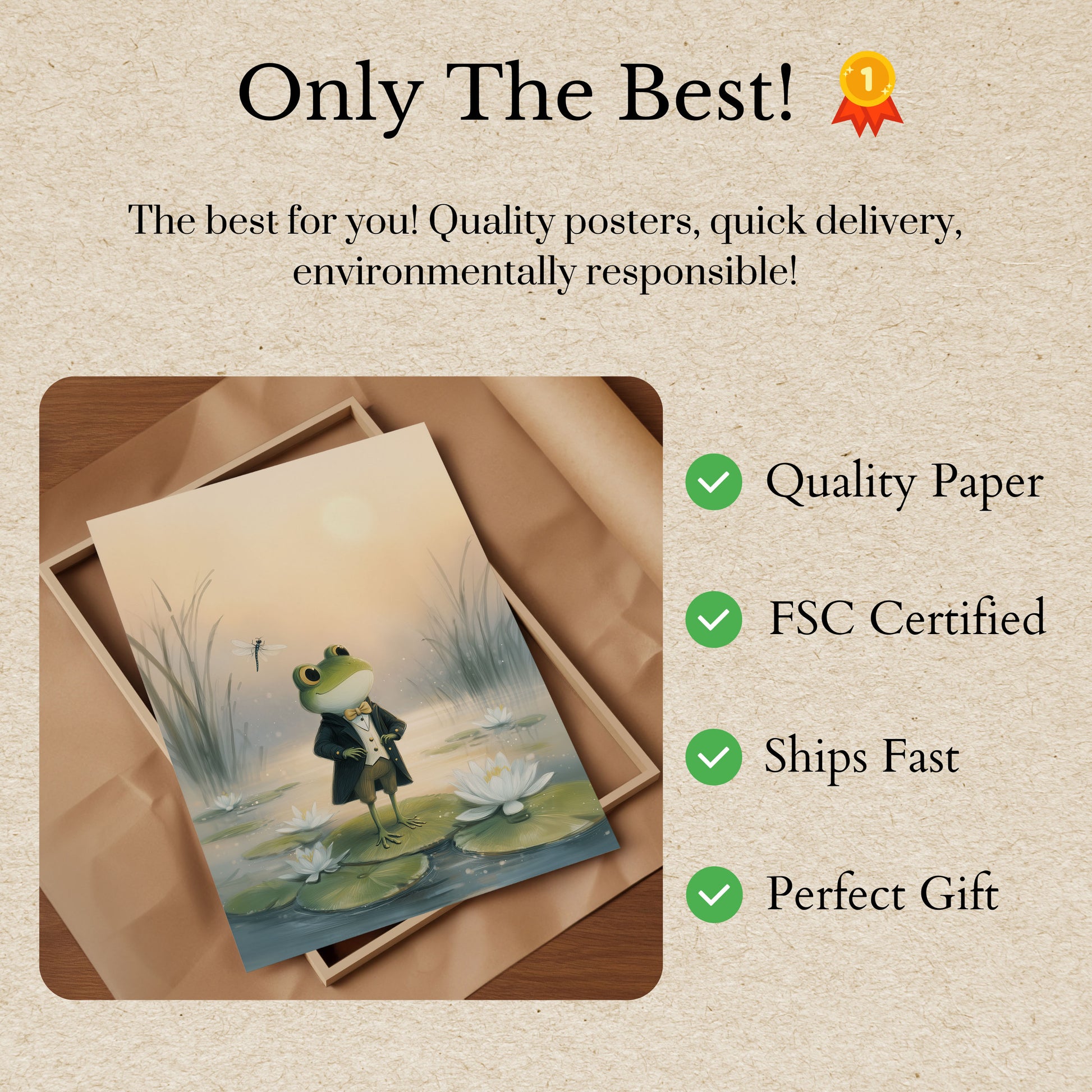Step into an enchanting world where a charming frog gentleman stands elegantly on a lily pad, dressed in a sophisticated tuxedo with a golden bow tie. A delicate dragonfly hovers nearby, adding a touch of whimsy to this serene wetland scene bathed in soft, dreamy light. The watercolor-like illustration captures the magical essence of a tranquil pond at dawn, with white lotus flowers and misty reeds creating a delicate, ethereal backdrop.