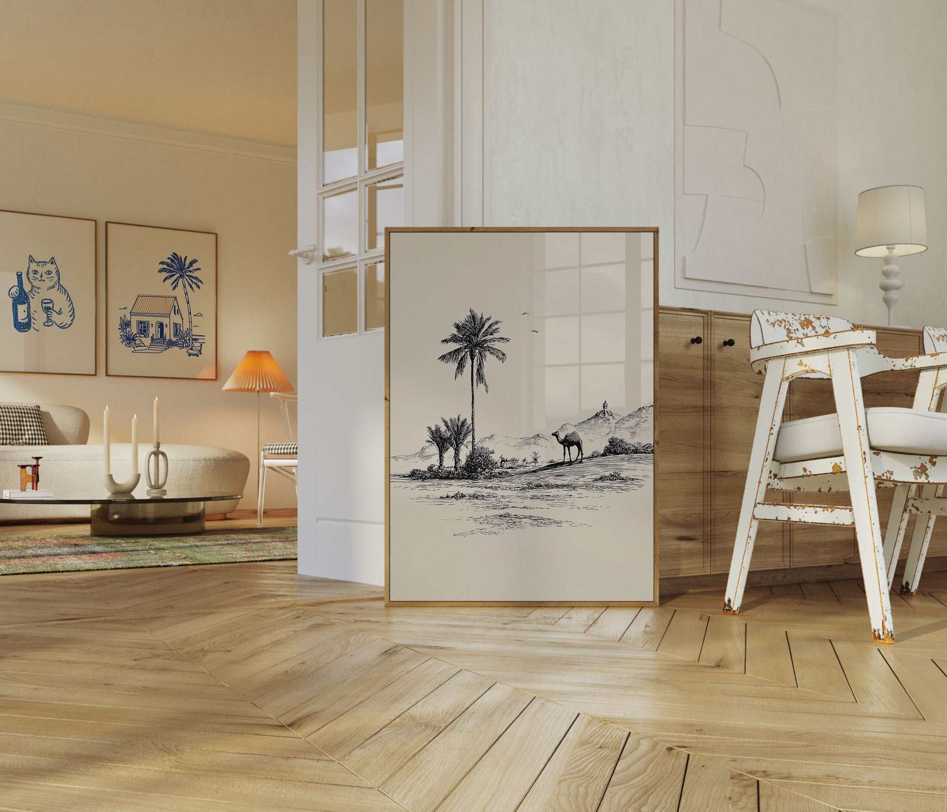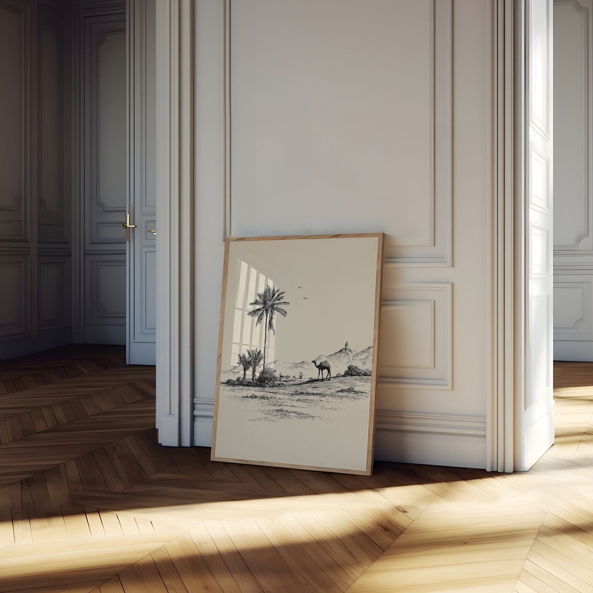 This stunning black and white sketch captures the serene beauty of a desert oasis, where a solitary camel stands gracefully beside towering palm trees. The detailed line work creates a timeless, contemplative mood that transports you to an exotic landscape bathed in calm sunlight. With its minimalist aesthetic and elegant composition, this desert scene evokes a sense of wanderlust and peaceful solitude, making it a perfect addition to any room seeking a touch of adventure and tranquility.
