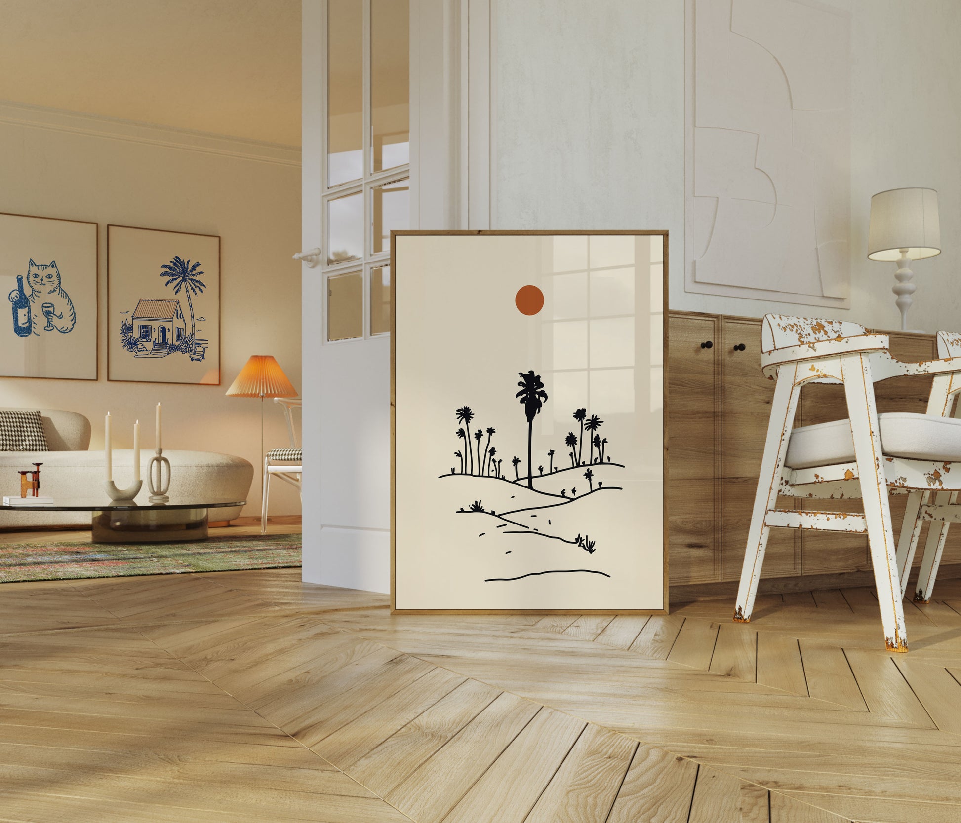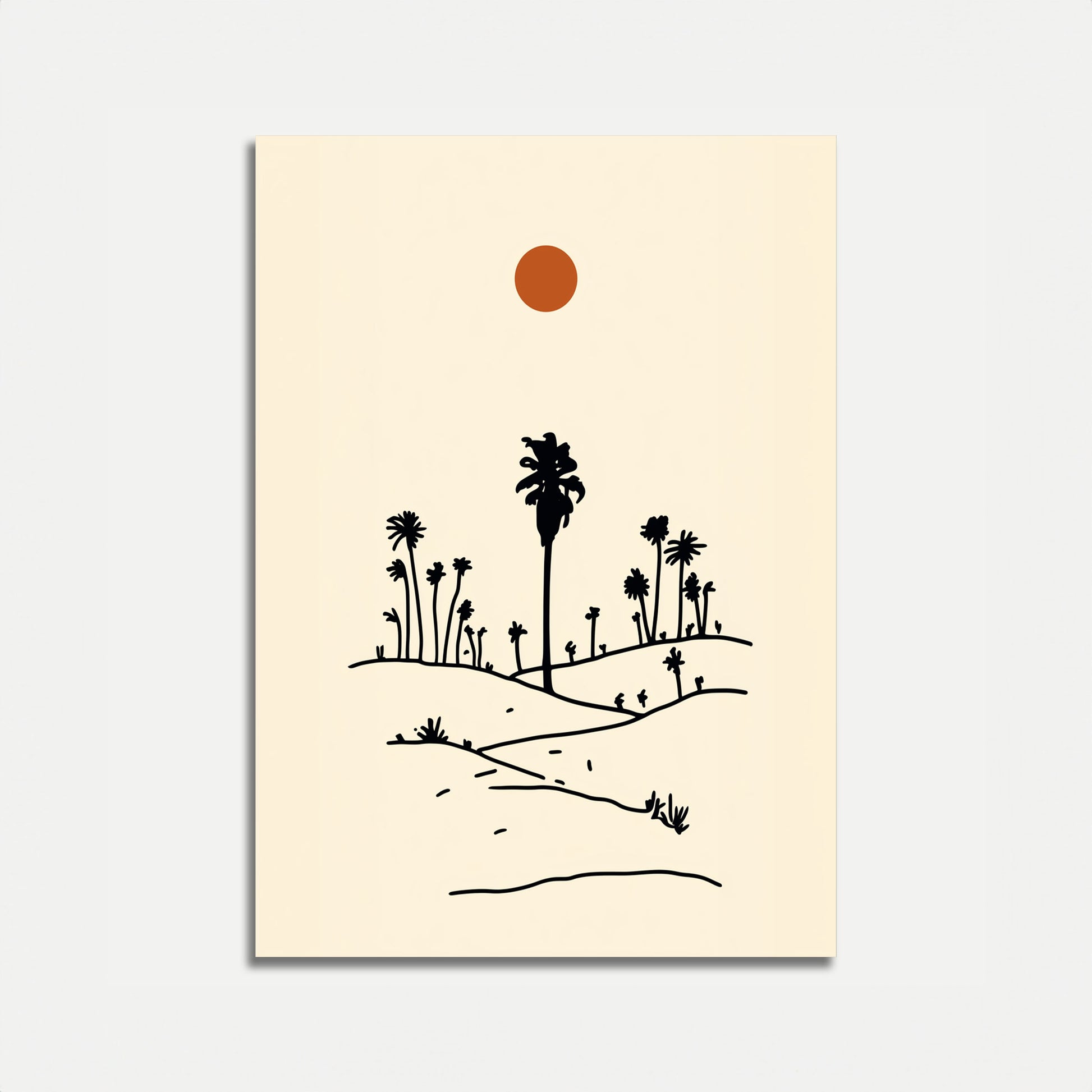 This stunning minimalist illustration captures the serene beauty of a desert landscape under a warm, glowing sun. Silhouetted palm trees and desert plants rise gracefully from rolling sand dunes, creating a peaceful and contemplative scene. The simple black-and-white line work against a soft cream background evokes a sense of calm and natural tranquility, making it perfect for anyone who loves desert landscapes, botanical art, or minimalist aesthetic design. The warm terracotta sun adds a touch of warmth and life to this desert oasis scene, creating a perfect balance between simplicity and visual interest.