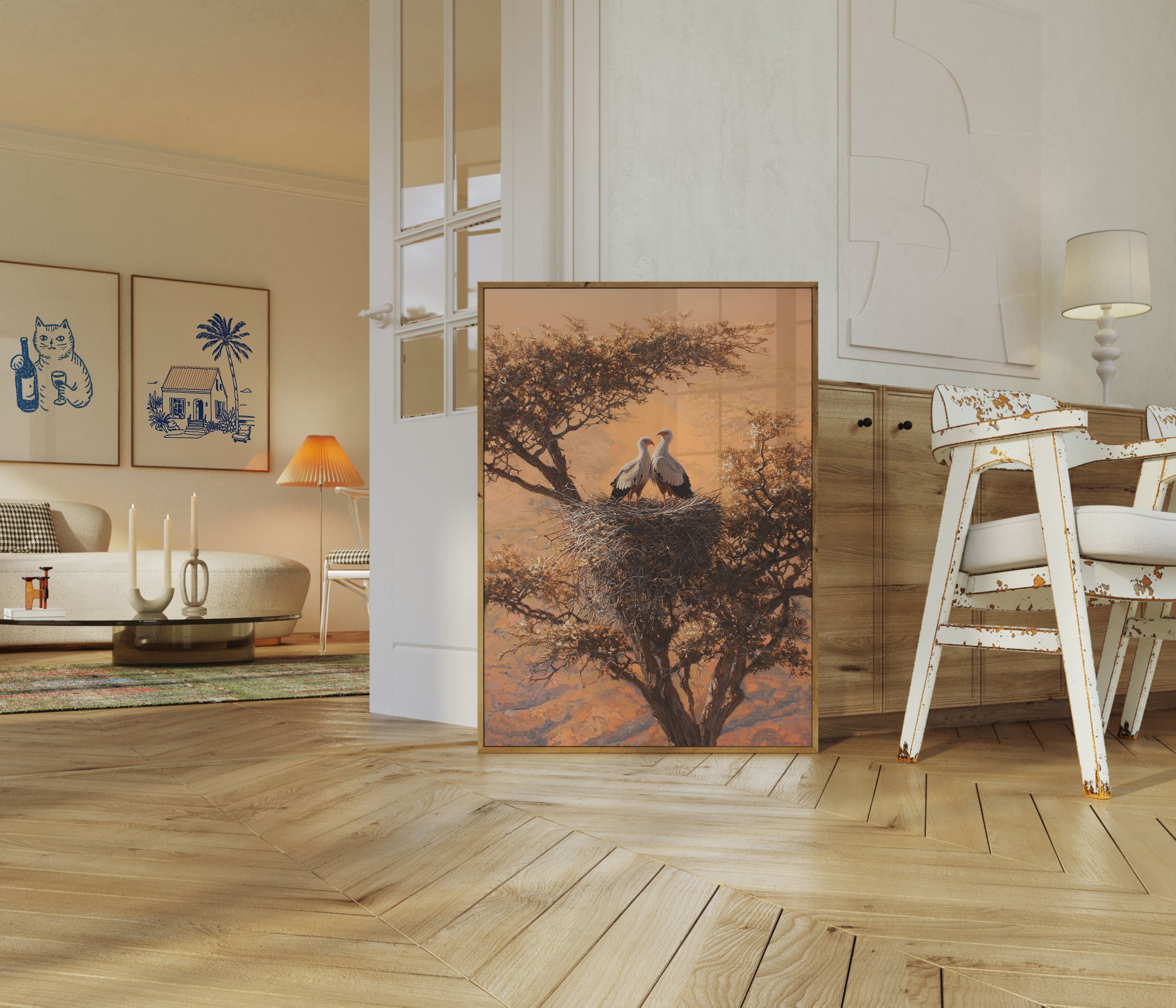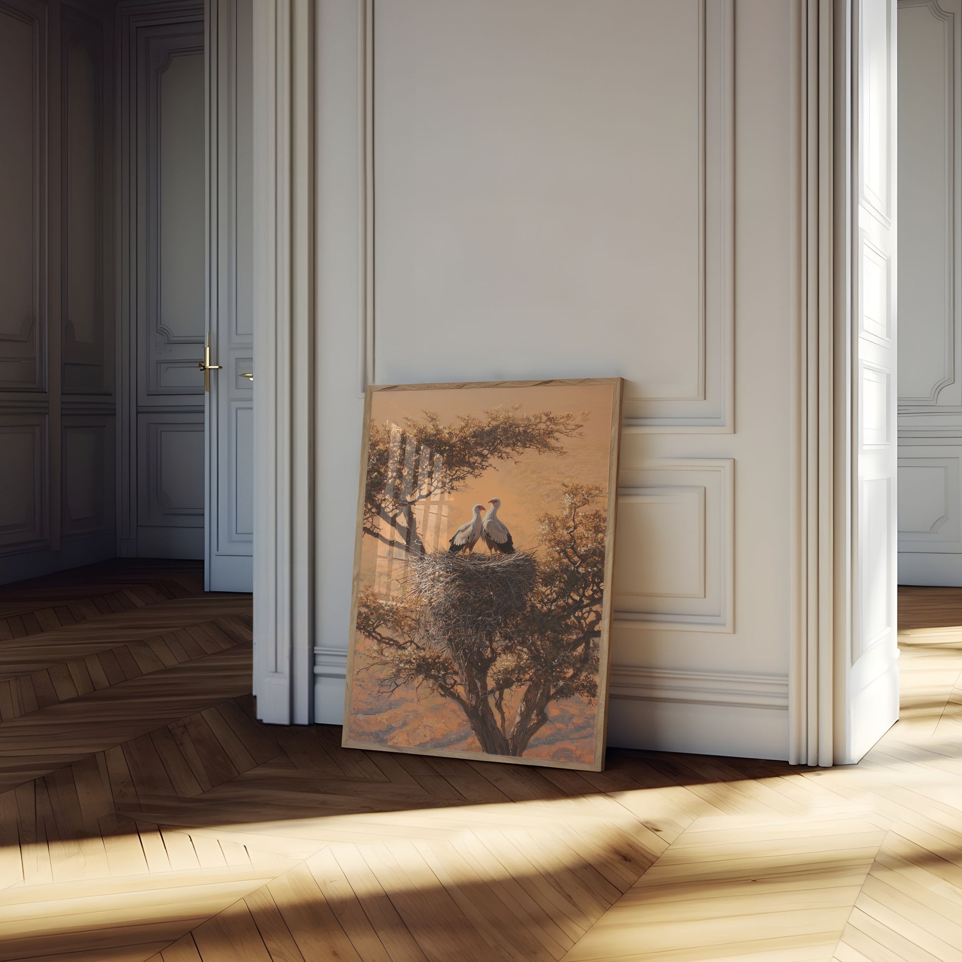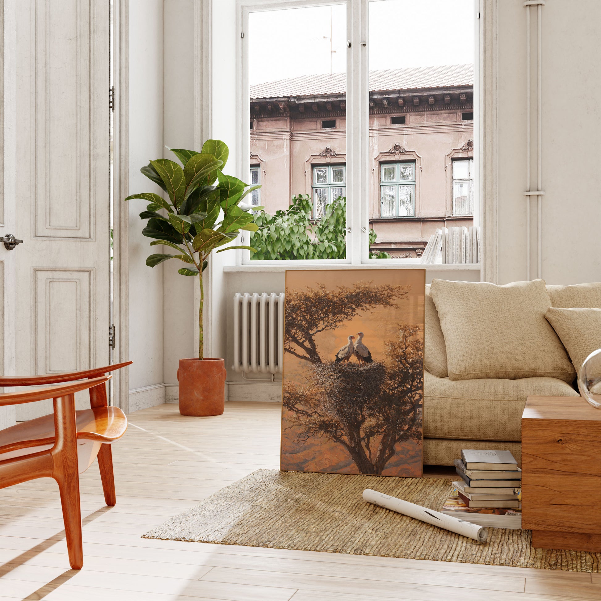 Two majestic bald eagles perch together in their expansive nest, set against a breathtaking golden-orange sky. This stunning artwork captures a moment of serene togetherness, with the birds' distinctive white heads and powerful frames rendered in beautiful detail against the warm, desert-like landscape. The composition perfectly balances the intricate branches of the nest with the gnarled tree trunk below and sparse vegetation surrounding the scene, creating a sense of harmony between these magnificent creatures and their natural habitat. The golden, earthy color palette evokes warmth and timeless beauty, making this an inspiring piece for anyone who appreciates wildlife and nature's most iconic birds.
