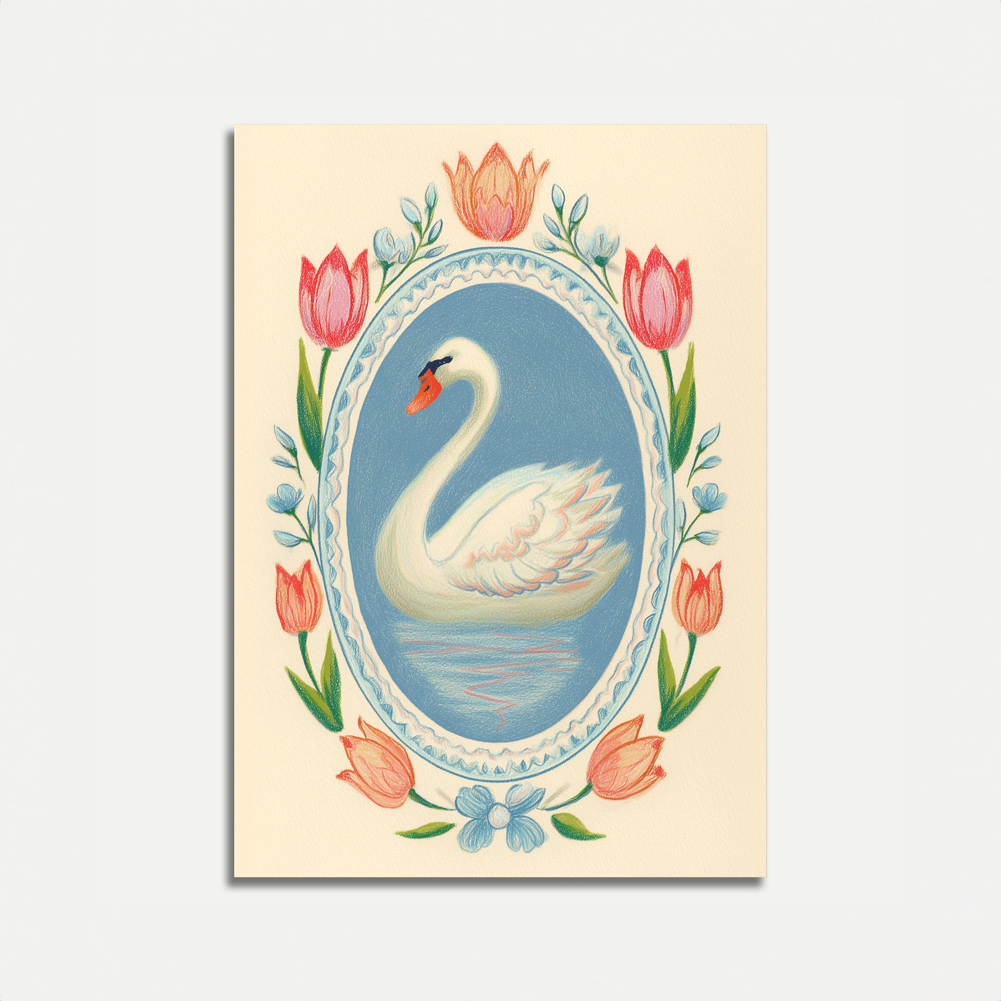 A delicate and charming illustration of a graceful white swan nestled in a soft blue oval frame, surrounded by vibrant red and pink tulips and gentle blue flowers. The artwork captures a serene moment of beauty, with the swan's elegant curves and soft coloration creating a sense of tranquility and natural elegance.