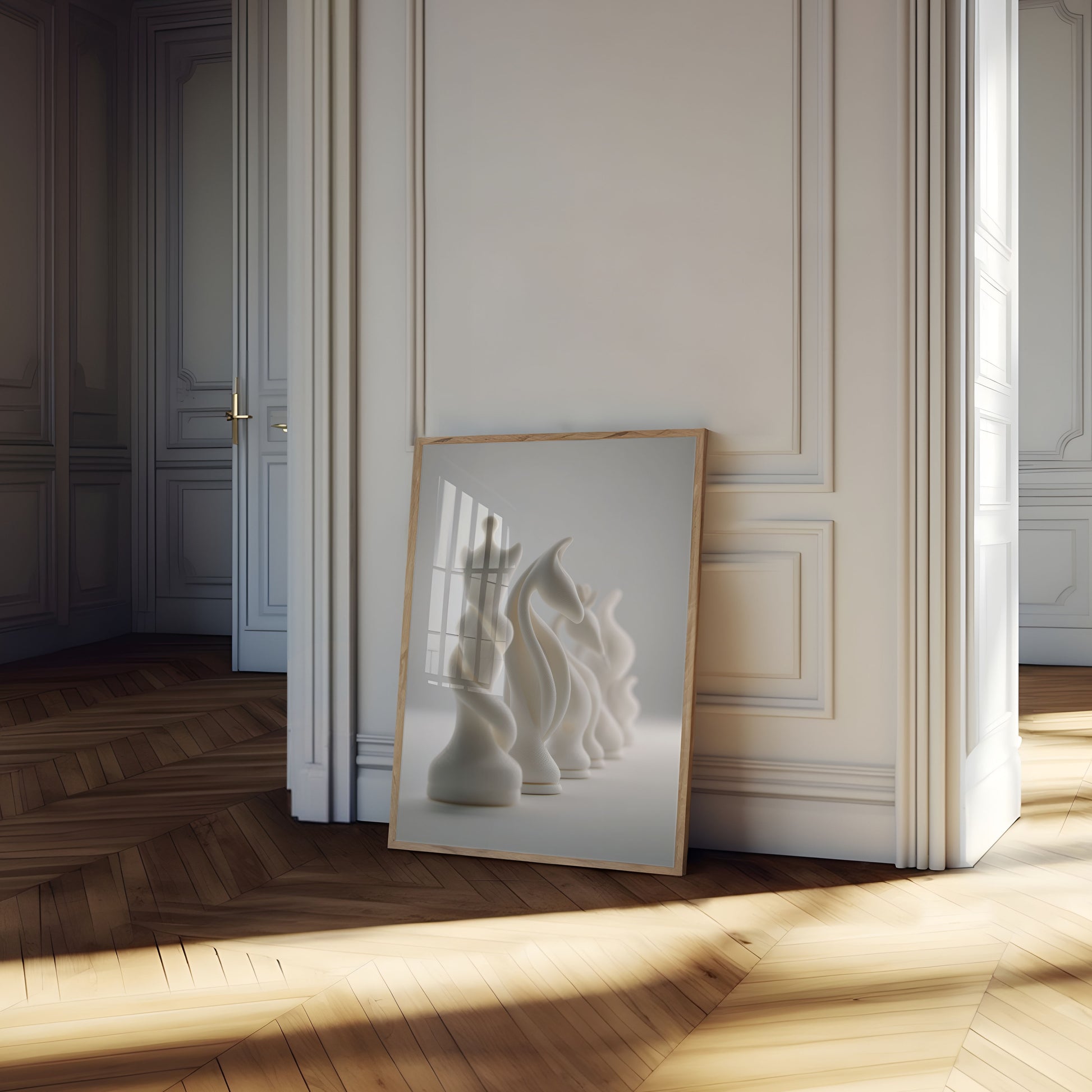 Discover the mesmerizing beauty of abstract chess design with this stunning minimalist artwork. Featuring flowing, sculptural white chess pieces arranged in a graceful progression, this image captures the elegant complexity of the game's most iconic forms. Each piece seems to dance with subtle curves and organic shapes, creating a sense of movement and sophistication against a soft, neutral background.