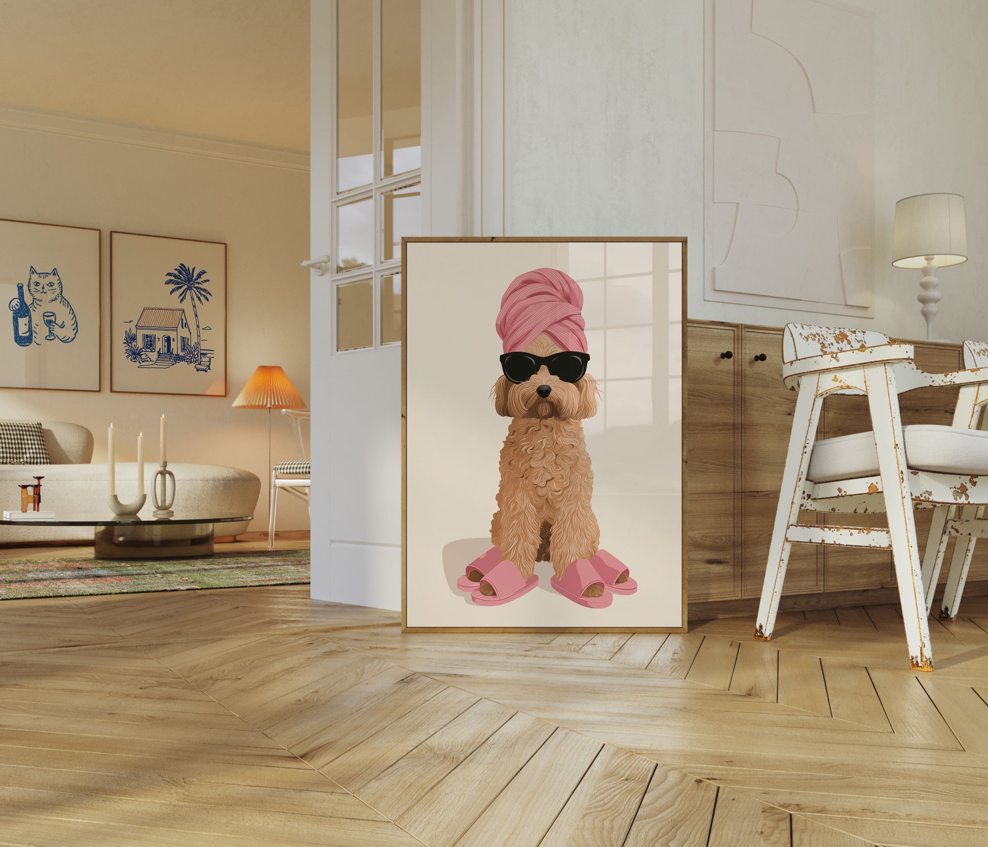 Meet the most stylish canine in town - a fluffy golden dog rocking a pink turban, sleek black sunglasses, and matching pink slides. This chic pup exudes confidence and sass, transforming an everyday pet into a fashionable icon with playful charm and attitude.