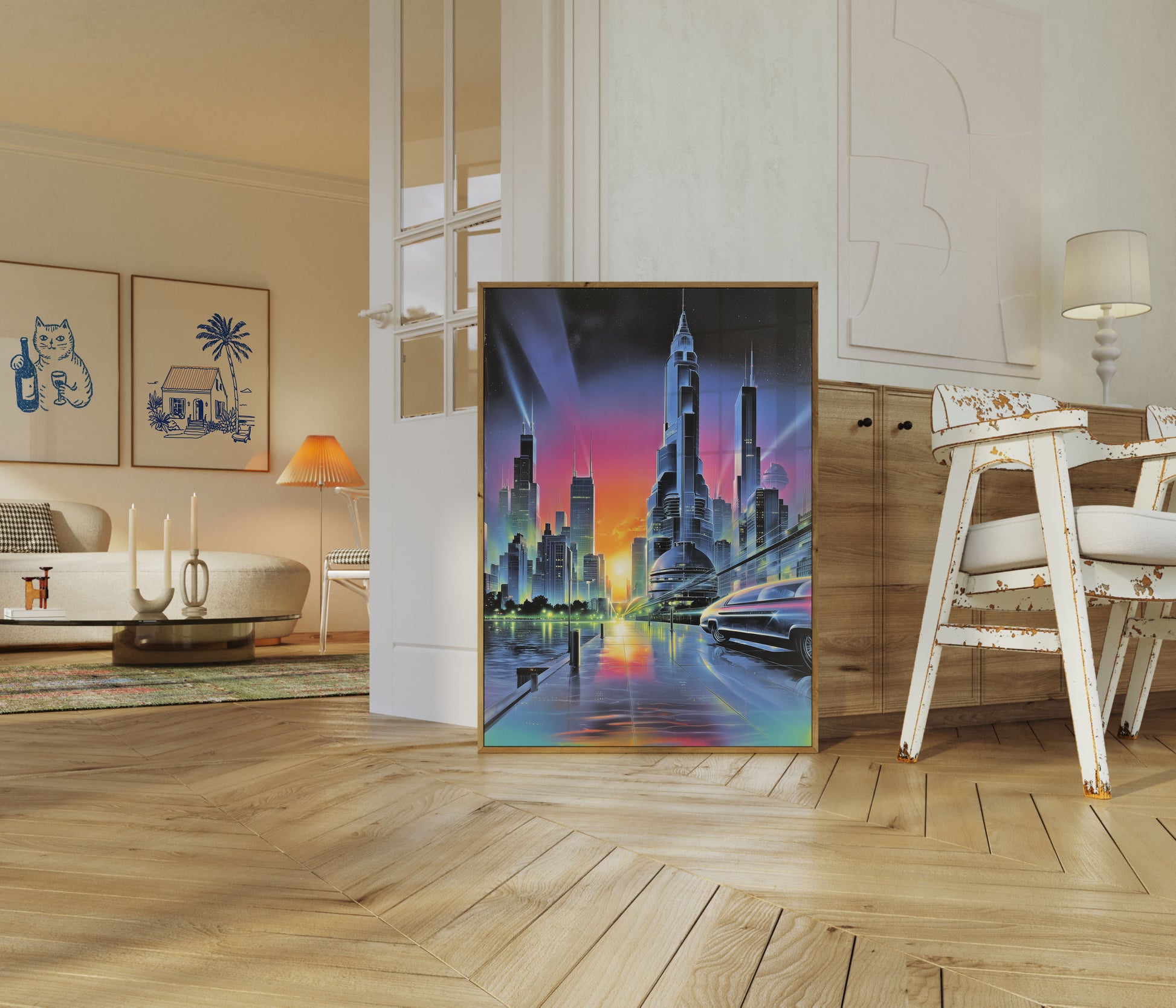 Immerse yourself in this stunning vision of a future metropolis, where sleek skyscrapers pierce a vibrant sunset sky and high-tech vehicles glide along luminous streets. The image captures a breathtaking urban landscape bathed in ethereal blues, pinks, and oranges, with architectural marvels rising against a starry backdrop. This mesmerizing artwork blends technological innovation with artistic imagination, transporting viewers to a world where urban design meets science fiction.