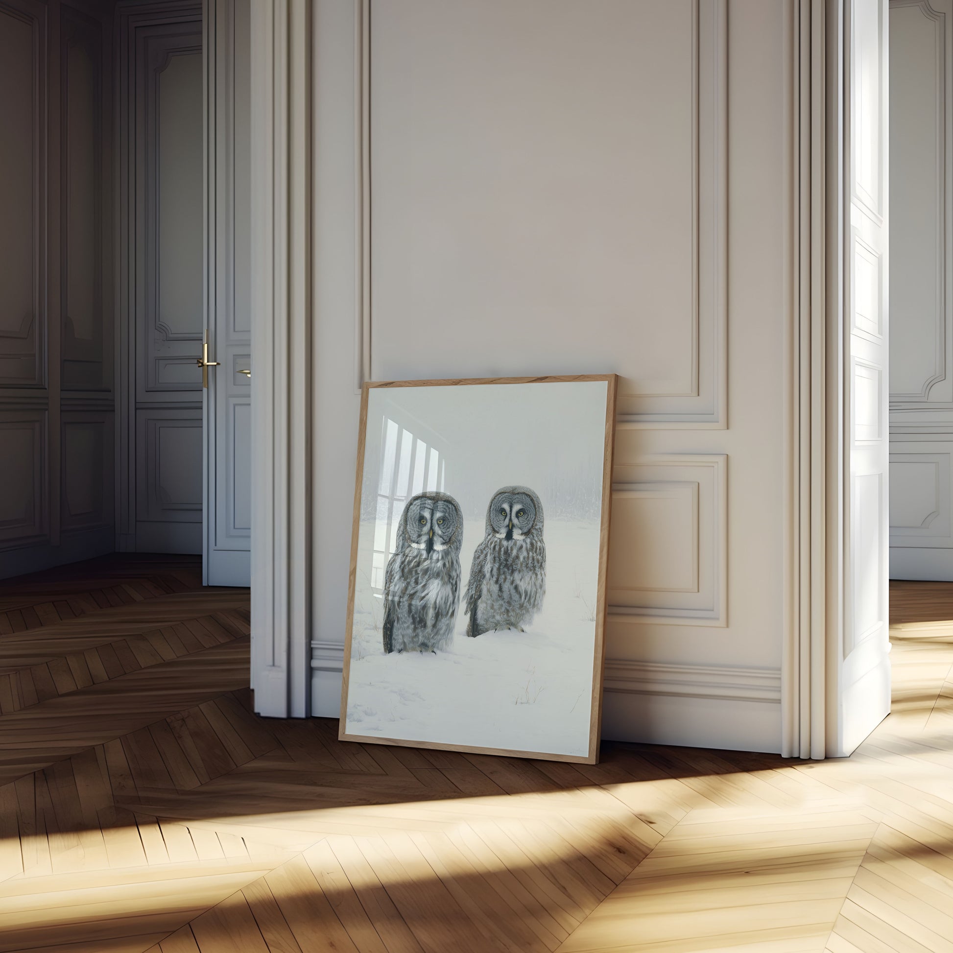 Capture the serene beauty of winter with this stunning portrait of two Great Grey Owls nestled in freshly fallen snow. These magnificent birds sit peacefully side by side, their striking yellow eyes and intricate grey and white plumage rendered in exquisite detail against a soft, snowy landscape. The composition evokes a sense of calm majesty and natural wonder, perfect for bringing the quiet elegance of Arctic wildlife into your home.