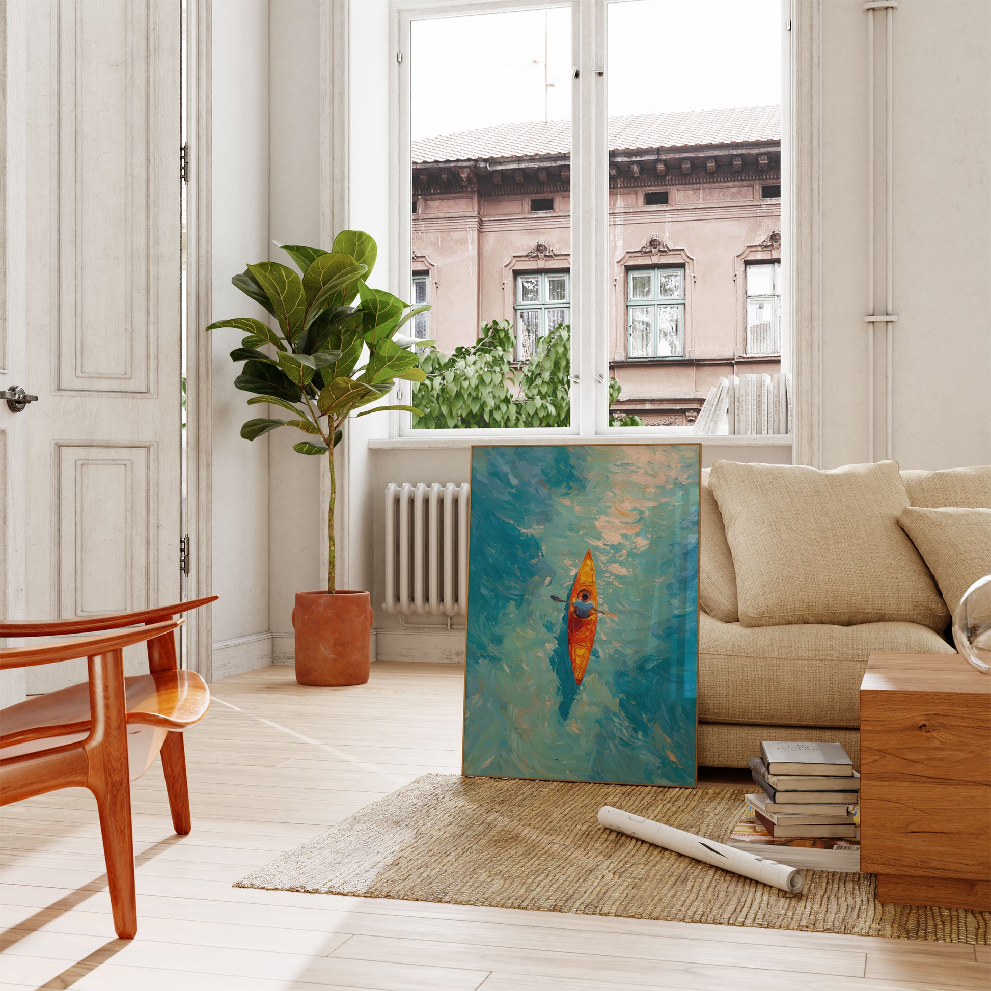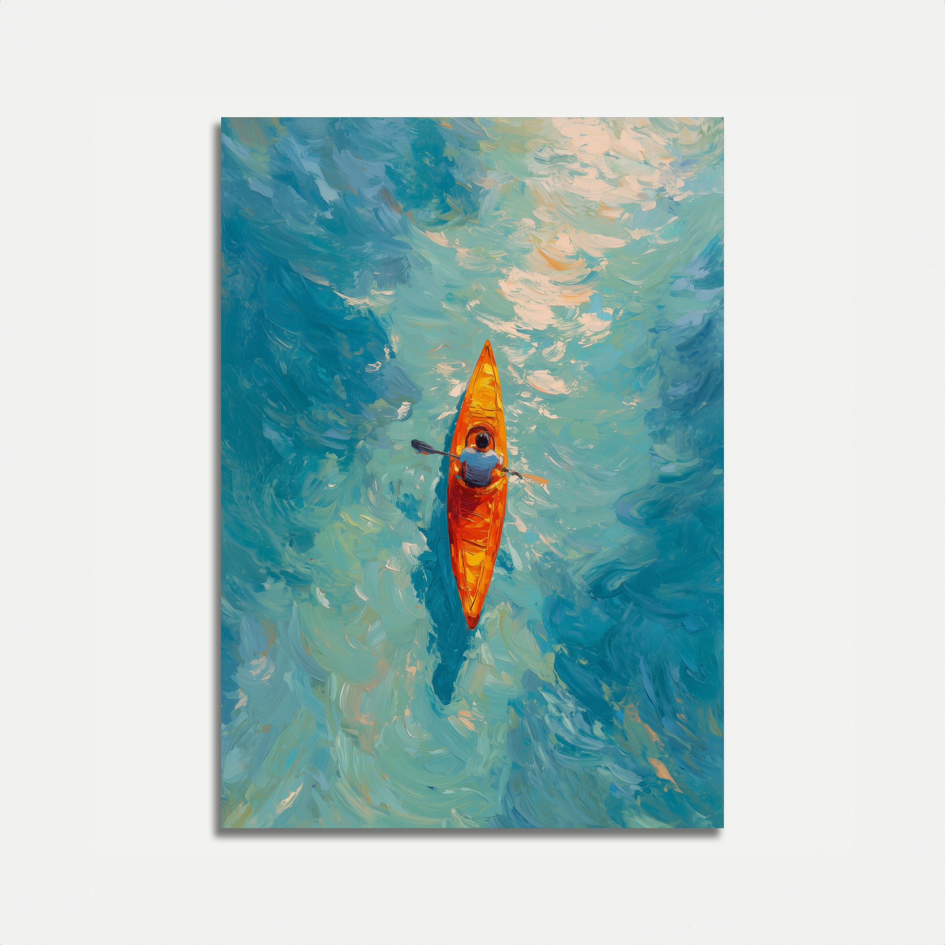 This stunning aerial view captures a lone kayaker paddling through crystal-clear turquoise waters in vibrant oils and acrylics. The bold orange kayak pops against the serene blue-green palette, creating a perfect contrast that draws your eye directly to the adventurous paddler. The painterly brushstrokes and dynamic water ripples evoke a sense of freedom, exploration, and peaceful solitude on the open water—ideal for anyone who loves outdoor adventure and water sports.