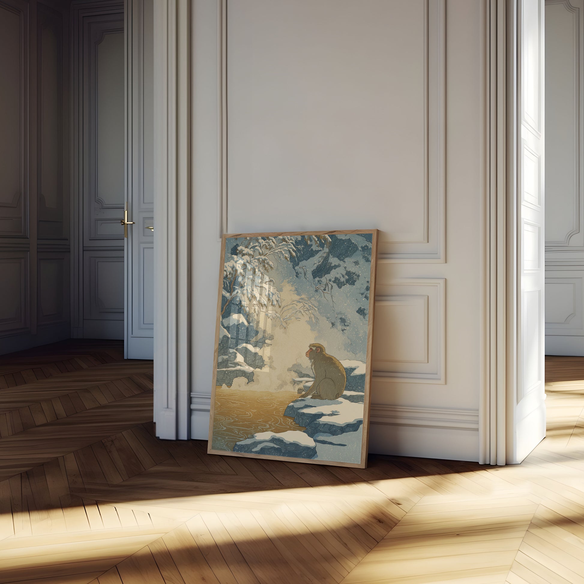 This serene winter landscape captures a solitary monkey sitting peacefully beside a steaming natural hot spring, surrounded by snow-laden trees and falling snow. The artwork masterfully blends warm golden tones of the mineral-rich water with cool blues and whites of the snowy forest, creating a tranquil and contemplative mood. The detailed illustration style and carefully balanced composition evoke a sense of quiet wonder and connection with nature, making it a perfect piece for those who appreciate wildlife, winter scenery, and peaceful moments of solitude.