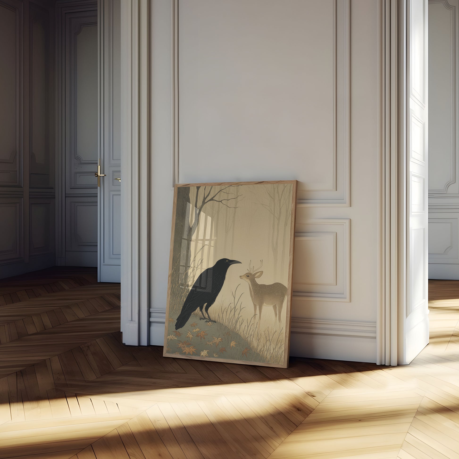 This beautifully illustrated forest scene captures a magical moment between a striking black raven and an elegant deer in an autumnal woodland setting. The muted earth tones and soft, misty background create a serene and contemplative atmosphere that draws you into nature's quiet drama. Golden fallen leaves scatter across the forest floor while bare trees stretch upward, creating a sense of stillness and connection between these two remarkable creatures in their natural habitat.