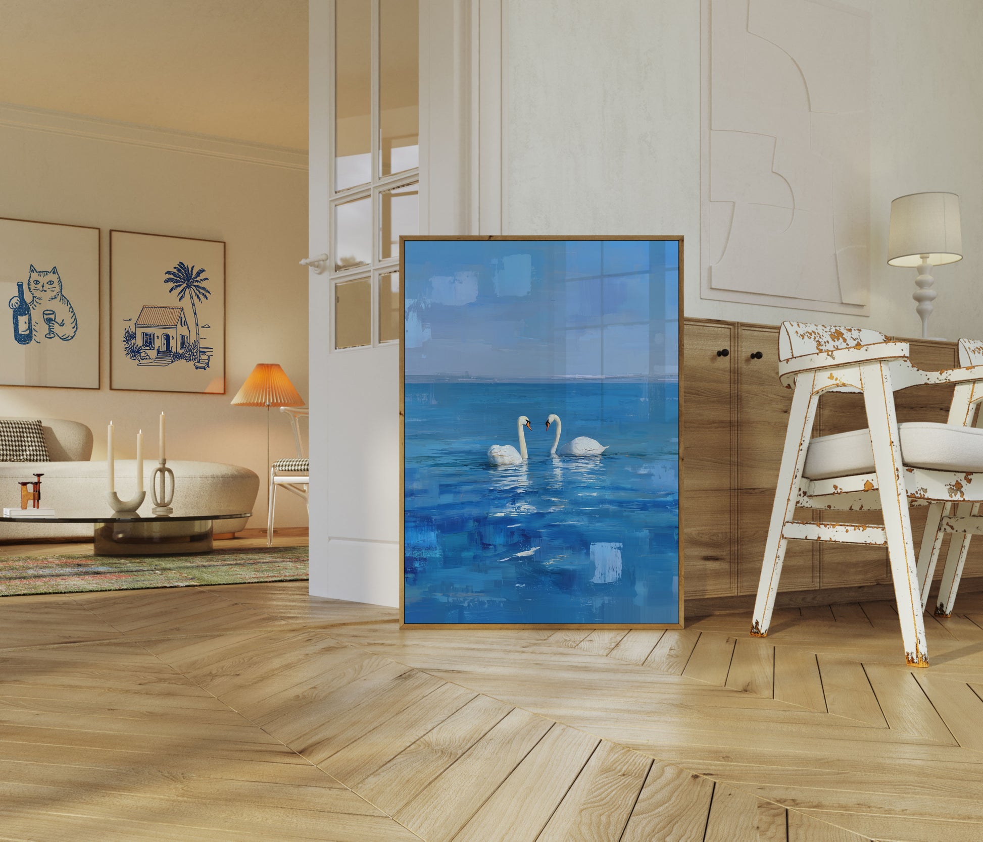 Two elegant white swans glide gracefully across a serene, multi-toned blue seascape, creating a mesmerizing portrait of tranquility and connection. Their curved necks form a subtle heart shape, symbolizing love and partnership against a dreamlike, textured background of azure and sapphire hues. This stunning artwork captures the ethereal beauty of these majestic birds in their natural aquatic environment.