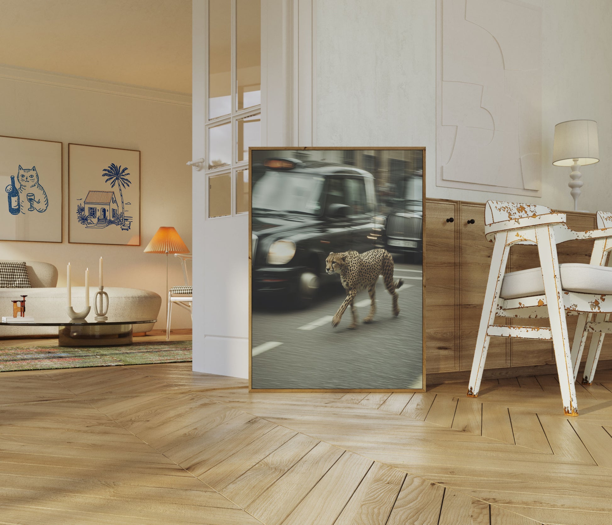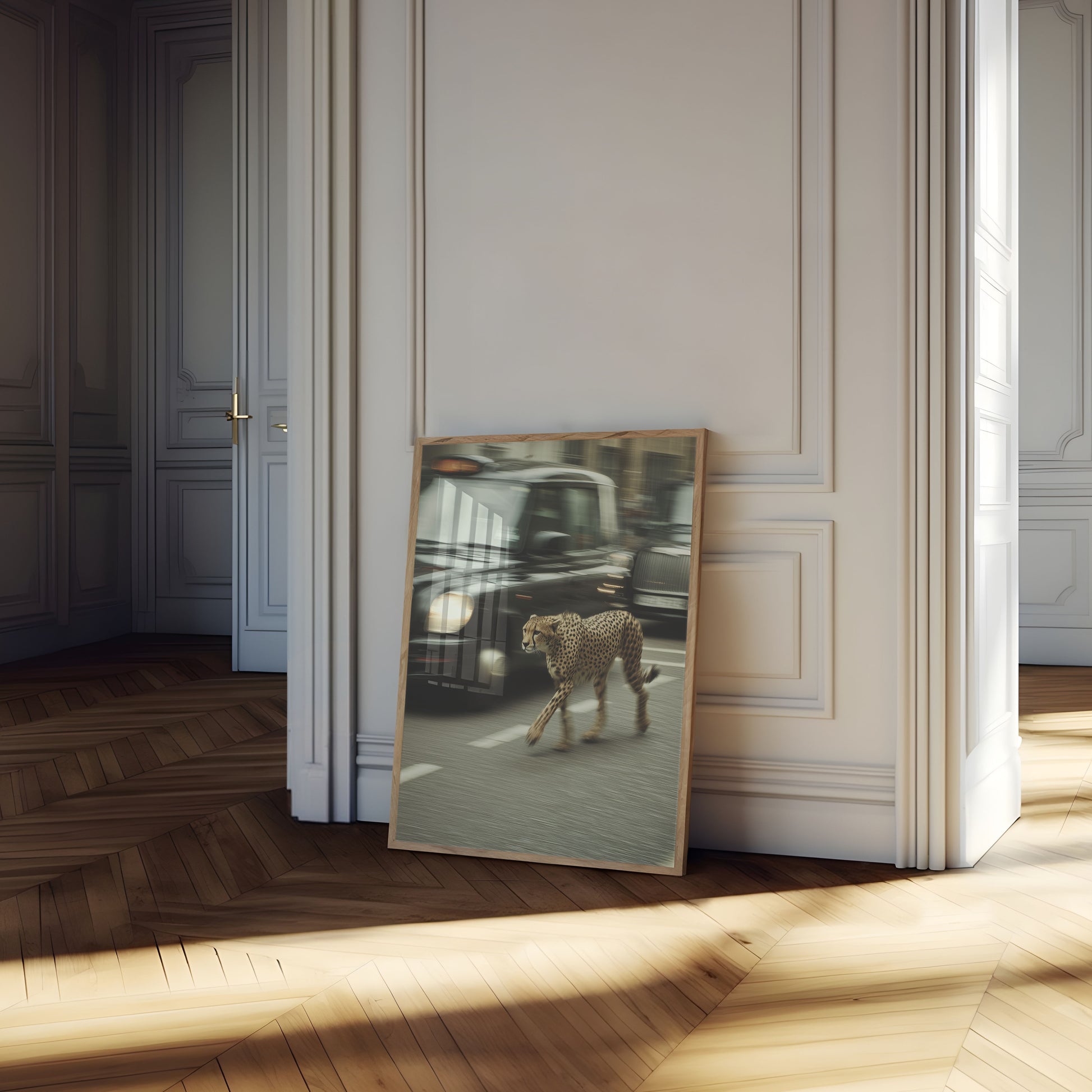 A stunning snapshot of raw power and motion, this poster captures a cheetah sprinting alongside a sleek black vehicle, blurring the lines between wildlife and urban landscape. The dynamic composition creates an electrifying sense of speed and tension, with the spotted predator moving with incredible grace against the motion-blurred background. An extraordinary visual that speaks to the wild heart beating within our structured, mechanical world.
