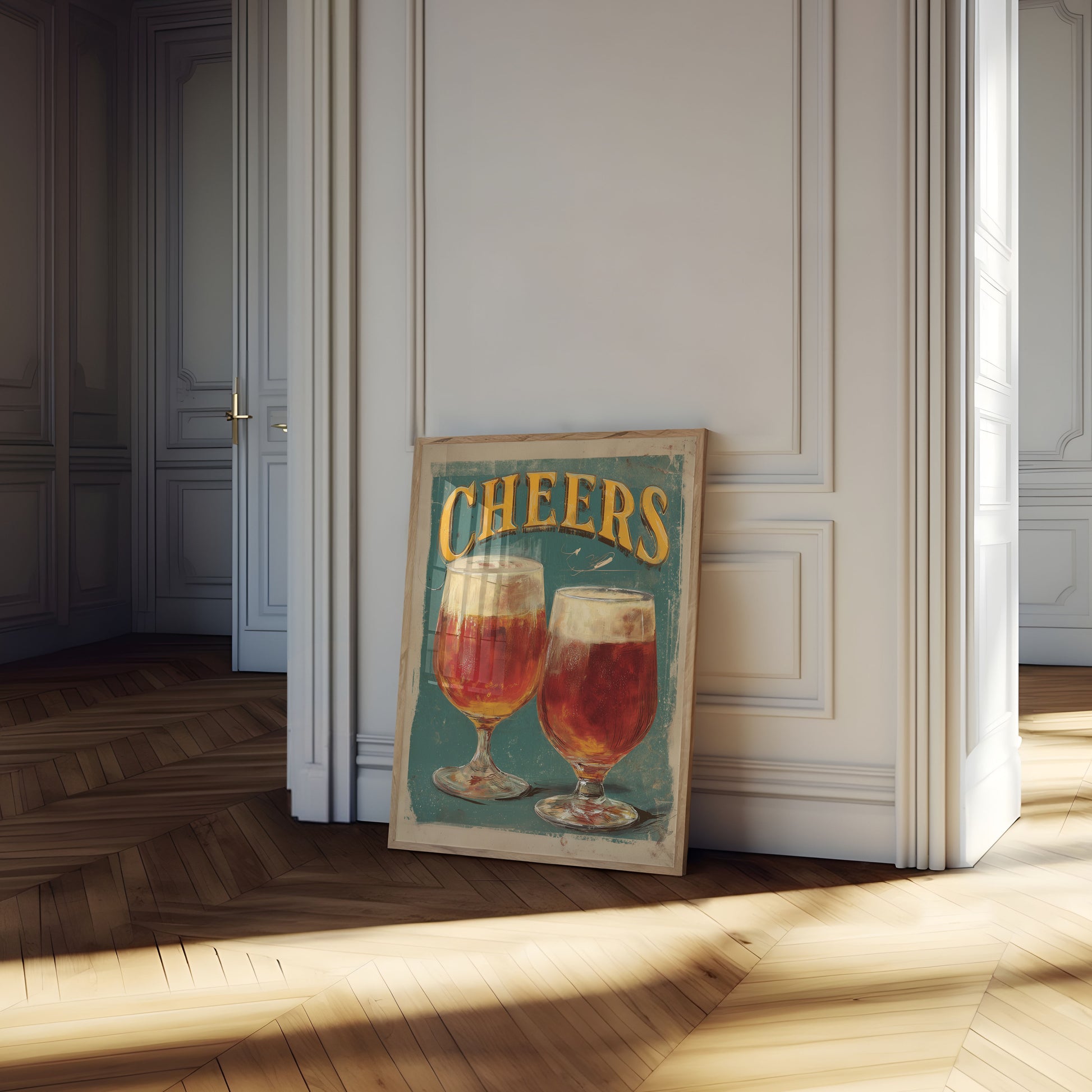 Raise a toast to classic charm with this stunning vintage beer poster featuring two perfectly crafted beer glasses against a rich teal background. The golden 'CHEERS' typography and warm amber beer tones create a nostalgic atmosphere that celebrates the art of brewing and social connection. This artful illustration captures the inviting essence of a perfectly poured beer, making it an ideal decor piece for home bars, kitchen spaces, or beer enthusiasts.